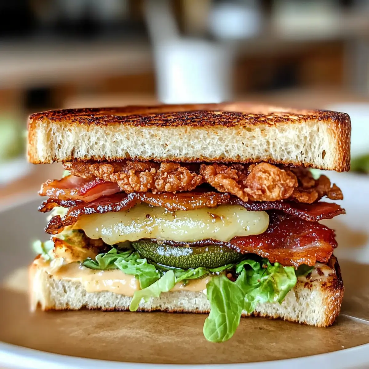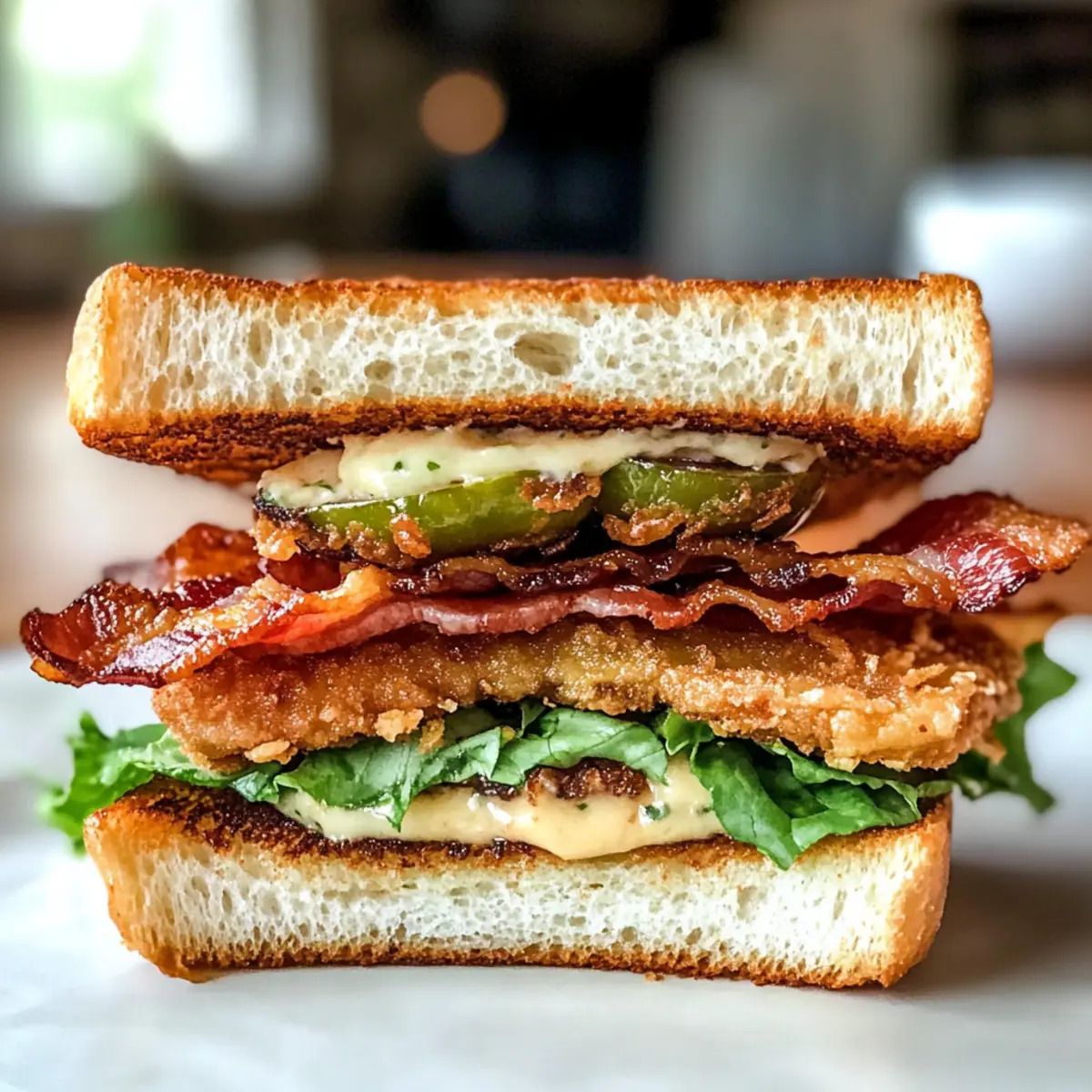 Röste das Brot leicht im Toaster oder in der Pfanne, um ein leicht krosses Element hinzuzufügen. Beginne mit einem Stück Brot, verteile die Spezialsauce darauf, lege eine Schicht frischen Salat und dann die knusprigen Tomaten gefolgt von dem gebratenen Speck darauf – das macht dein Knuspriges Frittiertes Grünes Tomaten-BLT-Sandwich perfekt.
