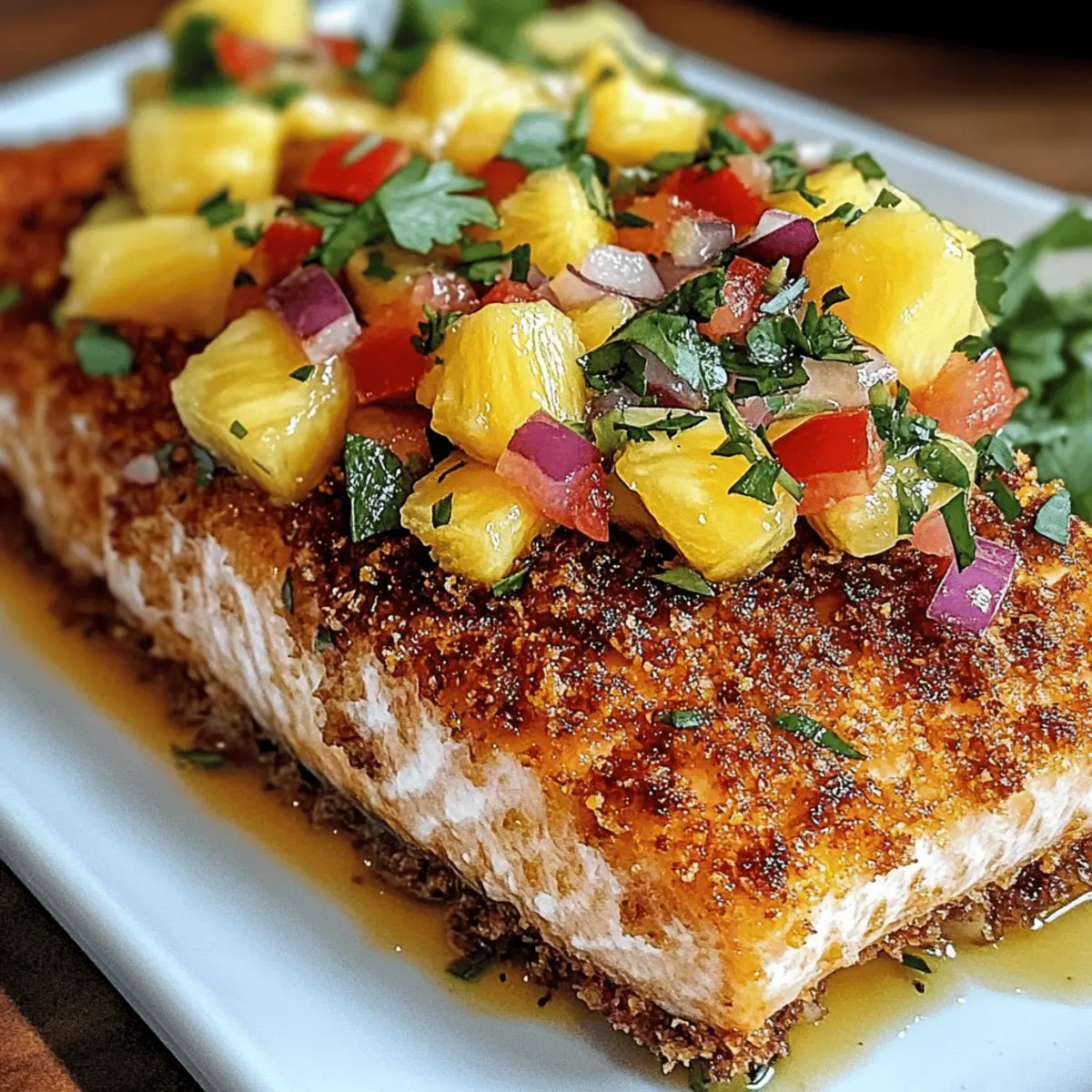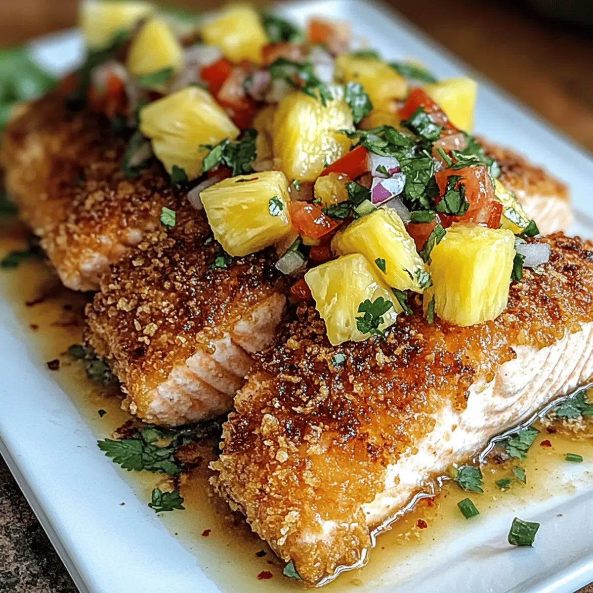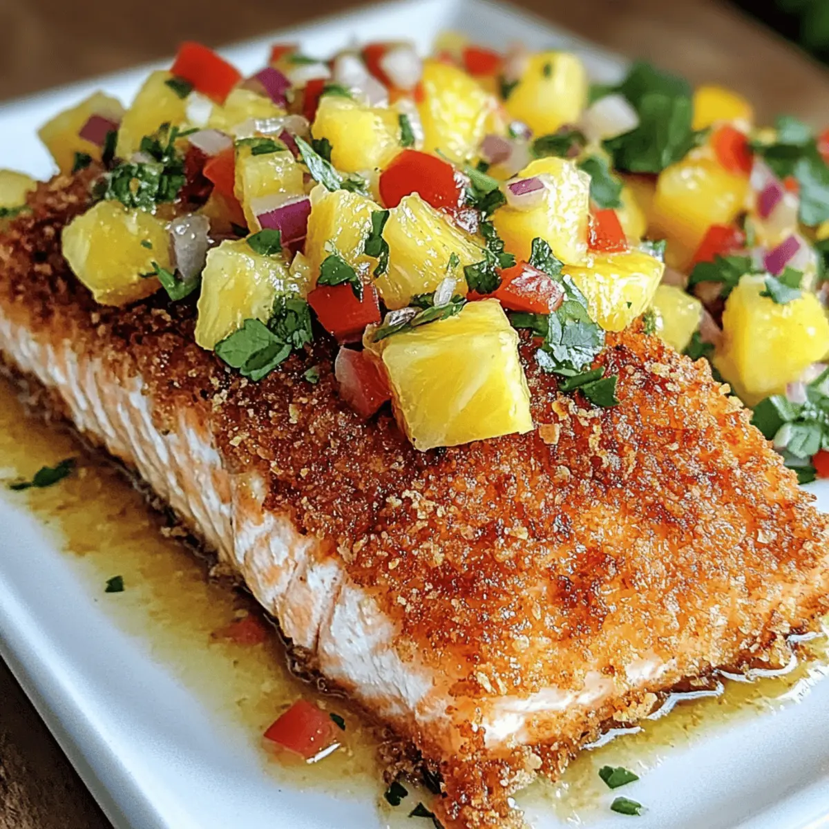Hast du schon einmal den Geschmack einer tropischen Insel in deinem eigenen Zuhause erlebt? Mit diesem Rezept für Kokosnusskruste Lachs mit Ananas Salsa bringst du einen Hauch von Karibik auf den Teller! Der zarte Lachs, umhüllt von einer knusprigen Kokosnusskruste und begleitet von einer frischen, fruchtigen Salsa, sorgt nicht nur für ein Festmahl, sondern ist auch einfach zuzubereiten und gesund. Dieses Gericht ist perfekt für stressige Wochentage sowie für besondere Anlässe – mit nur wenigen Zutaten zauberst du ein wahres kulinarisches Highlight. Bist du bereit, den Kochlöffel zu schwingen und in eine Welt voller Aromen einzutauchen? Warum solltest du dieses Rezept ausprobieren? Einfachheit: Die Zubereitung ist kinderleicht und benötigt nur grundlegende Kochfähigkeiten, sodass jeder, egal ob Anfänger oder Profi, mithalten kann. Gesundheitlich vorteilhaft: Mit gesunden Fetten und Proteinen ist der Lachs nicht nur lecker, sondern auch nahrhaft. Eine großartige Option für eine ausgewogene Ernährung! Frischer Geschmack: Die Kombination aus knuspriger Kokosnusskruste und der fruchtige Ananas Salsa sorgt für ein Geschmacksfeuerwerk, das dich sofort in Urlaubsstimmung versetzt. Vielseitigkeit: Du kannst das Rezept nach Belieben abwandeln, zum Beispiel mit Tofu für eine pflanzliche Variante oder glutenfreien Panko für eine glutenfreie Option. Schnell und unkompliziert: Ob zum Abendessen an einem Wochentag oder für eine Dinnerparty, dieses Gericht lässt sich schnell und effizient zubereiten. Wenn du auch die Aromen von Gurkensalat Mit Garnelen oder Ofenkartoffeln Mit Gruenem magst, wirst du dieses Rezept lieben! Kokosnusskruste Lachs mit Ananas Salsa Zutaten • Hier findest du alles, was du benötigst, um diesen köstlichen Kokosnusskruste Lachs zuzubereiten! Für den Lachs Lachsfilets – Hauptproteinquelle, reich an Omega-3-Fettsäuren für die Herzgesundheit. Ungesüßete Kokosraspeln – Fügt Süße und einen einzigartigen Crunch hinzu; liefert gesunde Fette und Ballaststoffe. Panko-Brösel – Sorgt für eine leichte, knusprige Textur; kann mit glutenfreiem Panko für eine glutenfreie Option ersetzt werden. Allzweckmehl – Dient als Basis für die Panade; hilft, die Ei-Wäsche am Lachs haften zu lassen. Große Eier – Bindet die Beschichtung am Lachs für eine bessere Kruste. Salz und Pfeffer – Grundgewürze, um den Geschmack zu verstärken. Kokosöl (oder Olivenöl) – Wird zum Braten oder zum Beträufeln beim Backen verwendet; je nach Geschmackspräferenz wählen. Für die Ananas Salsa Frische Ananas – Schlüsselzutat für die Salsa; sorgt für Süße und natürliche Säure, die das Gericht ausbalanciert. Rote Paprika – Fügt Farbe und Crunch zur Salsa hinzu; milde Geschmacksanreicherung. Rote Zwiebel – Sorgt für Schärfe und Tiefe in der Salsa; kann je nach Geschmack angepasst werden. Jalapeño – Bietet eine milde Schärfe; optional je nach Würzetoleranz. Limettensaft – Fügt Frische hinzu; kann mit Zitronensaft ersetzt werden. Frischer Koriander – Verstärkt den Geschmack der Salsa mit krautigen Noten; kann weggelassen werden, falls nicht gewünscht. Viel Spaß beim Zubereiten deines Kokosnusskruste Lachs mit Ananas Salsa! Schritt-für-Schritt-Anleitung für Kokosnusskruste Lachs mit Ananas Salsa Step 1: Ananas Salsa zubereiten Schneide die frische Ananas, die rote Paprika, die rote Zwiebel und optional die Jalapeño in kleine Würfel und gib sie in eine Schüssel. Presse den Saft von einer Limette darüber und füge frischen Koriander hinzu. Mit einer Prise Salz abschmecken und alles gut vermischen. Lasse die Salsa für 15-20 Minuten stehen, damit sich die Aromen entfalten können und die Geschmackskombination perfekt wird. Step 2: Ofen oder Pfanne vorheizen Heize den Ofen auf 200°C (400°F) vor, wenn du den Lachs backen möchtest. Alternativ kannst du eine Pfanne verwenden: Erhitze zwei Esslöffel Kokosöl in einer großen Pfanne bei mittlerer Hitze. Das Öl sollte heiß genug sein, dass es leicht zischt, wenn du den Lachs hineinlegst, aber nicht rauchen. Step 3: Station für die Panade einrichten Bereite eine Panierstation vor, indem du drei flache Schalen bereitstellst. Fülle die erste mit Allzweckmehl, die zweite mit den geschlagenen Eiern und die dritte mit einer Mischung aus ungesüßten Kokosraspeln und Panko-Bröseln. Diese Anordnung sorgt für ein effizientes Panieren des Lachses und hilft, eine knusprige Kokosnusskruste zu erzielen. Step 4: Den Lachs panieren Nimm die Lachsfilets und tupfe sie mit Küchenpapier trocken, um eine bessere Haftung der Panade zu gewährleisten. Wende jedes Filet zuerst im Mehl, tauche es dann in die Eier und schließlich in die Kokos-Panko-Mischung. Drücke leicht, damit die Panade gut am Lachs haftet und eine schöne goldene Kruste entsteht. Step 5: Lachs garen Lege die panierten Lachsfilets je nach der gewählten Zubereitungsmethode auf ein mit Backpapier ausgelegtes Backblech oder in die vorgeheizte Pfanne. Wenn du den Lachs backst, lasse ihn ca. 12-15 Minuten garen, bis die Kruste goldbraun ist und der Lachs durchgegart ist. Für die Pfanne brate die Filets etwa 4-5 Minuten pro Seite, bis sie schön goldbraun und knusprig sind. Step 6: Anrichten und Servieren Wenn der Lachs fertig ist, nimm ihn aus dem Ofen oder der Pfanne und lege die Filets auf einen Servierteller. Toppe die knusprigen Lachse großzügig mit der vorbereiteten Ananas Salsa. Du kannst das Gericht optional mit gedämpftem Jasminreis oder einem frischen grünen Salat servieren, um eine ausgewogene Mahlzeit zu kreieren. Meal Prep für Kokosnusskruste Lachs mit Ananas Salsa Dieses Rezept für Kokosnusskruste Lachs mit Ananas Salsa ist ideal für vielbeschäftigte Köche, die Zeit sparen möchten! Du kannst die Ananas Salsa bis zu 3 Tage im Voraus zubereiten und im Kühlschrank aufbewahren, was den Geschmack intensiviert. Stelle sicher, dass du sie in einem luftdichten Behälter lagerst, um die Frische zu bewahren. Die Lachsfilets kannst