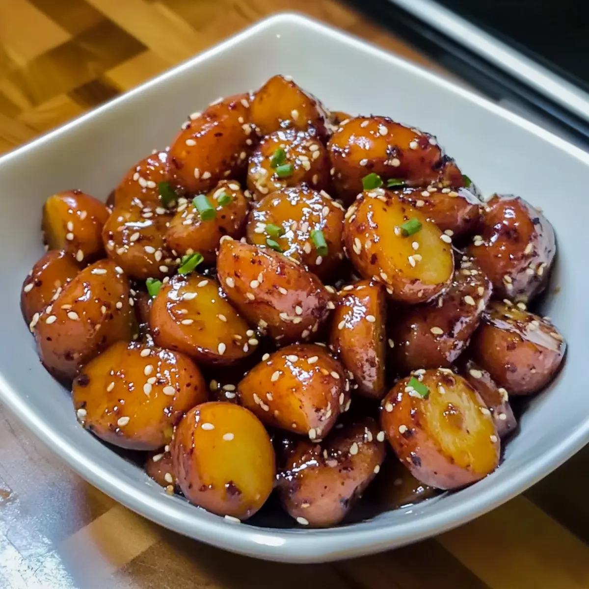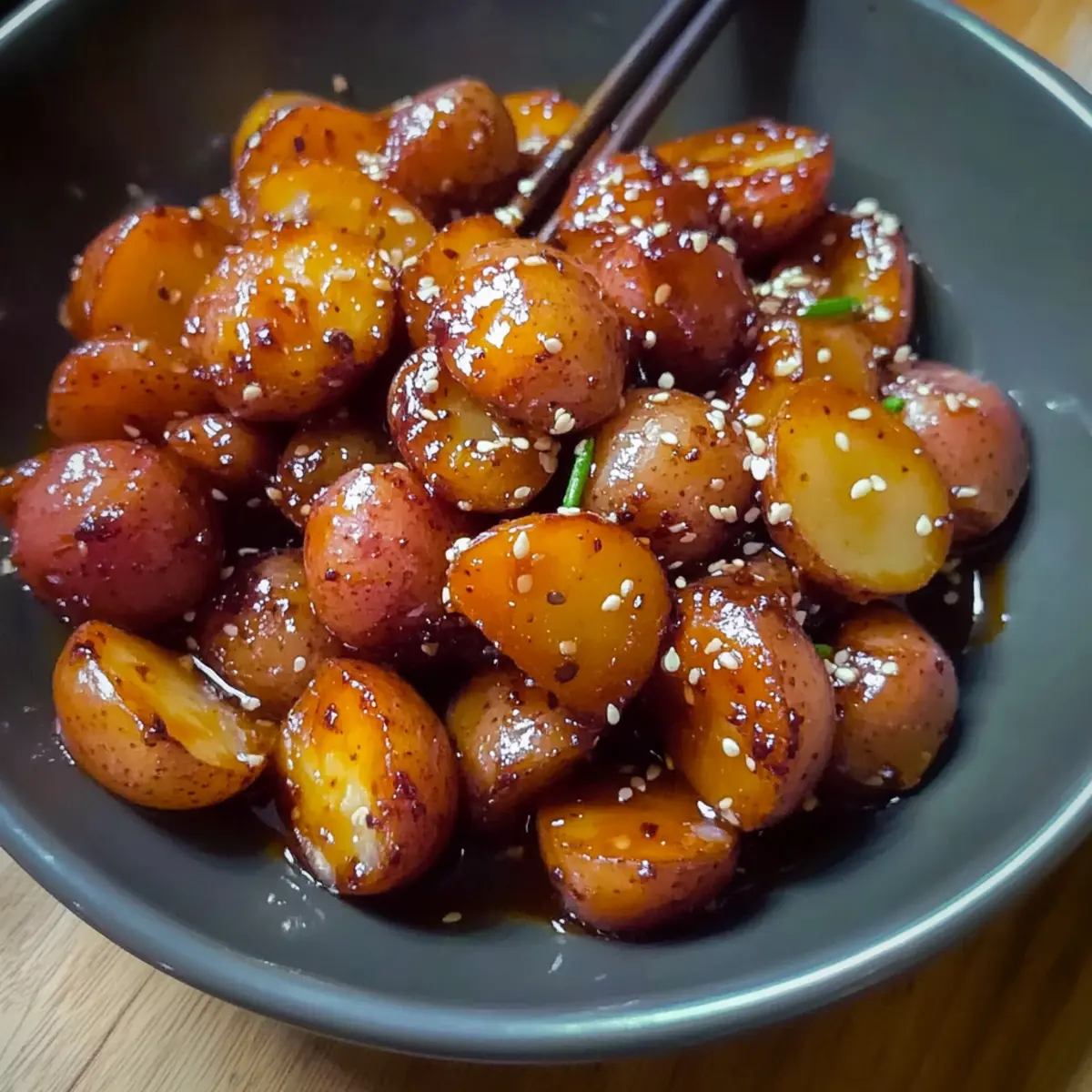 6. Überprüfe die Kartoffeln auf Zartheit und serviere sie warm, mit geröstetem Sesam bestreut.