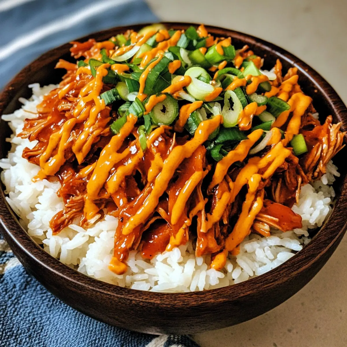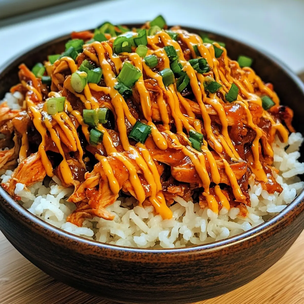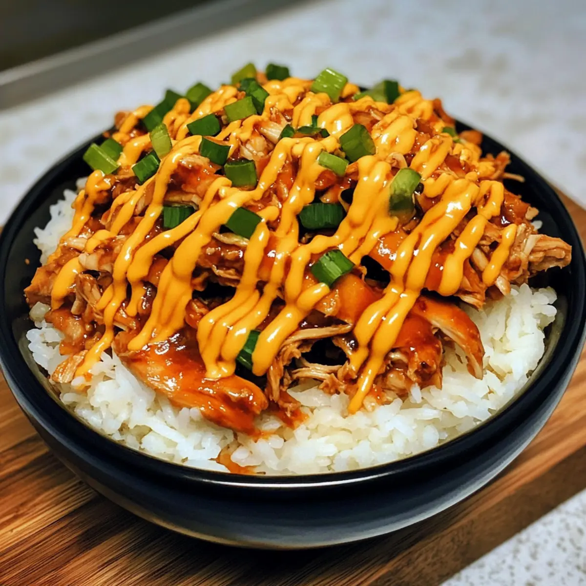 7. Reis gleichmäßig auf Schüsseln aufteilen, das zerkleinerte Hähnchen und Sauce darauf geben, mit spicy korean mayo beträufeln.