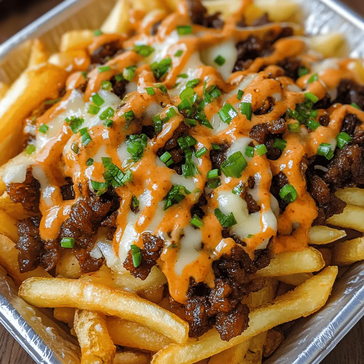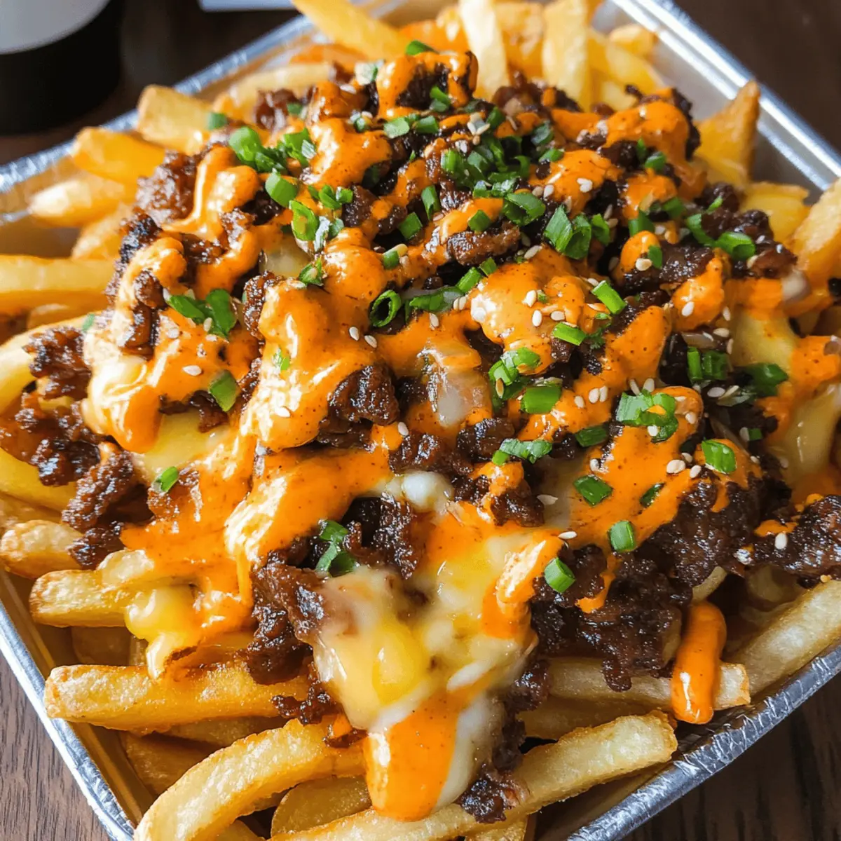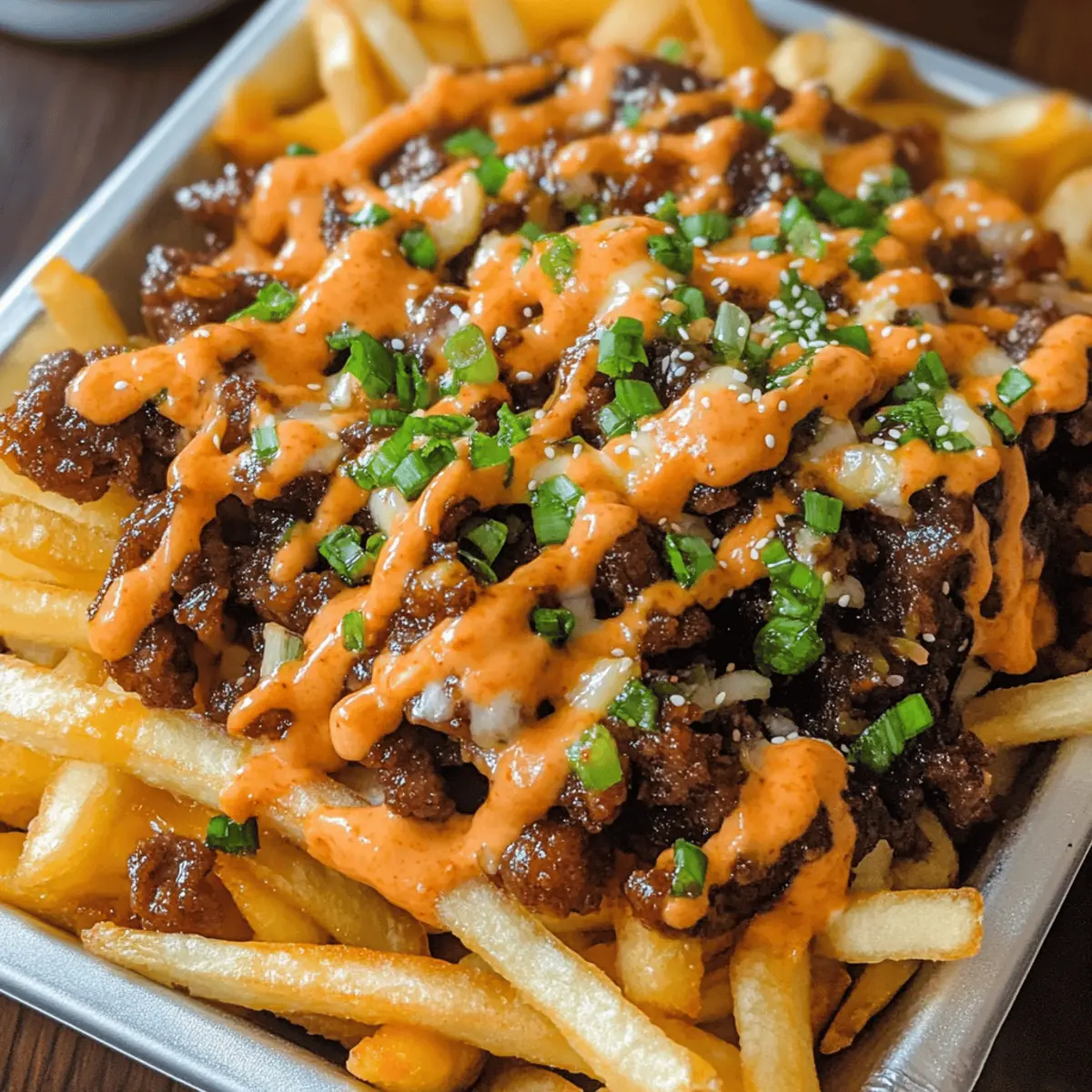 Vielseitigkeit: Diese Koreanisch inspirierten geladenen Pommes sind ein absolutes Geschmackserlebnis und können ganz nach deinem persönlichen Geschmack angepasst werden. Einfachheit: Die Zubereitung ist unkompliziert, sodass auch weniger erfahrene Köche mit Leichtigkeit mitwirken können. Fülle der Aromen: Das Zusammenspiel von saftigem Bulgogi-Rindfleisch und der würzigen Gochujang-Sauce sorgt für eine aufregende Geschmacksexplosion, die sowohl Jung als auch Junggebliebene begeistert. Perfekte Präsentation: Serviert auf einem rustikalen Brett oder in einer gusseisernen Pfanne, sind sie ein echter Hingucker und ideal zum Teilen! Probiere auch meine Karamellisierte Zwiebeln für noch mehr Tiefe in diesem Rezept.