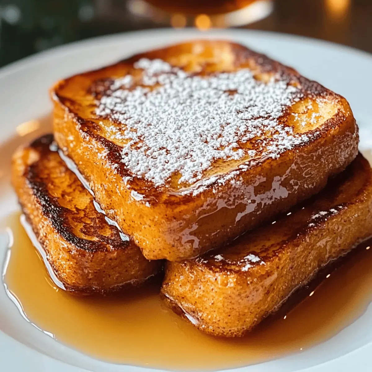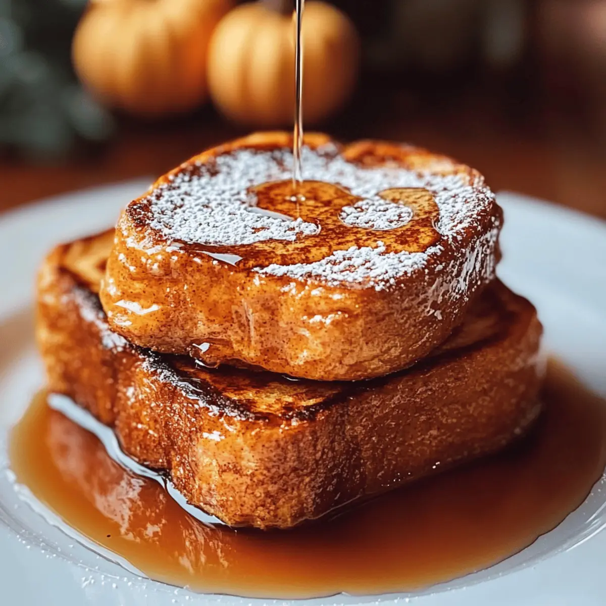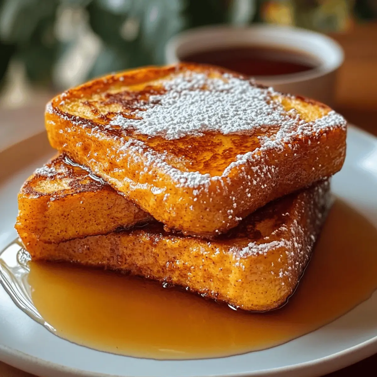 Wenn der Herbst naht und die Blätter in warmen Goldtönen erstrahlen, ist es Zeit für ein Frühstück, das ebenso einladend und gemütlich ist wie die Jahreszeit selbst. Mein Kürbis French Toast Frühstück bringt die wundervollen Aromen des Herbstes direkt auf Ihren Tisch und verwandelt jede Morgendämmerung in ein kleines Fest. Mit seiner flauschigen Textur und dem schmackhaften Kürbis-Teig ist dieses Gericht nicht nur im Handumdrehen zubereitet, sondern auch der perfekte Seelenwärmer für die kühler werdenden Tage. Ob für ein schnelles Frühstück unter der Woche oder ein entspanntes Brunch am Sonntag – dieses Rezept begeistert garantiert alle! Seid ihr bereit, eure Küche in ein herbstliches Paradies zu verwandeln? Warum lieben Sie dieses Rezept? Einfachheit: Die Zubereitung ist kinderleicht und erfordert nur grundlegende Kochfähigkeiten – ideal für alle, die schnell ein köstliches Frühstück zaubern möchten. Wärmender Geschmack: Der Mix aus Kürbis, Gewürzen und einem Hauch von Vanille verwandelt jedes Stück in einen herbstlichen Genuss. Vielseitigkeit: Ob als schnelles Frühstück oder bei einem gemütlichen Brunch, dieser Kürbis French Toast macht immer Eindruck. Schnell zubereitet: In weniger als 30 Minuten haben Sie ein aufregendes Gericht, das Ihrer Familie und Freunden schmeichelt. Für weitere köstliche Rezepte, werfen Sie einen Blick auf unsere anderen herbstlichen Frühstücksideen – sie werden es lieben! Kürbis French Toast Frühstück Zutaten • Für den Teig: Dicke Scheiben Brot – 4 Stück, verwenden Sie Brioche oder Challah für die perfekte Textur. Kürbispüree – 1 Tasse, fügt Geschmack und Feuchtigkeit hinzu; frisch oder aus der Dose ist beides möglich. Eier – 2 große, verbinden die Zutaten und sorgen für die richtige Konsistenz. Milch – 1 Tasse, sorgt für Cremigkeit; pflanzliche Alternativen sind ebenfalls geeignet. Vanilleextrakt – 1 Teelöffel, hebt den gesamten Geschmack hervor. Gemahlener Zimt – 1 Teelöffel, gibt Wärme und Würze; auch Kürbiskuchengewürz kann verwendet werden. Gemahlene Muskatnuss – 1/2 Teelöffel, trägt zum herbstlichen Geschmack bei. Gehackter Ingwer – 1/4 Teelöffel, fügt eine würzige Note hinzu. Salz – 1/4 Teelöffel, balanciert die Süße. Brauner Zucker – 2 Esslöffel, optional für mehr Süße; passen Sie nach Belieben an. • Zum Braten: Butter oder Öl – für den Kochprozess; Butter für einen reichhaltigen Geschmack, Öl für eine leichtere Option. • Zum Servieren: Ahornsirup – verstärkt die Süße. Puderzucker & gehackte Nüsse (optional) – für eine dekorative Garnitur und zusätzliche Textur. Mit diesen Zutaten können Sie ein köstliches Kürbis French Toast Frühstück zubereiten, das perfekt für die Herbstsaison geeignet ist und garantiert alle begeistert! Schritt-für-Schritt-Anleitung für Kürbis French Toast Frühstück Step 1: Teig zubereiten In einer Schüssel verquirlen Sie das Kürbispüree, die Eier und die Milch, bis die Mischung cremig und glatt ist. Dies dauert etwa 2-3 Minuten. Achten Sie darauf, dass keine Klumpen zurückbleiben, da dies die Textur des Kürbis French Toast Frühstücks beeinflusst. Step 2: Gewürze hinzufügen Fügen Sie nun Vanilleextrakt, Zimt, Muskatnuss, Ingwer, Salz und optional den braunen Zucker hinzu. Vermischen Sie alles noch einmal gründlich mit dem Schneebesen für etwa 1-2 Minuten, bis die Gewürze gut integriert sind und die Mischung angenehm duftet. Step 3: Teig ruhen lassen Lassen Sie den Teig für etwa 5 Minuten stehen, während Sie die Kochfläche vorbereiten. Dies gibt der Mischung die Zeit, um die Aromen voll zur Geltung zu bringen und macht das Kürbis French Toast Frühstück noch geschmackvoller. Step 4: Pfanne erhitzen Erhitzen Sie eine große Pfanne oder eine beschichtete Bratpfanne auf mittlerer Hitze. Fügen Sie einen Esslöffel Butter oder Öl hinzu und warten Sie, bis es vollständig geschmolzen ist und anfängt, leicht zu brutzeln. Dies zeigt, dass die Temperatur ideal für das Braten des Brotes ist. Step 5: Brot eintauchen Tauchen Sie jedes Stück Brot vollständig in den Kürbis-Teig und achten Sie darauf, dass beide Seiten gut benetzt sind. Lassen Sie überschüssigen Teig abtropfen, damit das Brot nicht zu feucht ist, was das Braten erschwert und das Endergebnis beeinträchtigen könnte. Step 6: Brot braten Legen Sie die getränkten Brotscheiben vorsichtig in die heiße Pfanne. Braten Sie sie für etwa 3-4 Minuten auf jeder Seite, bis sie goldbraun und leicht knusprig sind. Die richtige Garzeit ist entscheidend, um eine perfekte Textur für Ihr Kürbis French Toast Frühstück zu erreichen. Step 7: Servieren Sobald das Brotpaar auf beiden Seiten goldbraun ist, nehmen Sie es aus der Pfanne und stapeln Sie die Scheiben auf einem Teller. Träufeln Sie großzügig Ahornsirup darüber und fügen Sie optional Puderzucker und gehackte Nüsse als Garnitur hinzu, um das herbstliche Gefühl zu unterstreichen. Aufbewahrungstipps für Kürbis French Toast Frühstück Raumtemperatur: Genießen Sie den Kürbis French Toast frisch zubereitet. Bei Raumtemperatur kann er jedoch bis zu 1 Stunde warm gehalten werden. Kühlschrank: Lagern Sie Reste im Kühlschrank in einem luftdichten Behälter für bis zu 3 Tage. Vor dem Verzehr einfach kurz in der Mikrowelle oder im Toaster aufwärmen. Gefrierschrank: Diese köstlichen Stücke können bis zu 3 Monate eingefroren werden. Legen Sie sie in einen Gefrierbeutel, um Geschmack und Textur zu bewahren. Zum Auftauen über Nacht im Kühlschrank lagern. Wiedererwärmen: Für das beste Ergebnis den gefrorenen Kürbis French Toast im Toaster oder im Backofen (bei 180 °C) aufwärmen, bis er knusprig und durchwärmt ist. Zeit sparen mit Kürbis French Toast Frühstück Dieses Kürbis French Toast Frühstück ist nicht nur eine köstliche Wahl, sondern auch perfekt für die Vorbereitung im Voraus! Sie können den Teig bis 24 Stunden im Voraus zubereiten und im Kühlschrank aufbewahre