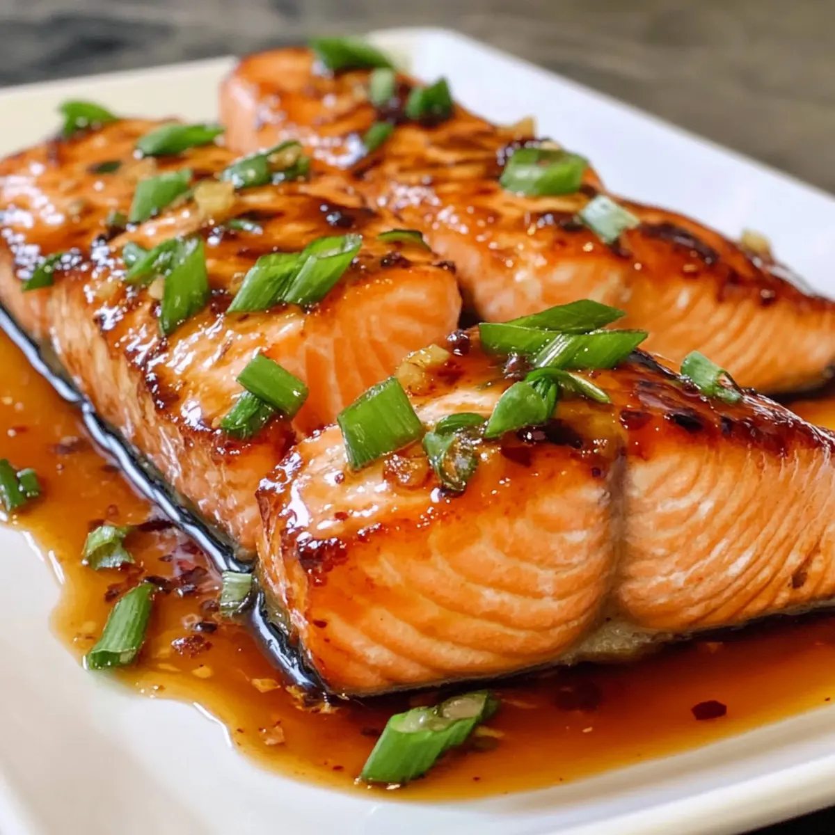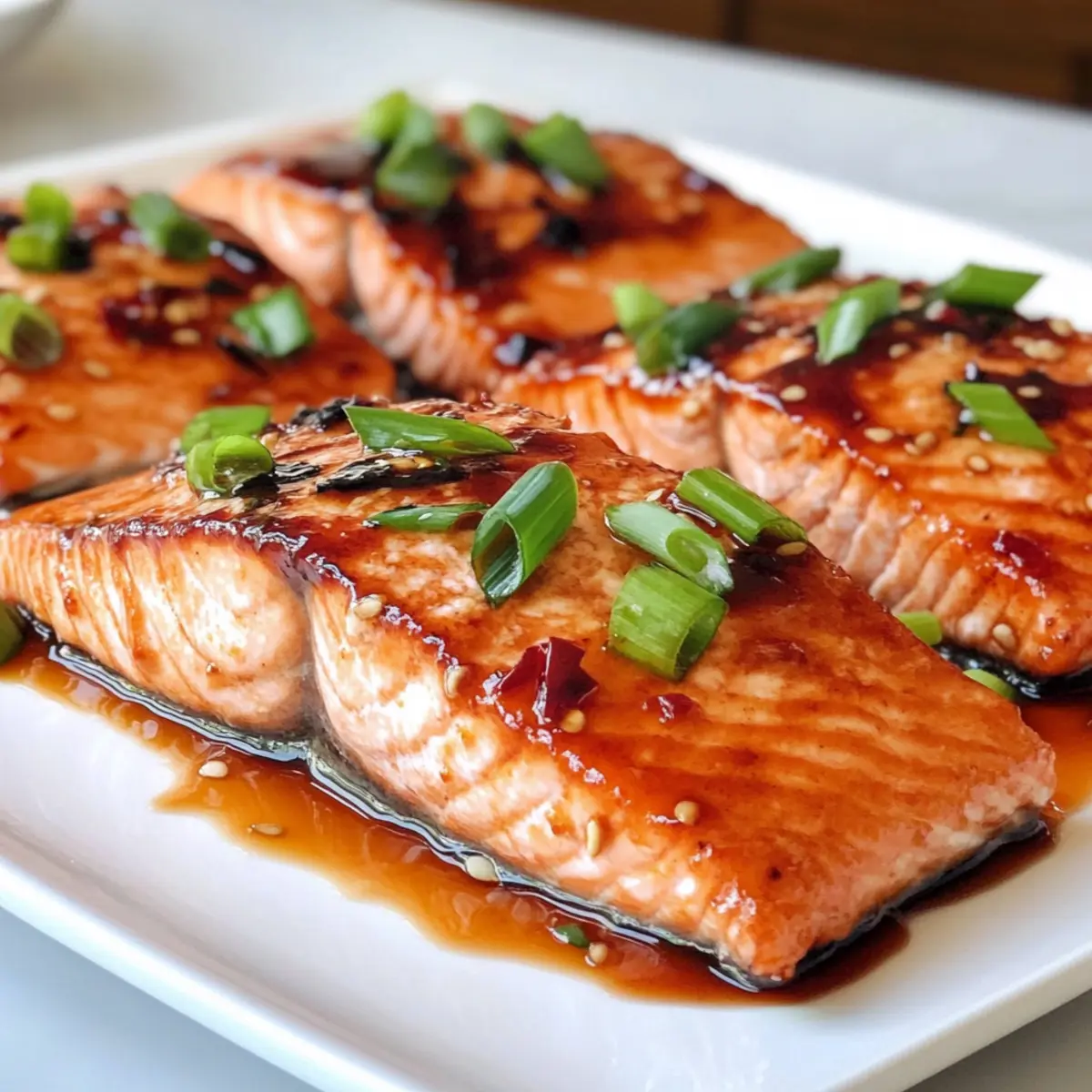 Nehme den Lachs aus dem Ofen und serviere ihn sofort mit der reservierten Marinade und einer Garnitur aus dünn geschnittenen Frühlingszwiebeln. Die frischen Zwiebeln bringen Farbe und einen zusätzlichen Geschmackskick in dein Gericht. Genieße dein köstliches Lachs mit thailändischer süßer Chili-Glasur!