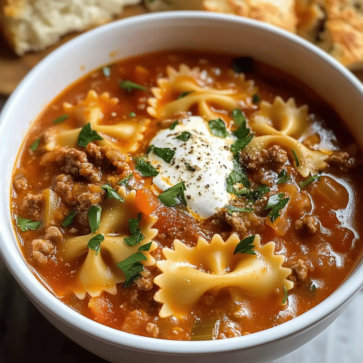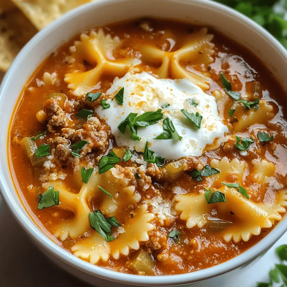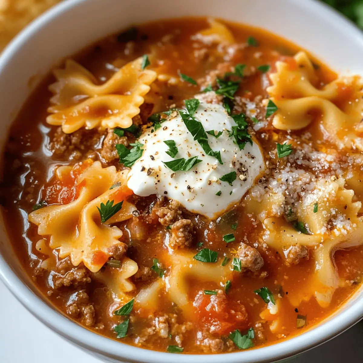 Genieße die köstliche Lasagne-Suppe mit Fliegenblatt-Pasta – perfekt für gemütliche Abende und hektische Wochentage.