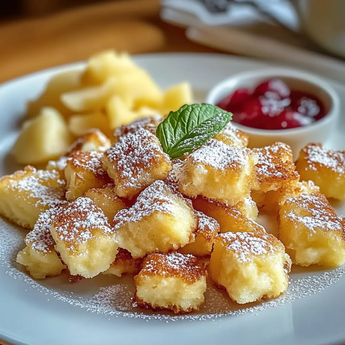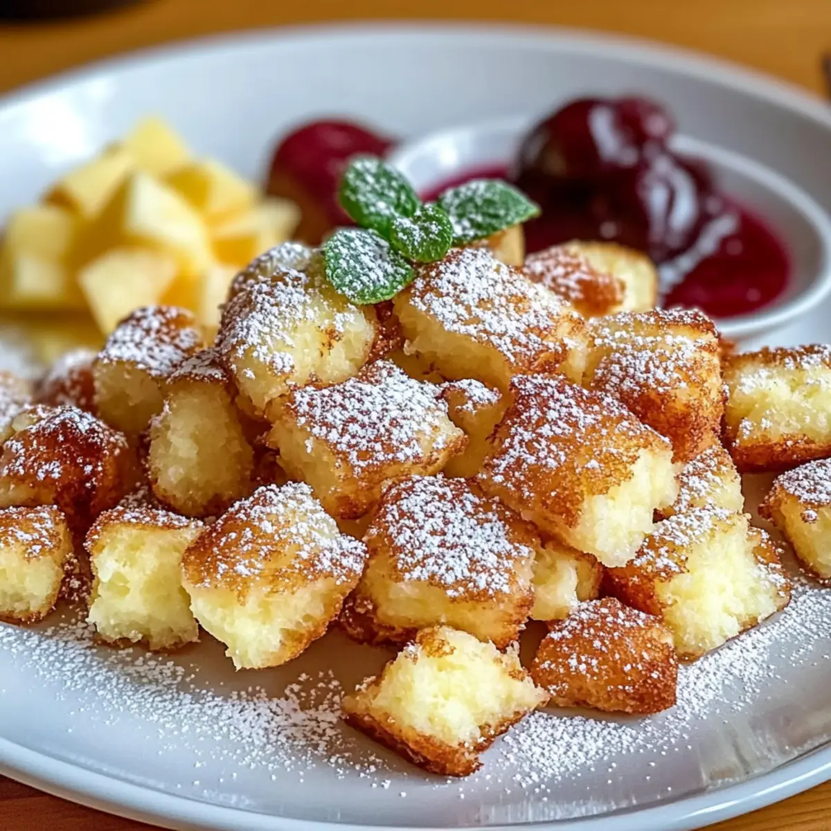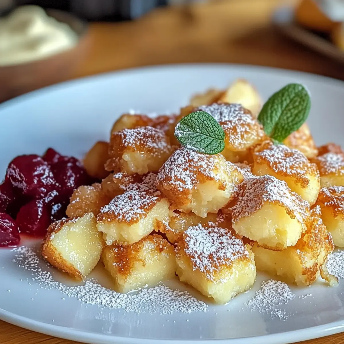 Ein leichter Duft von frisch gebackenem Teig umweht die Küche, während der Hochgenuss eines traditionellen Kaiserschmarrn auf dem Herd brutzelt. Dieser köstliche, österreichische Klassiker verwandelt einfache Zutaten in ein himmlisches Dessert, das nicht nur den Gaumen verwöhnt, sondern auch die Herzen erwärmt. Mit nur wenigen Schritten kannst du diesen fluffigen Kaiserschmarrn einfach zubereiten und ihn nach Belieben mit Nüssen, Schokolade oder frischen Früchten verfeinern. Der Clou ist, dass er nicht nur schnell zubereitet ist, sondern auch ein perfektes Comfort Food bietet, das bei jeder Gelegenheit begeistert. Bist du bereit, in die Welt des Kaiserschmarrns einzutauchen und deine Freunde und Familie mit diesem unwiderstehlichen Dessert zu überraschen? Warum ist Kaiserschmarrn so beliebt? Einfachheit ist King: Der Kaiserschmarrn ist unkompliziert und benötigt die grundlegenden Kochfähigkeiten – ideal für Anfänger und erfahrene Köche. Vielseitigkeit pur: Egal, ob du Nüsse, Schokolade oder Früchte hinzufügen möchtest, du kannst das Rezept nach deinem Geschmack anpassen und personalisieren. Himmlischer Genuss: Die fluffig-karamellisierten Stücke werden mit Puderzucker bestäubt und harmonieren perfekt mit Apfelmus oder Zwetschgenröster. Schnell zubereitet: In nur wenigen Schritten zauberst du einen köstlichen Nachtisch, der dich und deine Liebsten begeistert. Beeindruckender Crowd-Pleaser: Dieser traditionelle Klassiker ist das perfekte Comfort Food für jede Gelegenheit – ob Kaffeekränzchen oder festliches Dinner! Teste auch unsere Rhabarber Scones Zubereiten oder Herzhafter Quark Einfach für mehr leckere Ideen! Kaiserschmarrn Zutaten • Entdecke, wie du luffigen Kaiserschmarrn einfach zubereiten kannst! Für den Teig 250 g Mehl (Type 405 oder 550) – sorgt für die Struktur des Desserts; alternativ kann Allzweckmehl verwendet werden. 4 Stück Eier (Größe M), getrennt – für die fluffige Textur; die Eiweiße sollten zu steifen Spitzen geschlagen werden. 375 ml Milch – fügt Feuchtigkeit hinzu; pflanzliche Milch ist für eine milchfreie Variante geeignet. 50 g Zucker – süßt den Teig; brauner Zucker bietet eine tiefere Geschmackstiefe. 1 Prise Salz – balanciert die Süße und verstärkt die Aromen. 1 Päckchen Vanillezucker – sorgt für aromatische Akzente; 1 TL Vanilleextrakt kann ebenfalls verwendet werden. 50 g zerlassene Butter, abgekühlt – fügt eine cremige Note hinzu; darauf achten, dass sie abgekühlt ist. Optional: 50 g Rosinen – für zusätzlichen Geschmack und Textur; können weggelassen werden. 2-3 EL Butter oder Öl – zum Braten; verhindert, dass der Teig anhaftet. Puderzucker – unverzichtbar für die Präsentation und das Stauben vor dem Servieren. Apfelmus oder Zwetschgenröster – perfekte fruchtige Begleiter zu deinem Kaiserschmarrn. Mit diesen simplen Zutaten kannst du bald einen fluffigen Kaiserschmarrn genießen, der sowohl deinen Gaumen als auch den deiner Liebsten verzaubern wird! Schritt-für-Schritt-Anleitung für luffigen Kaiserschmarrn einfach zubereiten Step 1: Eier trennen Beginne damit, die Eier zu trennen, indem du die Eigelbe in eine Schüssel und die Eiweiße in eine saubere, trockene Schüssel gibst. Achte darauf, dass kein Eigelb ins Eiweiß gelangt, da es sonst nicht steif geschlagen werden kann. Dies ist entscheidend für die fluffige Konsistenz deines luffigen Kaiserschmarrns. Step 2: Eigelb mit Zucker mixen Schlage das Eigelb mit dem Zucker, dem Vanillezucker und einer Prise Salz in der Schüssel, bis die Mischung cremig und blass ist. Dies dauert etwa 3–5 Minuten. Die Veränderung der Farbe zeigt, dass die Zutaten gut miteinander vermischt sind und eine luftige Konsistenz entsteht, was wichtig für den Geschmack ist. Step 3: Flüssigkeiten kombinieren Gebe nun die Milch und die abgekühlte, zerlassene Butter zu der Eigelb-Zucker-Mischung. Rühre alles gut um, bis eine glatte Masse entsteht. Dies sorgt für die nötige Feuchtigkeit im Teig des Kaiserschmarrns. Mische alles für etwa 1–2 Minuten, um Klumpen zu vermeiden. Step 4: Mehl einarbeiten Sichte das Mehl über die flüssige Mischung und verrühre es vorsichtig mit einem Kochlöffel oder einem Schneebesen. Achte darauf, nicht zu viel zu rühren, um die Luftigkeit des Teigs zu erhalten. In diesem Schritt wird der Teig für deinen luffigen Kaiserschmarrn zubereitet, der besonders leicht und locker werden soll. Step 5: Eiweiße schlagen Schlage die Eiweiße in der separaten Schüssel mit einem Handmixer, bis sie steife Spitzen bilden. Dies dauert ungefähr 3–4 Minuten. Die richtigen Spitzen sind wichtig, um deinem Kaiserschmarrn die gewünschte Fluffigkeit zu verleihen, also achte darauf, die Eiweiße nicht zu übermixen. Step 6: Eiweiße unterheben Nehme vorsichtig einen Esslöffel des geschlagenen Eiweißes und mische ihn mit dem Teig, um ihn aufzulockern. Hebe dann langsam den Rest des Eiweißes unter den Teig. Dabei achte darauf, dass die Luftigkeit erhalten bleibt, da dies das Geheimnis für den luffigen Kaiserschmarrn ist. Step 7: Den Teig ruhen lassen Lasse den Teig nun für etwa 15–20 Minuten ruhen. Dies gibt dem Mehl Zeit, die Flüssigkeit aufzunehmen und führt zu einer besseren Textur. Du kannst in dieser Zeit die Pfanne vorbereiten und die weiteren Schritte planen, um deinen Kaiserschmarrn perfekt zu braten. Step 8: Pfanne erhitzen In einer großen Pfanne erhitzt du bei mittlerer Temperatur 2–3 Esslöffel Butter oder Öl. Warte, bis die Butter geschmolzen ist und leicht schäumt. Es ist wichtig, die richtige Temperatur zu treffen, da der luffige Kaiserschmarrn gleichmäßig goldbraun gebraten werden soll, ohne zu verbrennen. Step 9: Teig braten Gieße den Teig in die heiße Pfanne und forme eine Schicht von etwa 1–2 cm. Brate den Kaiserschmarrn für 3–5 Minuten, bis die Unterseite goldbraun ist und die Oberseite zu blubbern beginnt. Dies zeigt, dass der Teig gut durchgegart ist und sich leicht wenden lässt. Step 10: Wend