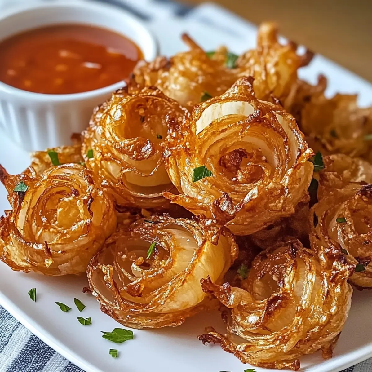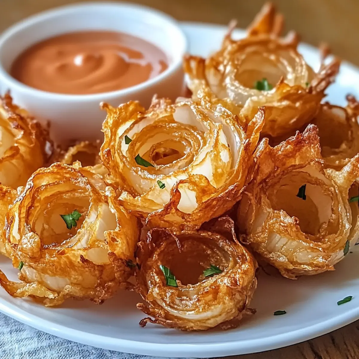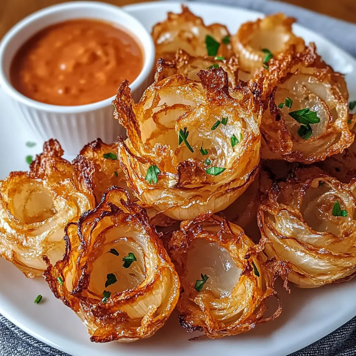 Hast du jemals den Wunsch verspürt, in Kindheitserinnerungen zu schwelgen, ohne dabei ein schlechtes Gewissen zu haben? Mit unseren Luftfritteuse knusprigen Mini-Blooming-Onions für schuld-freies Snacken bringe ich dir die perfekte Lösung! Diese köstlichen Häppchen vereinen nostalgische Aromen mit einem gesünderen Ansatz und sind in weniger als 15 Minuten zubereitet. Egal, ob du einen geselligen Abend mit Freunden planst oder einfach nur nach einer schnelle Snack-Idee suchst, diese glutenfreien, ganz nach deinem Geschmack anpassbaren kleinen Wunderwerke werden garantiert für Furore sorgen. Bereit, den perfekten Crunch zu entdecken? Lass uns gemeinsam in diese aufregende Rezeptwelt eintauchen! Warum wirst du dieses Rezept lieben? Einfachheit: Du benötigst nur grundlegende Kochfähigkeiten, um diese knusprigen Mini-Blooming-Onions zuzubereiten — ideal für alle, die ein schnelles und unkompliziertes Gericht lieben! Gesunder Genuss: Diese Variante kommt ganz ohne die typischen Kalorien der frittierten Version aus und ist trotzdem vollgepackt mit Geschmack. Vielseitig anpassbar: Ob du einen scharfen Kick hinzufügen oder sie glutenfrei zubereiten möchtest, die Möglichkeiten sind endlos! Schnelle Zubereitung: In weniger als 15 Minuten kannst du diese köstlichen Snacks zubereiten, perfekt für unerwartete Gäste oder den kleinen Hunger zwischendurch. Krispigkeit garantiert: Durch die Luftfritteuse erhältst du den perfekten Crunch, der jeden Snackabend aufwertet. Hole dir auch eine perfekte Begleitung mit Knuspriges Landhaus Huehnchen oder probiere die Bang Bang Rezept für eine köstliche Abwechslung. Luftfritteuse knusprige Mini-Blooming-Onions Zutaten • Diese einfachen Zutaten sorgen für eine geschmackvolle und gesunde Snack-Erfahrung. Für die Buttermilch-Mischung Buttermilch – Die Basis für den Teig, die das Panieren an den Zwiebeln hält; alternativ kannst du Milch mit Zitronensaft verwenden. Für die Panade Mehl – Gewährleistet die Struktur und Knusprigkeit; glutenfreies Mehl ist eine optimale Wahl für diese Option. Paprika – Verleiht einen milden, rauchigen Geschmack und eine schöne Farbe; geräucherte Paprika sorgt für ein intensiveres Aroma. Knoblauchpulver – Verleiht den Zwiebeln kräftige und herzhafte Noten. Zwiebelpulver – Verstärkt den Zwiebelflavour und gibt Tiefe. Cayennepfeffer – Fügt eine scharfe Note hinzu; nach Wunsch anpassen. Salz – Hebt die Aromen im ganzen Gericht hervor. Pfeffer – Bietet zusätzliche Würze und Balancierung der Geschmäcker. Für die Zwiebeln Süße Zwiebeln (z.B. Vidalia oder Walla Walla) – Die Hauptzutat, ausgewählt wegen ihrer milden Süße und Zartheit. Für das Kochen Kochspray/Öl – Sorgt für eine knusprige Außenhaut beim Luftfrittieren. Genieße diese luftfrittierte Köstlichkeit als guilt-free Snack und lass dich von der Kombination der Aromen verführen! Schritt-für-Schritt-Anleitung für Luftfritteuse knusprige Mini-Blooming-Onions für Schuld-freies Snacken Step 1: Buttermilch-Mischung vorbereiten Mische die Buttermilch (oder Milch mit Zitronensaft) in einer kleinen Schüssel und lasse sie 5 Minuten stehen, damit sie leicht dick wird. Diese Mischung ist essenziell, um die Panade an den Zwiebeln haften zu lassen, was deinen Luftfritteuse knusprigen Mini-Blooming-Onions den perfekten Geschmack verleiht. Step 2: Zwiebeln vorbereiten Schäle die süßen Zwiebeln (z.B. Vidalia oder Walla Walla) und schneide die Spitzen sowie die Böden ab. Mache dann vertikale Schnitte in die Zwiebeln, um die „Blütenblätter“ zu formen. Achte darauf, die Zwiebeln nicht ganz durchzuschneiden, damit sie beim Frittieren schön aufblühen. Step 3: Trockene Zutaten vermischen In einer separaten Schüssel vermische das Mehl, Paprika, Knoblauchpulver, Zwiebelpulver, Cayennepfeffer, Salz und Pfeffer. Diese gewürzte Mehlmischung sorgt dafür, dass deine Mini-Blooming-Onions nicht nur knusprig, sondern auch geschmackvoll werden. Step 4: Zwiebeln panieren Tauche jede Zwiebel zuerst in die Buttermilch-Mischung und achte darauf, dass sie komplett bedeckt ist. Anschließend wälze die Zwiebel in der vorbereiteten Mehlmischung und stelle sicher, dass sie gleichmäßig ummantelt ist. Dies ist entscheidend für die perfekte Knusprigkeit deiner Luftfritteuse knusprigen Mini-Blooming-Onions. Step 5: Luftfritteuse vorheizen Heize die Luftfritteuse auf 190 °C (380 °F) vor und lasse sie 5 Minuten lang laufen. Eine gut vorgeheizte Luftfritteuse gewährleistet, dass deine Zwiebeln gleichmäßig garen und eine goldbraune Oberfläche erhalten. Step 6: Zwiebeln anordnen Platziere die panierten Zwiebeln in dem Korb der Luftfritteuse und achte darauf, dass genug Platz für die Luftzirkulation bleibt. Dadurch wird sichergestellt, dass die Luftfritteuse knusprige Mini-Blooming-Onions von allen Seiten gleichmäßig frittieren. Step 7: Kochspray anwenden Besprühe oder bestreiche die Zwiebeln leicht mit Kochspray oder Öl, um eine knusprige Außenschicht zu erreichen. Dieser Schritt ist wichtig, um das köstliche, goldene Finish deiner Luftfritteuse knusprigen Mini-Blooming-Onions zu erzielen. Step 8: Frittieren Frittiere die Zwiebeln 10-12 Minuten lang. Schüttle den Korb einmal nach der Hälfte der Zeit, damit alle Seiten gleichmäßig bräunen. Achte darauf, dass sie goldbraun und knusprig aussehen, bevor du sie herausnimmst. Step 9: Dip-Essig zubereiten Während die Zwiebeln frittieren, bereite die Dipsauce vor, indem du Mayonnaise, Ketchup, Meerrettichsoße, Zitronensaft und Gewürze mischst. Dies wird die perfekte Ergänzung zu deinen Luftfritteuse knusprigen Mini-Blooming-Onions und sorgt für ein vollmundiges Geschmackserlebnis. Step 10: Servieren Genieße die warmen, knusprigen Mini-Blooming-Onions zusammen mit deiner Dipsauce. Diese leckeren Snacks sind ideal für gesellige Abende oder einen kleinen Heißhunger zwischendurch, ganz ohne schlechtes Gewissen! Expertentipps für Luftfritteuse knusprige Mini-Blooming-Onions Perfekte Pa