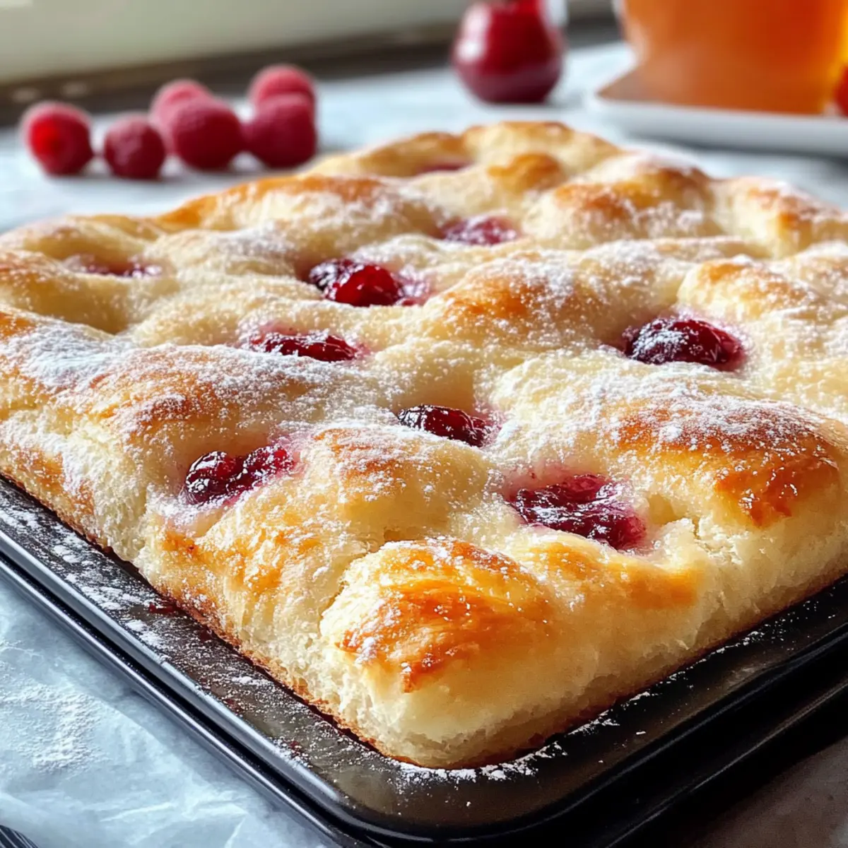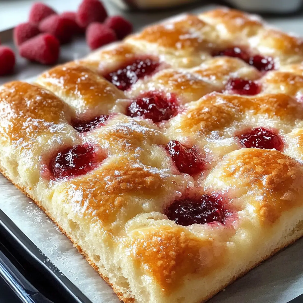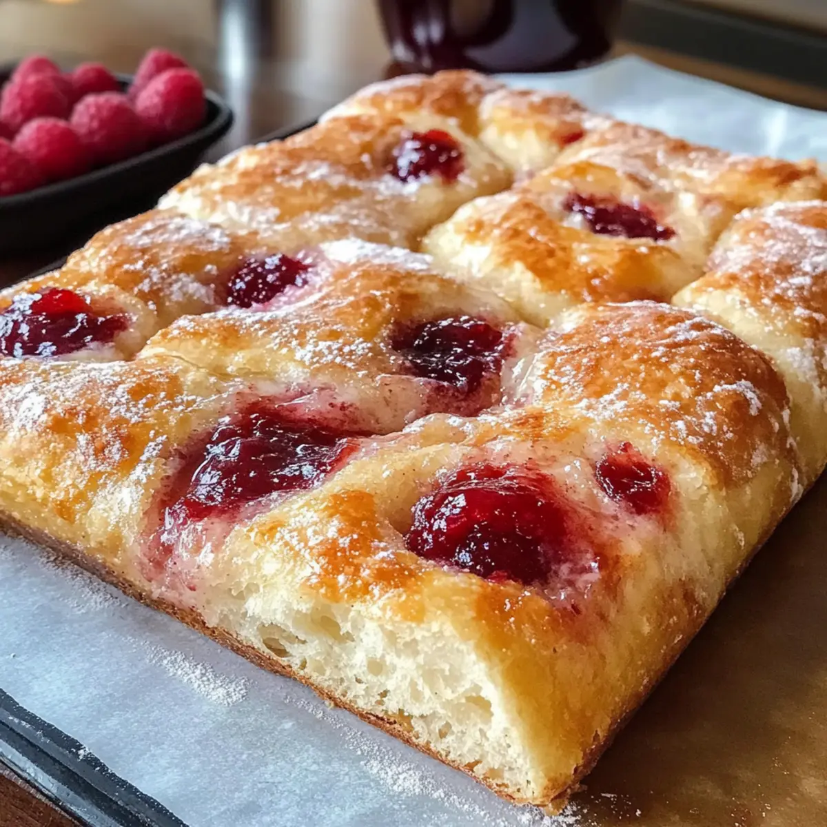 Ein gemütlicher Sonntagmorgen und der verlockende Duft von frisch gebackenem Brot – können Sie sich etwas Besseres vorstellen? Die Marmeladen-Donut-Focaccia verbindet die besten Elemente von Frühstück und Backkunst und bringt eine himmlische Süße direkt auf Ihren Tisch. Fluffig und leicht, ist jeder Bissen ein Genuss, der mit köstlicher Marmelade gefüllt ist, perfekt, um den Tag zu verschönern oder die Familie zu begeistern. Und das Beste daran? Diese einfache Rezeptur erfordert nur grundlegende Zutaten aus Ihrer Vorratskammer – ideal für spontane Backaktionen! Glauben Sie mir, die Mühe lohnt sich, denn das Ergebnis ist eine leckere Focaccia, die auch noch als fantastisches Frühstück für alle Gelegenheiten dient. Verpassen Sie nicht die Chance, Ihre Liebsten mit diesem süßen Zauberwerk zu überraschen! Was könnte Ihrer Meinung nach die perfekte Marmelade für dieses Rezept sein? Warum ist diese Focaccia so besonders? Einfachheit: Dieses Rezept ist unkompliziert und benötigt keine speziellen Backfähigkeiten – ideal für jeden, der frisch gebackenes Brot schnell zubereiten möchte. Himmlische Süße: Mit den Marmeladenfüllungen ist jede Scheibe ein süßer Genuss, der Sie an Ihre Kindheit erinnert. Vielseitig: Passen Sie die Marmelade nach Ihrem Geschmack an – ob Erdbeer, Aprikose oder sogar eine herzhafte Variante mit Kräutern, Ihre Kreativität kennt keine Grenzen! Familienfreundlich: Diese Marmeladen-Donut-Focaccia ist ein Hit bei Groß und Klein – perfekt für ein gemütliches Frühstück oder als süßer Snack zwischendurch. Zeitersparnis: Das Rezept ist so gestaltet, dass es Ihnen Zeit spart, während Sie immer noch ein beeindruckendes Ergebnis erzielen – ideal für hektische Morgen. Gönnen Sie sich und Ihren Lieben dieses köstliche Rezept und erleben Sie, wie einfach es ist, etwas Außergewöhnliches zu schaffen! Marmeladen-Donut-Focaccia Zutaten Für den Teig Warmwasser – Aktiviert die Hefe; stellen Sie sicher, dass die Temperatur zwischen 40-46°C liegt. Substitution: Verwenden Sie Milch für einen reichhaltigeren Geschmack. Zucker – Versorgt die Hefe mit Nahrung, damit sie aufgeht. Hinweis: Ein Muss für den Erfolg; überspringen Sie es nicht. Aktive Trockenhefe – Triebmittel; stellen Sie sicher, dass sie frisch ist, damit der Teig richtig aufgeht. Brotmehl – Sorgt für Struktur und Kaubarkeit dank des höheren Proteingehalts. Substitution: Weizenmehl ist akzeptabel, führt aber zu einer weicheren Textur. Weizenmehl – Balanced die Kaubarkeit des Brotmehls; trägt zur Luftigkeit bei. Salz – Verbessert den Geschmack; unbedingt hinzufügen, damit der Teig gut schmeckt. Olivenöl – Fügt Feuchtigkeit und Reichhaltigkeit hinzu; erleichtert die Teigverarbeitung. Für die Füllung und Glasur Himbeer-Konfitüre – Sorgt für Süße und Füllung; kann durch andere Lieblingsmarmeladen (Erdbeere, Aprikose) ersetzt werden. Puderzucker – Für die Glasur; verleiht dem Gebäck den letzten süßen Schliff. Passen Sie die Milch für die Konsistenz an. Schritt-für-Schritt-Anleitung zur Marmeladen-Donut-Focaccia Step 1: Hefe aktivieren Mischen Sie warmes Wasser (40-46°C) mit Zucker in einer Schüssel und rühren Sie, bis der Zucker aufgelöst ist. Fügen Sie die aktive Trockenhefe hinzu und lassen Sie die Mischung etwa 5 Minuten stehen, bis sie zu schäumen beginnt. Dies zeigt Ihnen, dass die Hefe aktiv ist und bereit ist, den Teig aufgehen zu lassen. Step 2: Teig zubereiten Geben Sie die Hefemischung in eine Rührschüssel einer Küchenmaschine und fügen Sie Brotmehl, Weizenmehl und Salz hinzu. Mischen Sie alles mit einem Knethaken, bis ein klebriger Teig entsteht. Arbeiten Sie den Teig etwa 5-7 Minuten lang, bis er elastisch und glatt ist. Step 3: Teig ruhen lassen Ölen Sie eine große Schüssel leicht mit Olivenöl ein und geben Sie den Teig hinein. Decken Sie die Schüssel mit einem sauberen Küchentuch ab und lassen Sie den Teig an einem warmen Ort etwa 1 Stunde ruhen, bis er sich in der Größe verdoppelt hat. Dies ist der Moment, um die Luftigkeit der Marmeladen-Donut-Focaccia zu gewährleisten. Step 4: Teig formen Fetten Sie ein Backblech mit Olivenöl ein und geben Sie den aufgegangenen Teig darauf. Falten Sie den Teig mehrere Male, um Luft zu entweichen, und drücken Sie ihn gleichmäßig in die Ecken des Blechs. Lassen Sie ihn erneut etwa 1 Stunde ruhen, bis er wieder aufgeht und sich verdoppelt hat. Step 5: Ofen vorheizen und belegen Heizen Sie den Ofen auf 220°C vor. Wenn der Teig fertig geruht ist, stechen Sie mit den Fingern tiefe Löcher in die Oberfläche und verteilen Sie die Himbeer-Konfitüre großzügig darüber. Achten Sie darauf, dass die Marmelade gut in die Löcher eindringt. Step 6: Focaccia backen Backen Sie die Marmeladen-Donut-Focaccia im vorgeheizten Ofen etwa 18-22 Minuten lang, bis die Oberseite goldbraun ist. Stellen Sie sicher, dass die Focaccia schön aufgegangen und am Rand leicht knusprig ist. Step 7: Fülle nach dem Backen Nehmen Sie die Focaccia aus dem Ofen und lassen Sie sie etwas abkühlen. Stechen Sie erneut mit einem Holzstäbchen in die Löcher und fügen Sie mehr Himbeer-Konfitüre hinzu, damit jeder Bissen voller süßer Überraschungen ist. Step 8: Glasur vorbereiten und servieren Bereiten Sie die Glasur vor, indem Sie Puderzucker mit etwas Milch verrühren, bis die gewünschte Konsistenz erreicht ist. Verteilen Sie die Glasur über die warme Marmeladen-Donut-Focaccia und lassen Sie sie etwas abkühlen, bevor Sie sie in Stücke schneiden und servieren. Was serviert man zur Marmeladen-Donut-Focaccia? Ein gemütlicher Sonntagmorgen wird durch die perfekte Begleitung zur Marmeladen-Donut-Focaccia noch wunderbarer – lassen Sie Ihrer Kreativität freien Lauf! Kaffee: Ein frisch gebrühter Kaffee genießt die süße Focaccia und bringt die Aromen wirklich zur Geltung. Der herbe Geschmack bildet eine köstliche Balance zur Süße. Frische Früchte: Servieren Sie eine bunte Mischung aus Beeren oder ge