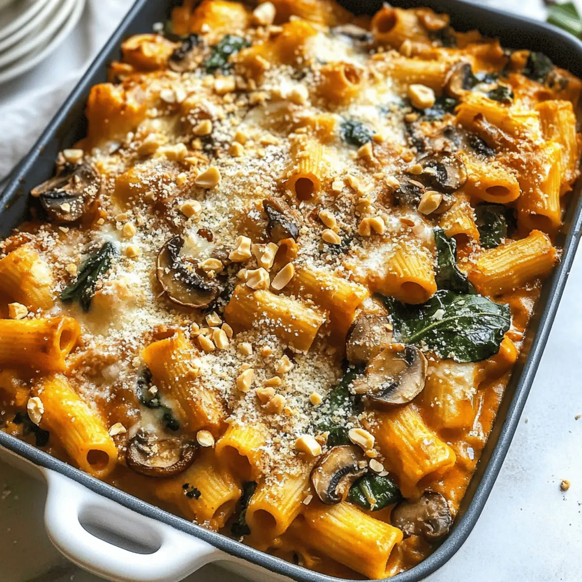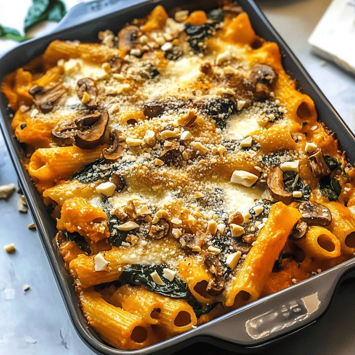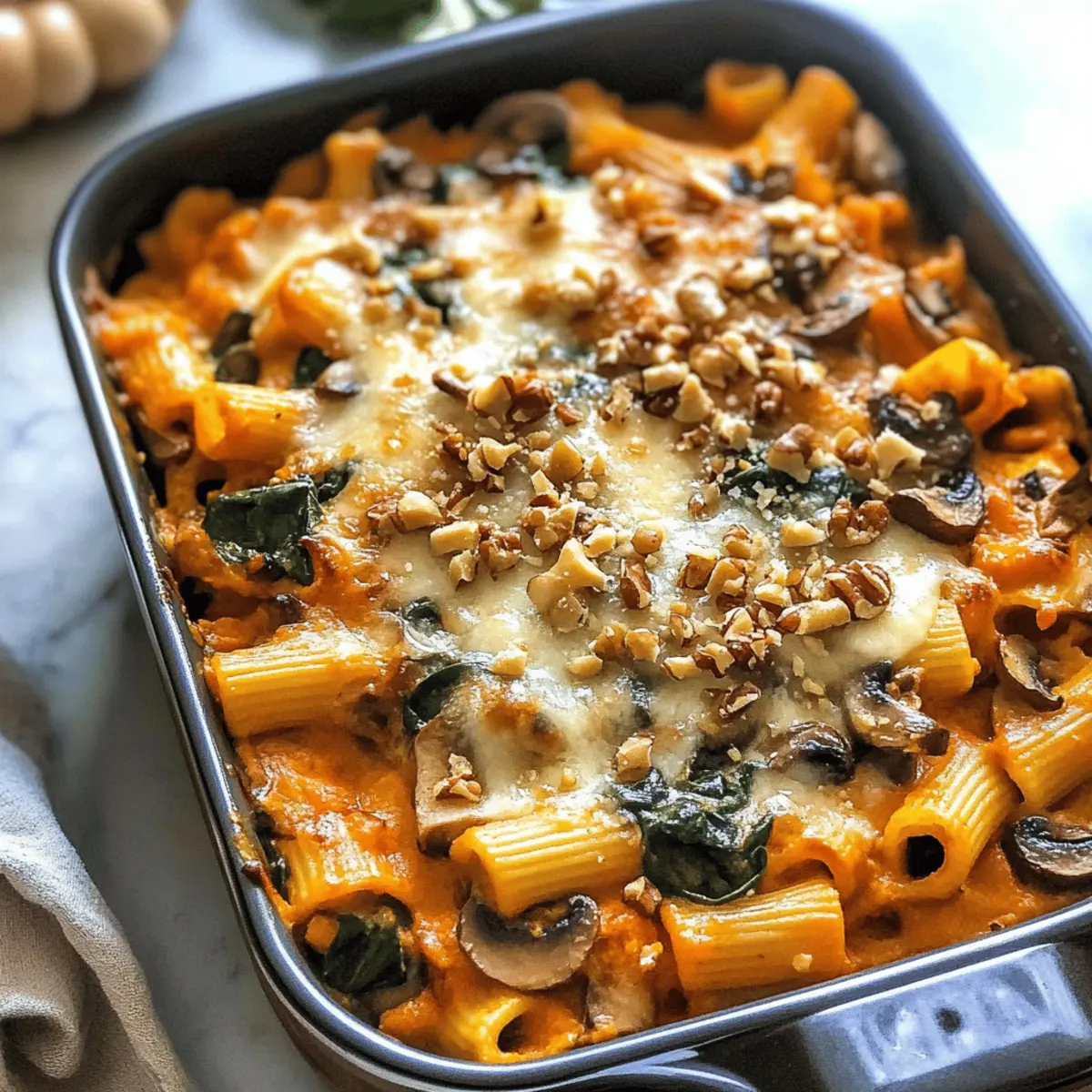 Wenn die Blätter draußen langsam ihr goldenes Kleid anlegen, kann ich das Aroma von frisch gebackenem Nudelauflauf mit Kürbis-Tomatensoße schon förmlich riechen. Dieser herzhafte Auflauf kombiniert cremige Kürbis-Tomaten-Soße mit saftigen Champignons und frischem Spinat, sodass er nicht nur ein wahrer Augenschmaus ist, sondern auch eine gelungene Möglichkeit, saisonales Gemüse in unsere Küche zu bringen. Perfekt für all jene, die einen schnellen Komfortgenuss möchten, der auch noch gesund ist – dieser vegetarische Nudelauflauf ist ein Hit für den Herbst und zaubert ein zufriedenes Lächeln auf jede Gesichtszeile. Haben Sie schon Hunger auf einen warmen, cremigen Biss? Warum werden Sie dieses Rezept lieben? Einfachheit: Die Zubereitung ist denkbar unkompliziert und erfordert nur grundlegende Kochkünste. Herzhafter Geschmack: Die Kombination aus Kürbis, Tomaten und würzigen Kräutern schafft ein reichhaltiges Aroma, das jeden begeistert. Vielseitigkeit: Dieser Nudelauflauf kann leicht mit verschiedenen Gemüsesorten oder Käsesorten angepasst werden, sodass er für jeden Geschmack geeignet ist. Saisonale Frische: Genießen Sie die Aromen des Herbstes, während Sie saisonales Gemüse in Ihr Menü integrieren – perfekt für Ihre nächste Mahlzeit! Gesund und zufriedenstellend: Mit einer guten Balance aus Nährstoffen ist dieser Auflauf eine köstliche Möglichkeit, gesund zu genießen. Zuschauerliebling: Ob bei einem Familienessen oder einem gemütlichen Abend mit Freunden, dieser Auflauf wird garantiert für strahlende Gesichter sorgen. Zutaten für Nudelauflauf mit Kürbis-Tomatensoße • Entdecken Sie die perfekte Kombination für einen herbstlichen Genuss, der Ihre Geschmacksknospen verwöhnt! Für die Pasta Trockene Pasta – 1 Pfund nach Wahl (z.B. Mezzi Rigatoni, Muscheln); bildet die Basis und sorgt für den Biss. Glutenfreie Alternativen sind ebenfalls möglich. Für die Sauce Butter – 2 EL; fügt reichhaltigen Geschmack hinzu. Verwenden Sie Olivenöl für eine milchfreie Option. Walnüsse – ½ Tasse, fein gehackt; sorgt für einen knusprigen Biss und gesunde Fette. Können durch Pekannüsse ersetzt oder weggelassen werden. Frischer Salbei – 1 EL plus 2 TL, fein gehackt; verleiht ein aromatisches Kraut-Aroma. Getrockneter Salbei kann verwendet werden, aber die Menge anpassen. Olivenöl – 2 EL; ideal zum Sautieren von Gemüse und sorgt für zusätzliches Aroma. Cremini-Pilze – 8 oz., in Scheiben; fügt Erdtöne und Textur hinzu. Kann durch Champignons oder Shiitake-Pilze ersetzt werden. Gelbe Zwiebel – 1, fein gehackt; baut die Geschmacksbasis auf. Tomatenmark – ¼ Tasse; konzentriert Umami und Süße, unverzichtbar für die Geschmacksvertiefung. Knoblauchzehen – 4, gehackt; sorgt für Frische und Aroma. Zerstoßene rote Pfefferflocken – ½ TL; bringt eine würzige Note ins Spiel. Kann weggelassen werden für eine mildere Variante. Frischer Babyspinat – 3 bis 4 Handvoll; bietet Blattgemüse, subtile Aromen und Nährstoffe. Getrockneter Oregano – 1 TL; für kräuterigen Geschmack. Köche Salz – 1 TL; balanciert die Aromen; essentiell für den Geschmack. Schwarzer Pfeffer – ½ TL; sorgt für die nötige Würze. Gemahlene Muskatnuss – ¼ TL; verleiht Wärme und Komplexität. Gemüsebrühe – 3 Tassen; sorgt für Feuchtigkeit und hilft beim Löschen. Kürbispüree – 1 Dose (15 oz.); die Hauptzutat für Cremigkeit und herbstlichen Geschmack. Geriebener Parmesan-Käse – ½ Tasse; für würzigen Geschmack, optional. Geriebener Fontina-Käse – 1½ Tassen, verteilt; schmelzender Käse für eine cremige Textur. Kann mit Mozzarella oder jedem anderen schmelzenden Käse ersetzt werden. Schritt-für-Schritt-Anleitung für Nudelauflauf mit Kürbis-Tomatensoße Schritt 1: Ofen vorheizen Heizen Sie den Ofen auf 190 °C (375 °F) vor. Dies ist wichtig, damit der Nudelauflauf gleichmäßig gart und eine schöne, goldene Kruste erhält. Während der Ofen vorheizt, können Sie bereits die Pasta vorbereiten, um Zeit zu sparen. Schritt 2: Pasta kochen Bringen Sie in einem großen Topf ausreichend gesalzenes Wasser zum Kochen. Fügen Sie die trockene Pasta hinzu und kochen Sie sie für etwa 7 Minuten, bis sie 2 Minuten weniger als al dente sind. Nach dem Abgießen der Pasta, stellen Sie sie beiseite und lassen Sie das Wasser abtropfen. Schritt 3: Walnüsse rösten In einer großen Pfanne bei mittlerer Hitze die Butter schmelzen. Geben Sie die gehackten Walnüsse und 1 EL frischen Salbei hinein und rösten Sie diese für etwa 5 Minuten, bis sie goldbraun und aromatisch sind. Stellen Sie die Mischung dann zur Seite, um etwas abzukühlen. Schritt 4: Gemüse sautieren In derselben Pfanne 2 EL Olivenöl erhitzen. Fügen Sie die geschnittenen Cremini-Pilze und die fein gehackte Zwiebel hinzu und sautieren Sie sie für etwa 8 Minuten, bis sie weich sind und leicht gebräunt. Diese Kombination wird die Geschmacksbasis für Ihren Nudelauflauf mit Kürbis-Tomatensoße bilden. Schritt 5: Tomatenmark und Gewürze hinzufügen Rühren Sie das Tomatenmark, den gehackten Knoblauch und die zerstoßenen roten Pfefferflocken in die Pfanne. Kochen Sie alles für 3–4 Minuten, bis das Tomatenmark anfängt zu karamellisieren und aromatisch ist. Dieser Schritt verleiht der Sauce eine tiefere Geschmacksintensität. Schritt 6: Spinat und Kräuter hinzufügen Fügen Sie nach und nach die frischen Babyspinatblätter hinzu und lassen Sie sie wilten. Dies dauert nur ein paar Minuten und verleiht dem Gericht wertvolle Nährstoffe. Rühren Sie anschließend den getrockneten Oregano, das Salz, den Pfeffer und die Muskatnuss ein, um die Aromen abzurunden. Schritt 7: Sauce anrühren Löschen Sie die Pfanne mit der Gemüsebrühe ab und fügen Sie das Kürbispüree und die Hälfte des geriebenen Fontina-Käses hinzu. Rühren Sie alles gut um, bis eine cremige Sauce entsteht. Diese Mischung wird die geschmackliche Grundlage für Ihren köstlichen Nudelauflauf mit Kürbis-Tomatensoße se