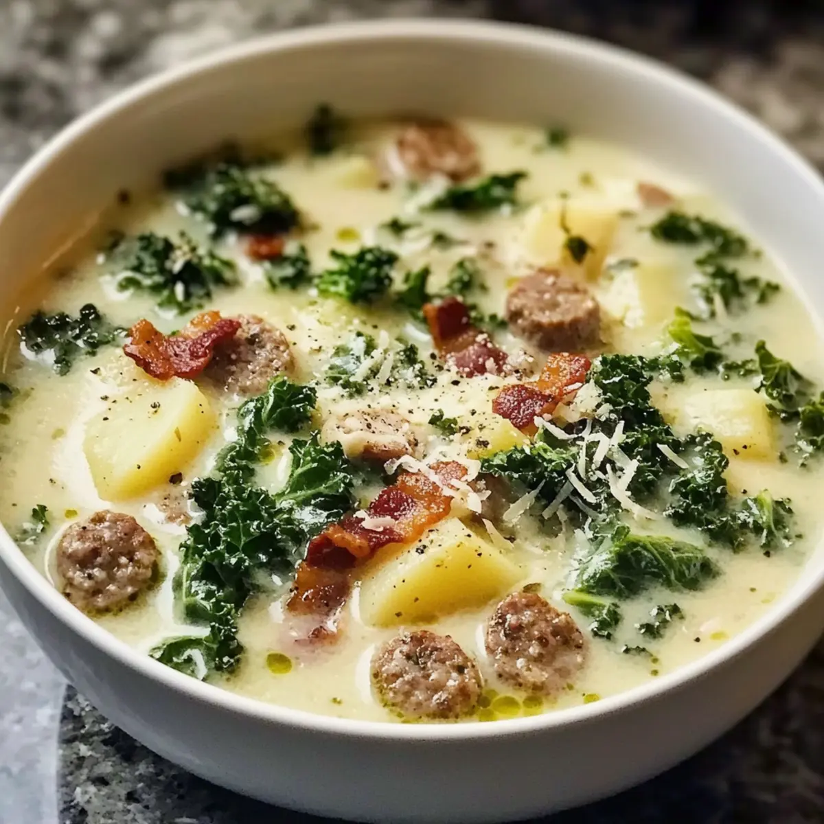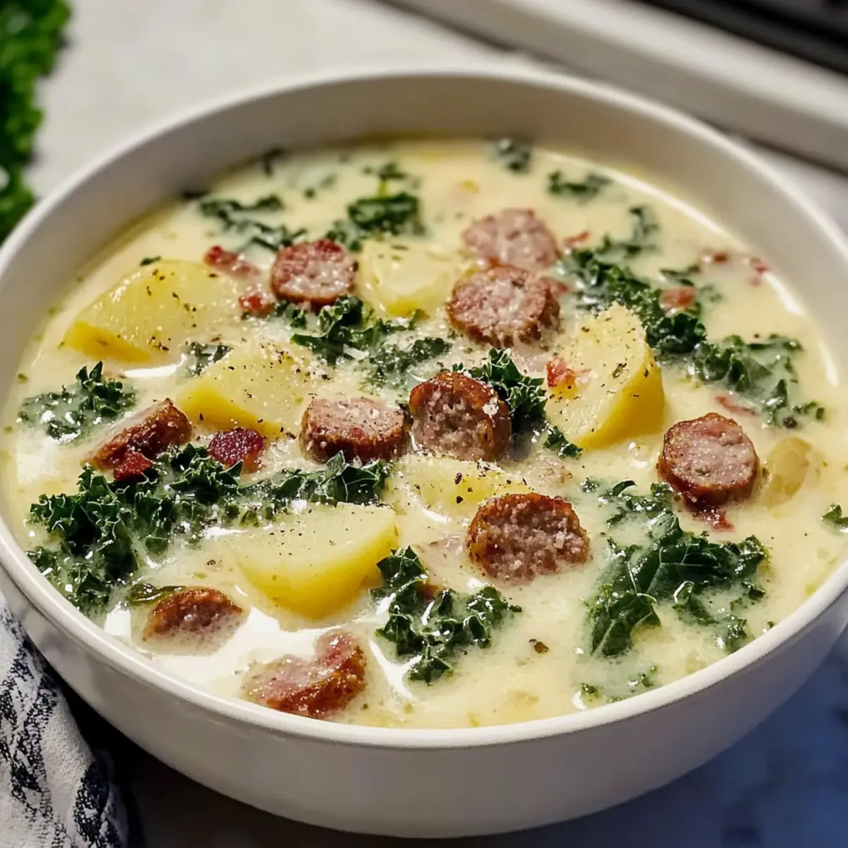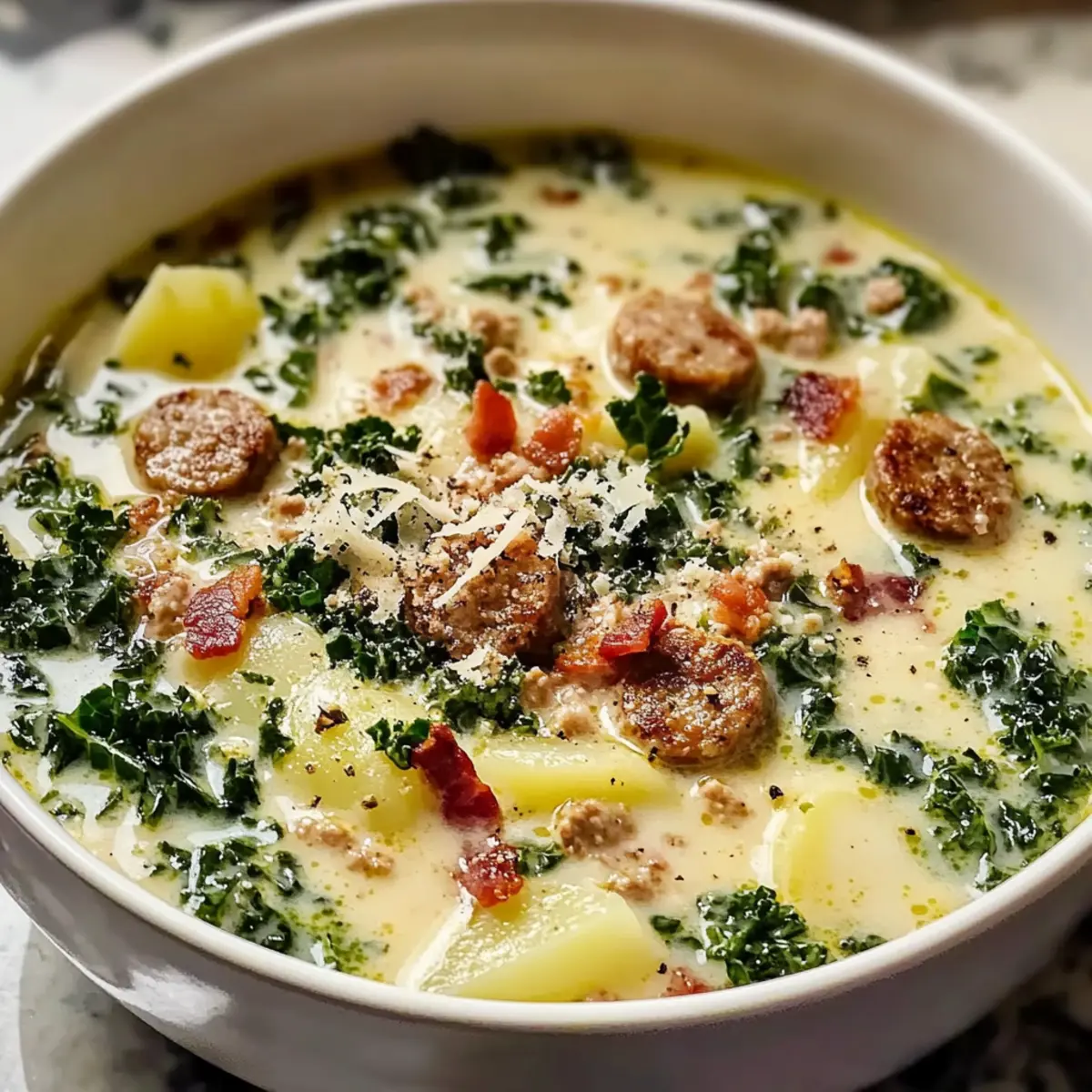 „Hast du schon einmal diese unvergessliche, wärmende Kreation aus einem Restaurant erlebt, die du unbedingt selbst nachkochen möchtest?“ Mit meiner Rezeptvariante der Olive Garden Wurst Grünkohl und Kartoffelsuppe bringe ich dir ein Stück italienische Gemütlichkeit direkt nach Hause. Dieses kreative Rezept vereint die herzhaften Aromen von würziger Wurst, zarten Kartoffeln und frischem Grünkohl zu einer köstlichen, cremigen Suppe, die perfekt für kalte Abende geeignet ist. Ein weiterer Pluspunkt? Sie ist nicht nur einfach zuzubereiten, sondern auch ein echtes Familienfavorit, der sich ideal für gesellige Runden eignet. Bereit, deine Küche in einen Ort der Wärme und des Genusses zu verwandeln? Lass uns starten! Warum wirst du diese Suppe lieben? Einfachheit: Die Zubereitung dieser wärmenden Suppe ist kinderleicht und benötigt nur grundlegende Kochfähigkeiten. Du kannst sie in nur einer Stunde zaubern! Herzhafter Genuss: Die Kombination aus würziger Wurst, zarten Kartoffeln und frischem Grünkohl sorgt für einen reichhaltigen und befriedigenden Geschmack, der jeden begeistert. Familienfreundlich: Dieses Rezept ist perfekt für gesellige Abende mit der Familie oder Freunden und lässt sich leicht in großen Mengen zubereiten. Jeder wird um Nachschlag bitten! Vielseitigkeit: Variiere die Wurst oder die Grüngemüse nach deinem Geschmack. Du kannst sogar andere Gemüsesorten ausprobieren, um die Suppe nach deinen Vorlieben anzupassen. Köstliche Kombination: Die cremige Textur mit knusprigem Bacon und Parmesan obendrauf macht jede Schale zu einem Hochgenuss. Kombiniere sie mit etwas knusprigem Brot oder einem leichten Beilagensalat für ein rundum gelungenes Mahl. Olive Garden Wurst Grünkohl und Kartoffelsuppe Zutaten Das Herzstück dieser cremigen Suppe: Neben den wichtigen Zutaten für unwiderstehlichen Geschmack sind hier auch einige Tipps, um die perfekte Suppe zu kreieren. Für die Brühe Italienische Wurst – sorgt für kräftigen Geschmack; wähle zwischen süß oder scharf je nach Vorliebe, oder nutze Puten- oder Hähnchenwurst für eine leichtere Variante. Hühnchenbrühe – dient als Basis; verwende natriumarme Brühe, um den Salzgehalt zu kontrollieren. Wasser – weich die Brühe ab und passe die Flüssigkeit nach Geschmack an. Für das Gemüse Butter – bietet die perfekte Grundlage zum Anbraten der Zwiebeln; ungesalzen ist empfehlenswert. Zwiebel – verleiht der Suppe Süße und Tiefe; für beste Ergebnisse Nutze gelbe oder weiße Zwiebel. Knoblauch – intensiviert das Aroma; kurz anbraten, um Bitterkeit zu vermeiden. Kartoffeln – sorgen für Substanz und Cremigkeit; in 1/4-Zoll-Runden schneiden für gleichmäßiges Kochen. Grünkohl – bringt Frische und Farbe; erst am Ende unterrühren, um die leuchtende Textur zu erhalten. Für die Verfeinerung Schlagsahne – sorgt für die cremige Textur; immer am Ende hinzufügen, um ein Gerinnen zu vermeiden. Verwende Zimmertemperatur, nicht kalte Sahne. Bacon – für einen knusprigen Topping; sorgt für zusätzliches Aroma und Textur. Optional, aber köstlich! Parmesan – vollendet das Gericht mit einem herzhaften Finish; über die Suppe geben, kurz vor dem Servieren. Roten Pfefferflocken – für eine kleine Schärfe, je nach Geschmack; können für eine mildere Suppe weggelassen werden. Salz & Pfeffer – unverzichtbar für die Würze; nach Belieben anpassen. Mit diesen Zutaten wird deine Olive Garden Wurst Grünkohl und Kartoffelsuppe zu einem wahren Geschmackserlebnis, das die ganze Familie begeistern wird! Schritt-für-Schritt-Anleitung für Olive Garden Wurst Grünkohl und Kartoffelsuppe Schritt 1: Wurst anbraten Erhitze einen großen Topf bei mittlerer bis hoher Temperatur und füge die italienische Wurst hinzu. Brate sie für 5-6 Minuten an, bis sie schön gebräunt und nicht mehr rosa ist. Achte darauf, die Wurst mit einem Holzlöffel zu zerteilen, damit sie gleichmäßig brät. Nimm die Wurst anschließend aus dem Topf und stelle sie beiseite, während die Röststoffe im Topf verbleiben. Schritt 2: Gemüse anbraten Gebe die Butter in den Topf mit den verbliebenen Wurst-Röststoffen und lasse sie bei mittlerer Hitze schmelzen. Füge die gewürfelte Zwiebel hinzu und brate sie 3-4 Minuten lang, bis sie glasig und weich ist. Der Duft der Zwiebel sollte angenehm süß sein, was anzeigt, dass sie gut angebraten ist und bereit für den nächsten Schritt ist. Schritt 3: Knoblauch hinzufügen Rühre den gehackten Knoblauch in die Zwiebelmischung und koche ihn etwa 1 Minute lang, bis er aromatisch ist. Achte darauf, dass der Knoblauch nicht verbrennt, da er bitter werden kann. Der süße Duft wird den Raum erfüllen und genau das ist, was du für deine Olive Garden Wurst Grünkohl und Kartoffelsuppe möchtest. Schritt 4: Brühe und Kartoffeln zugeben Gieße die Hühnchenbrühe und das Wasser in den Topf, füge die in Scheiben geschnittenen Kartoffeln hinzu und würze mit Salz, Pfeffer und roten Pfefferflocken. Bringe die Mischung zum Kochen und reduziere dann die Hitze auf mittlere Stufe. Lass die Suppe 12-15 Minuten köcheln, bis die Kartoffeln weich sind, aber noch ihre Form behalten. Schritt 5: Grünkohl einrühren Rühre den frischen Grünkohl in die Suppe und lasse ihn 2-3 Minuten kochen, bis er leicht verwelkt ist. Senke die Temperatur auf mittlere bis niedrige Stufe, um die gleichmäßige Hitze zu halten. Der Grünkohl sollte seine leuchtende grüne Farbe behalten und die Suppe frisch und einladend aussehen lassen. Schritt 6: Sahne hinzufügen Gieße die Zimmertemperatur-Schlagsahne langsam in die Suppe und rühre dabei sanft, um ein Gerinnen zu vermeiden. Die Sahne sollte nicht kalt sein, damit sie sich gut vermischt. Füge dann die vorgebratene Wurst wieder hinzu und lasse alles für einige Minuten köcheln, damit sich die Aromen der Olive Garden Wurst Grünkohl und Kartoffelsuppe gut miteinander verbinden. Schritt 7: Abschmecken und servieren Schmecke die Suppe nach Belieben ab und passe die Gew