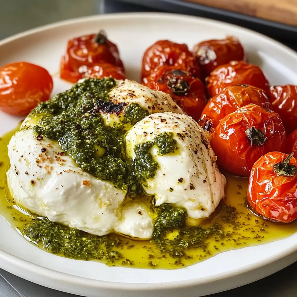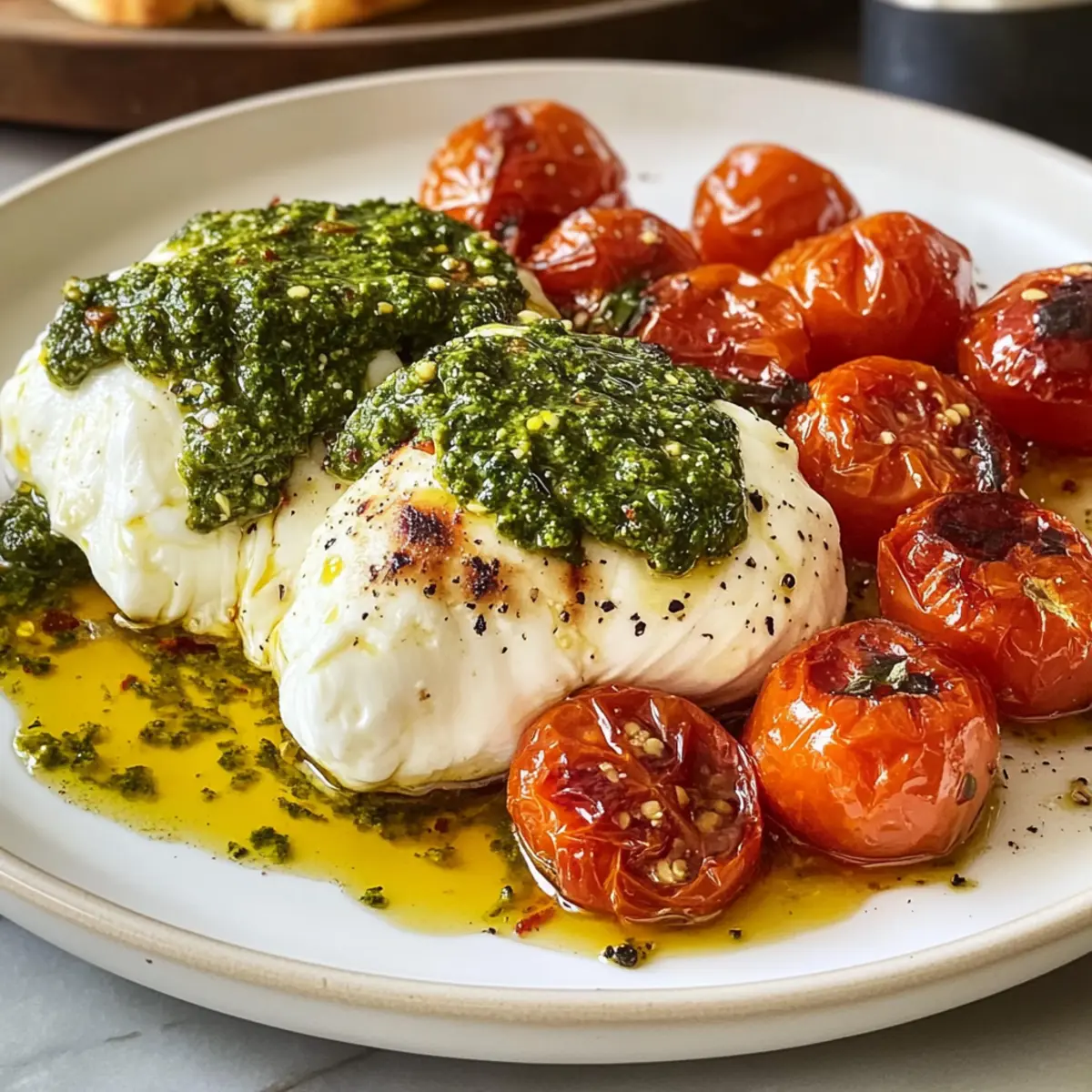 Die Wärme des italienischen Sommers strömt mir entgegen, als ich an meine neueste kulinarische Entdeckung denke: Pesto-gefüllte Burrata-Bomben. Diese aufregende Vorspeise vereint die zarte Cremigkeit von Burrata mit dem aromatischen Geschmack eines hausgemachten Pestos – und bringt sie in eine Form, die einfach zum Staunen einlädt. In weniger als einer halben Stunde kannst du diese köstlichen Häppchen zaubern, die nicht nur schnell und unkompliziert zu machen sind, sondern auch alle Gäste beeindrucken werden. Egal, ob du sie bei einem gemütlichen Abendessen oder auf einer eleganten Feier servierst, sie sind der perfekte Beweis, dass selbst die einfachsten Zutaten in ein Gourmet-Erlebnis verwandelt werden können. Bist du bereit, diese verführerische Kombination selbst auszuprobieren? Warum sind Pesto-gefüllte Burrata-Bomben so beliebt? Einfachheit: Die Zubereitung dieser köstlichen Häppchen ist kinderleicht und benötigt keine besonderen Kochkenntnisse. Vielfältige Aromen: Die Kombination aus Burrata und hausgemachtem Pesto sorgt für ein Geschmacksfeuerwerk, das deine Gäste begeistern wird. Perfekte Präsentation: Diese bombastischen kleinen Leckerbissen sind nicht nur lecker, sondern sehen auch fantastisch aus – das ideale Highlight für jede Feier. Zeitersparnis: In weniger als 30 Minuten sind sie fertig und bereit zum Genießen. Wenn du nach weiteren schnellen Rezepten suchst, schau dir auch unser Rezept für Puten Rollen Schuesseleinfach an, das ebenfalls schnell und einfach zuzubereiten ist! Pesto-gefüllte Burrata-Bomben Zutaten • Für die Tomaten Kirschtomaten – Sie sorgen für eine süße und säuerliche Note; ersetze sie durch Traubentomaten für ein ähnliches Aroma. Knoblauchzehen, gehackt – Verstärkt die herzhaften Aromen; verwende gerösteten Knoblauch für einen milderen Geschmack. Thymian, Blätter abgezupft – Frisch und aromatisch; lasse ihn weg oder tausche ihn gegen Basilikum aus. Natives Olivenöl extra – Verleiht Reichtum und hilft beim Rösten der Tomaten; kann durch Avocadoöl ersetzt werden. Koshersalz – Hebt den Geschmack hervor; Meersalz ist ebenfalls eine gute Alternative. Frisch gemahlener schwarzer Pfeffer – Für die Würze; weißer Pfeffer sorgt für einen milderen Geschmack. • Für die Füllung Hausgemachtes oder gekauftes Pesto – Füllt die Burrata mit lebhaftem Geschmack; selbstgemacht wird empfohlen für den besten Geschmack, während frisches Fertig-Pesto praktisch ist. Burrata (4 oz.) – Der Star mit einem cremigen Inneren; Mozzarella kann verwendet werden, bietet jedoch eine andere Textur. • Für die Garnitur Flaky Sea Salt – Für den letzten Schliff und zusätzlichen Geschmack. Frische Basilikumblätter – Perfekt zur Garnierung und zum Verfeinern; kann durch andere frische Kräuter wie Minze ersetzt werden. Die perfekte Kombination aus Geschmack und Textur macht diese Pesto-gefüllte Burrata-Bomben zu einem unvergesslichen Gericht, das sich schnell zubereiten lässt und alle begeistert! Schritt-für-Schritt-Anleitung für Pesto-gefüllte Burrata-Bomben Step 1: Tomaten vorbereiten Heize den Ofen auf 200 °C vor. In einer Schüssel die Kirschtomaten mit dem Olivenöl, gehacktem Knoblauch, Thymian, Koshersalz und frisch gemahlenem schwarzem Pfeffer vermengen. Lege die Mischung auf ein Backblech und röste die Tomaten etwa 30-40 Minuten lang, bis sie weich und aufgeplatz sind, und eine appetitliche Röstaroma verbreiten. Step 2: Burrata füllen Nimm die Burrata vorsichtig aus der Verpackung und lasse sie gut abtropfen. Schneide mit einem scharfen Messer die Hülle an der Oberseite auf, sodass das Innere sichtbar wird. Fülle die Burrata sorgfältig mit dem vorbereiteten Pesto, dann drücke die Öffnung sanft wieder zusammen, um die Füllung einzuschließen. Step 3: Anrichten In einer schönen Servierplatte die gerösteten Kirschtomaten gleichmäßig anrichten, sodass sie einen bunten Untergrund schaffen. Platziere die gefüllte Burrata vorsichtig darauf, damit sie gut zur Geltung kommt. Ein letzter Schluck extra-natives Olivenöl über die Burrata wird die Aromen intensivieren. Step 4: Servieren und genießen Bestreue die Pesto-gefüllten Burrata-Bomben mit einer Prise Flaky Sea Salt und dekoriere das Gericht mit frischen Basilikumblättern. Serviere diese köstlichen Häppchen sofort, während sie noch warm sind, und erfreue deine Gäste mit diesem köstlichen italienischen Erlebnis. Expert Tips für Pesto-gefüllte Burrata-Bomben Reiferegale nutzen: Verwende reife Kirschtomaten für den besten Geschmack. Unreife Tomaten schmecken oft fad und können die gesamte Vorspeise beeinträchtigen. Vorsicht bei der Burrata: Achte beim Schneiden darauf, nur die äußere Schicht zu durchtrennen. So bleibt das cremige Innere intakt und lässt sich perfekt genießen. Würzen nicht vergessen: Probier die Füllung häufig, insbesondere wenn du hausgemachtes Pesto verwendest. Die Stärke der Zutaten kann variieren, sodass du würzen musst. Roasting richtig machen: Überwache die Tomaten beim Rösten genau. Zu lange im Ofen trocknen sie aus; sie sollten weich und saftig sein. Kreative Variationen: Experimentiere mit verschiedenen Käsesorten in der Füllung. Zugabe von roten Pfefferflocken kann den Pesto-Geschmack aufpeppen und das Erlebnis diversifizieren. Pesto-gefüllte Burrata-Bomben im Voraus zubereiten Diese Pesto-gefüllten Burrata-Bomben sind perfekt für Meal Prep und lassen sich hervorragend im Voraus zubereiten! Du kannst die Kirschtomaten bis zu 3 Tage vor dem Servieren rösten und im Kühlschrank aufbewahren, damit sie ihre köstliche Süße und Textur behalten. Die Burrata sollte jedoch frisch gefüllt werden, um die Cremigkeit zu bewahren; fülle sie bis zu 1 Stunde vor dem Servieren mit dem Pesto, um ein Austrocknen zu verhindern. Wenn du bereit bist, servieren, lege die gerösteten Tomaten auf einen Teller, platziere die gefüllte Burrata darauf und garniere sie mit flüchtigem Meersalz und frischem Basilikum.