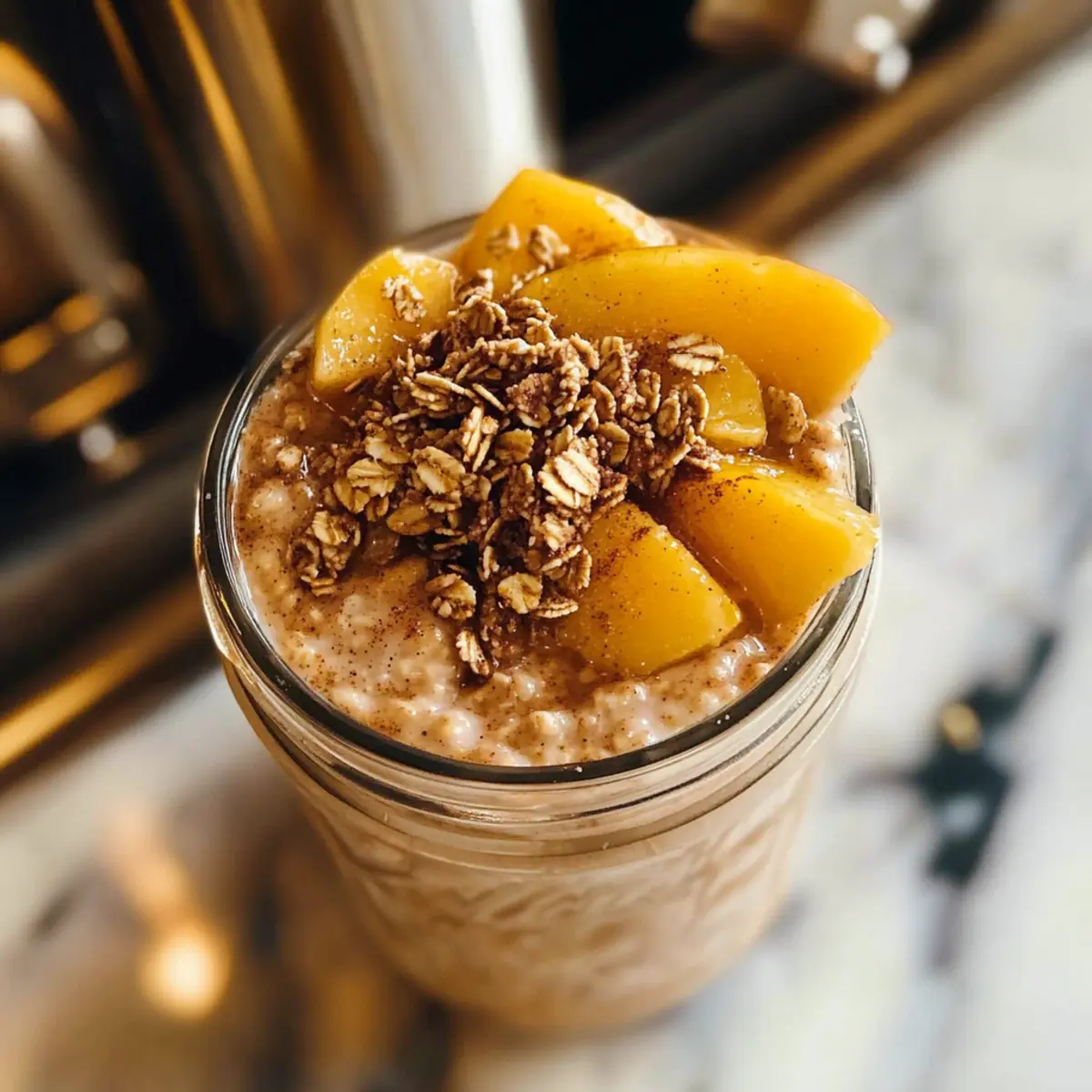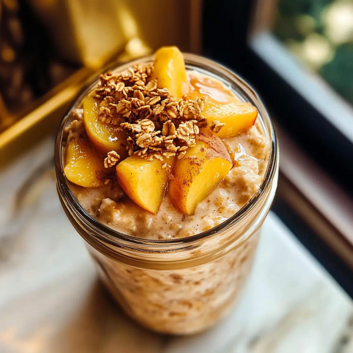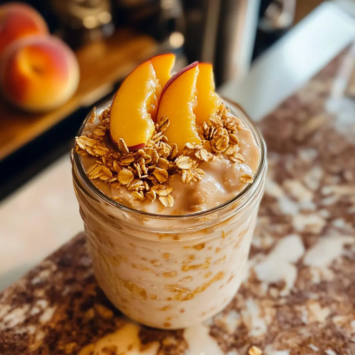Hast du schon einmal nach einem Frühstück gesucht, das so einfach ist, dass du es im Schlaf zubereiten könntest? Mein Rezept für Pfirsichstreusel Übernacht Haferflocken wird dein Retter in der Not! Diese köstlichen, cremigen Haferflocken bieten dir den unverwechselbaren Geschmack von warmem Pfirsichstreusel mit einer gesunden Note. Ideal für alle, die auf der Suche nach einem schnellen, nährstoffreichen Frühstück sind, kann dieses Gericht nach Belieben variiert werden. Denk daran, alles am Abend vorher vorzubereiten – so kannst du am Morgen einfach aufstehen und eine köstliche, no-cook Mahlzeit genießen. Bist du bereit, deiner Frühstücksroutine einen fruchtigen Twist zu verpassen? Warum sind Pfirsichstreusel so lecker? Einzigartig im Geschmack: Diese Pfirsichstreusel Übernacht Haferflocken kombinieren die süße der frischen Pfirsiche mit einer Prise Zimt, die dir das Gefühl von frisch gebackenem Pfirsichstreusel vermittelt. Gesund und nährstoffreich: Mit einer Basis aus glutenfreien Haferflocken sind sie nicht nur gesund, sondern auch proteinreich und enthalten wenig Zucker. Perfekt für einen energiereichen Start in den Tag! Unkompliziert zuzubereiten: Einfach alles in ein Glas geben, über Nacht kühlen und am Morgen genießen – so einfach kann Frühstück sein! Vielfältige Variationen: Probiere verschiedene Früchte und Gewürze aus, um diesen Klassiker nach deinem Geschmack zu personalisieren. Für mehr kreative Ideen kannst du auch unsere anderen Übernacht Haferflocken-Variationen entdecken. Beliebt bei Groß und Klein: Egal, ob als schnelles Frühstück für die Familie oder als leckere Snackoption – diese Haferflocken kommen immer gut an! Pfirsichstreusel Übernacht Haferflocken Zutaten Für die Haferflocken • Rohhaferflocken – Sie geben dem Gericht Struktur und machen es herzhaft. Substitution: Schnelle Haferflocken sind ebenfalls möglich, jedoch die Einweichzeit anpassen. • Milch (Milch oder pflanzlich) – Sorgt für Cremigkeit und Feuchtigkeit. Substitution: Verwende Mandel-, Hafer- oder Kokosmilch für eine milchfreie Variante. • Frische Pfirsiche, gewürfelt – Fügen natürliche Süße und Geschmack hinzu. Substitution: Gefrorene oder abgetropfte Dosenpfirsiche sind auch eine Option. • Chiasamen – Verdicken die Mischung und fügen Nährstoffe hinzu. Substitution: Leinsamen können ebenfalls verwendet werden. • Vanilleextrakt – Verbessert den Geschmack insgesamt. Hinweis: Verwende reinen Vanilleextrakt für den besten Geschmack. • Gemahlener Zimt – Bringt Wärme und Gewürz in das Gericht. • Ahornsirup oder Honig – Süßungsmittel für zusätzlichen Geschmack. Substitution: Auch Agavendicksaft kann verwendet werden. Für das Topping • Granola oder gehackte Nüsse – Sorgt für den nötigen Crunch und die Textur. Hinweis: Wähle die Nussart je nach Vorliebe. • Honig (optional) – Für extra Süße. Diese Pfirsichstreusel Übernacht Haferflocken sind eine köstliche und nährstoffreiche Frühstücksoption, die ein perfekter Start in den Tag ist! Schritt-für-Schritt-Anleitung für Pfirsichstreusel Übernacht Haferflocken Schritt 1: Pfirsiche vorbereiten Schneide die Hälfte der frischen Pfirsiche in mundgerechte Stücke. Wähle am besten reife, saftige Pfirsiche, um den süßen Geschmack zu maximieren. Du kannst diese vorbereiteten Pfirsichstücke gleich in einer Schüssel beiseite stellen, während du die übrigen Zutaten bereitstellst. Schritt 2: Zutaten kombinieren In einem Einmachglas oder einem luftdichten Behälter vermischst du die Rohhaferflocken, Milch (entweder Milch oder pflanzlich), Chiasamen, Vanilleextrakt, gemahlenen Zimt und den süßen Ahornsirup oder Honig. Rühre alles gut um, bis alle Zutaten gleichmäßig vermischt sind und keine trockenen Klümpchen mehr vorhanden sind. Schritt 3: Pfirsiche hinzufügen Füge nun die gewürfelten Pfirsiche zu der Hafermischung hinzu. Rühre vorsichtig, damit die Pfirsiche gleichmäßig in der Mischung verteilt sind und ihre süße Aromen entfalten können. Das Bild der lebhaften Farben und die verbleibenden Pfirsichstücke verleihen deiner Mischung einen appetitlichen Anblick. Schritt 4: Kühlen und ziehen lassen Decke das Einmachglas oder den Behälter gut ab und stelle ihn in den Kühlschrank. Lass die Mischung mindestens 4 Stunden, besser über Nacht, ruhen. So haben die Haferflocken die Möglichkeit, die Flüssigkeit aufzusaugen und weich zu werden, was zu einer perfekten Konsistenz für deine Pfirsichstreusel Übernacht Haferflocken führt. Schritt 5: Morgenroutinen Am Morgen nimm das Glas aus dem Kühlschrank und rühre die Mischung gründlich um. Wenn du eine cremigere Konsistenz wünschst, füge einen Schuss zusätzliche Milch hinzu. Der Look sollte glatt und einladend sein, bereit für die letzten Handgriffe. Schritt 6: Servieren und genießen Toppe deine Pfirsichstreusel Übernacht Haferflocken mit Granola oder gehackten Nüssen für den zusätzlichen Crunch. Du kannst auch etwas Honig darüber träufeln, wenn du es süßer magst. Diese köstliche Mischung ist sofort servierbereit und dein Frühstück wird zum erfrischenden Genuss! Lagerungstipps für Pfirsichstreusel Übernacht Haferflocken Zimmertemperatur: Bewahre die Pfirsichstreusel Übernacht Haferflocken nicht bei Zimmertemperatur auf, da die Zutaten verderben können. Kühlschrank: Die fertig zubereiteten Haferflocken können bis zu 3 Tage im Kühlschrank aufbewahrt werden. Stelle sicher, dass das Glas gut verschlossen ist, um die Frische zu erhalten. Gefrierschrank: Wenn du die Mischung länger aufbewahren möchtest, friere die Haferflocken in einem luftdichten Behälter bis zu 2 Monate ein. Vor dem Verzehr über Nacht im Kühlschrank auftauen lassen. Wiedererwärmen: Füge vor dem Servieren eventuell einen Schuss Milch hinzu, um cremige Pfirsichstreusel Übernacht Haferflocken zu genießen. Rühre gut um und genieße dein köstliches Frühstück! So bereitest du Pfirsichstreusel Übernacht Haferf