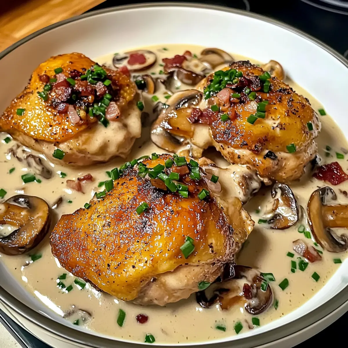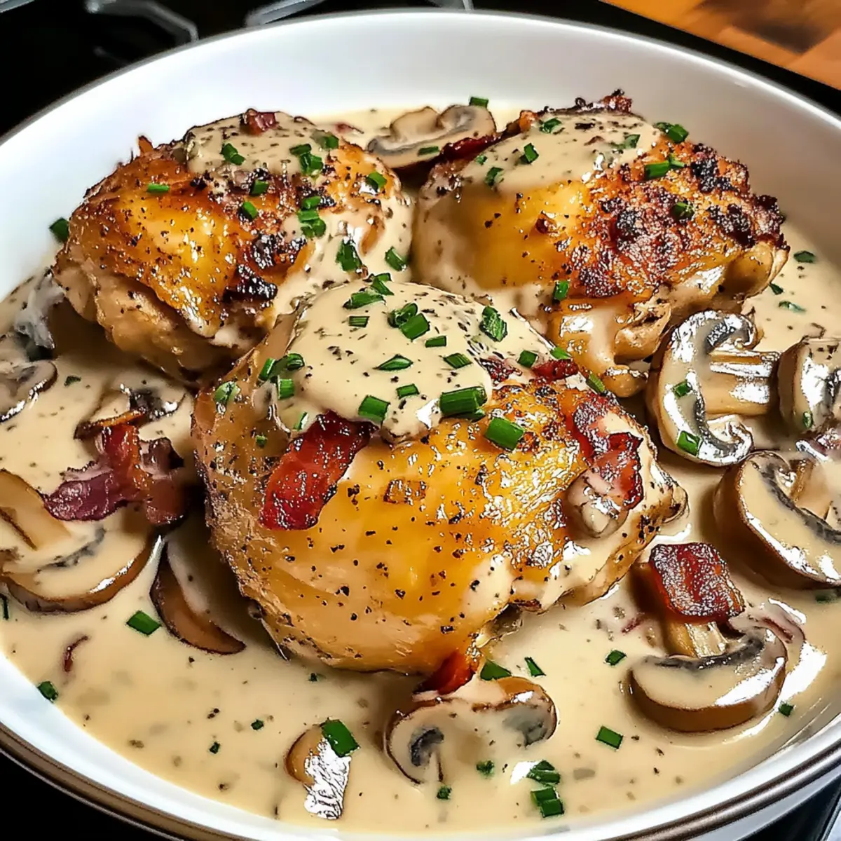 Als ich neulich nach einem schnellen und schmackhaften Rezept für unseren Familienabend suchte, stieß ich auf das Pilz-Hühnchen, das einfach nur ein Traum ist. Diese Kombination aus zartem Hähnchen und erdigen Champignons in einer cremigen, herzhaften Sauce ist der Inbegriff von Komfortessen. Die Zubereitung ist im Handumdrehen erledigt, und das Beste daran? Es ist glutenfrei und kommt bei jedem gut an! Mit nur wenigen Zutaten kannst du ein Gericht zaubern, das sich wie ein Gourmet-Mahl anfühlt, ohne stundenlang in der Küche stehen zu müssen. Neugierig, wie du dir dieses leckere Gericht nach Hause holen kannst? Lass uns direkt in die Details eintauchen! Was macht dieses Rezept besonders? Einfachheit: Die Zubereitung dieses Pilz-Hühnchens ist schnell und unkompliziert, perfekt für einen stressfreien Familienabend. Herzhafter Geschmack: Die Kombination aus zartem Hühnchen und erdigen Champignons in einer cremigen Sauce sorgt für ein unglaublich befriedigendes Geschmackserlebnis. Vielfalt: Du kannst das Rezept leicht anpassen, indem du beispielsweise Hähnchenbrust für eine leichtere Version oder verschiedene Pilzsorten wählst. Zeitersparnis: In weniger als 45 Minuten ist dein leckeres Gericht fertig, ideal für geschäftige Wochentage. Crowd-Pleaser: Ganz gleich, ob du es für die Familie oder Gäste zubereitest, dieses Gericht kommt bei jedem gut an und wird schnell zum Favoriten auf deinem Esstisch! Pilz-Hühnchen Zutaten • Entdecke die köstlichen Zutaten für dein perfektes Pilz-Hühnchen! Für das Hühnchen Hähnchenschenkel – Hauptprotein, das saftig und geschmackvoll ist; Hähnchenbrust kann für eine leichtere Option verwendet werden. Olivenöl – Zum Anbraten des Hähnchens; Pflanzenöl ist ebenfalls eine geeignete Alternative. Speck – Für salzige Tiefe im Gericht; Putenbacon kann eine leichtere Variante darstellen. Für die Sauce Mehl – Für eine knusprige Panade; kann durch glutenfreies Mehl ersetzt werden. Paprika – Fügt Wärme und Farbe hinzu; geräucherte Paprika verstärkt das Aroma. Braune Zwiebel – Basis für den Geschmack; Schalotten bieten einen milden Geschmack. Champignons – Verleihen Erdigkeit; Cremini- oder Portobello-Pilze sind hervorragende Alternativen. Knoblauch – Für aromatischen Geschmack; frischer Knoblauch wird empfohlen. Cremige Champignon-Suppe – Schlüsselingredienz für die Cremigkeit; selbstgemachte Versionen heben die Frische. Sahne – Für reichhaltige Sauce; Halb-und-Halb kann eine leichtere Option darstellen. Hühnchenbrühpulver – Verstärkt den Geschmack; natriumarme Brühe ist eine gesündere Wahl. Dijon-Senf – Fügt Säure hinzu; gelber Senf kann für einen milderen Geschmack verwendet werden. Parmesan – Sorgt für Käsegeschmack; ein aromatischer geriebener Käse kann alternativ genutzt werden. Schnittlauch – Zur Dekoration und für frischen Geschmack; Frühlingszwiebeln sind eine Alternative. Für die Beilage Brokkolini – Vorschlag für eine farbenfrohe und nahrhafte Seite. Mit diesen Zutaten zauberst du im Nu ein schmackhaftes Pilz-Hühnchen, das nicht nur glutenfrei ist, sondern auch in jedem Haushalt für Begeisterung sorgt! Schritt-für-Schritt-Anleitung für Pilz-Hühnchen Step 1: Ofen vorheizen Heize deinen Ofen auf 200 °C vor (180 °C Umluft). Diese Temperatur sorgt dafür, dass das Hähnchen gleichmäßig gart und eine schöne Kruste bekommt. Stelle sicher, dass der Ofen vollständig vorgeheizt ist, bevor du das Hühnchen hineinlegst, um die optimale Garzeit zu gewährleisten. Step 2: Hähnchen vorbereiten Mische in einer Schüssel das Mehl mit der Paprika. Wälze die Hähnchenschenkel gründlich in dieser Mischung, bis sie gleichmäßig bedeckt sind. Diese Panade hilft dabei, das Pilz-Hühnchen knusprig und geschmackvoll zu machen. Bereite die Panade kurz vor dem Anbraten vor, damit sie frisch bleibt. Step 3: Hähnchen anbraten Erhitze die Hälfte des Olivenöls in einer großen Pfanne über mittelhoher Hitze. Gib die Hähnchenschenkel hinein und brate sie für ca. 8 Minuten, bis sie goldbraun sind. Achte darauf, die Stücke nicht zu überfüllen, damit sie gleichmäßig bräunen können. Anschließend nimm das Hähnchen aus der Pfanne und lege es in eine Backform. Decke es mit Alufolie ab. Step 4: Hähnchen rösten Stelle das Hähnchen in den vorgeheizten Ofen und lasse es 30 bis 35 Minuten rösten, bis es zart und durchgegart ist. Verwende ein Fleischthermometer, um sicherzustellen, dass die Innentemperatur mindestens 75 °C beträgt. Die Hähnchenschenkel sollten außen schön knusprig und innen saftig sein. Step 5: Speck und Zwiebeln anbraten In der gleichen Pfanne, die du für das Hähnchen verwendet hast, gib den Speck und die Zwiebel hinzu. Brate sie bei mittlerer Hitze für etwa 8 Minuten an, bis sie goldbraun sind. Das Braten in der Pfanne bringt die Aromen des Hähnchens in die Zwiebel und den Speck, was für die Sauce unentbehrlich ist. Step 6: Champignons und Knoblauch hinzufügen Füge die grob geschnittenen Champignons und den gehackten Knoblauch zu der Speck-Zwiebel-Mischung hinzu. Koche alles für weitere 8 Minuten, bis die Champignons weich und leicht gebräunt sind. Sie bringen eine erdige Note in das Gericht, die das Pilz-Hühnchen besonders lecker macht. Step 7: Sauce zubereiten Gieße die cremige Champignon-Suppe, die Sahne, das Hühnchenbrühpulver und den Dijon-Senf in die Pfanne. Rühre alles gut um und lasse die Mischung bei niedriger Hitze köcheln, bis sie eingedickt ist. Diese Sauce ist das Herzstück deines Pilz-Hühnchens und sorgt für die gewünschte Cremigkeit. Step 8: Parmesan einrühren Reduziere die Hitze und füge den geriebenen Parmesan zur Sauce hinzu. Rühre kräftig um, bis der Käse vollständig geschmolzen und die Sauce schön cremig ist. Der Parmesan verstärkt den Geschmack und gibt dem ganzen Gericht eine köstliche, käsige Note. Step 9: Hähnchen zurück in die Pfanne Lege die gerösteten Hähnchenschenkel zurück in die Pfanne zur Sauce. Lö