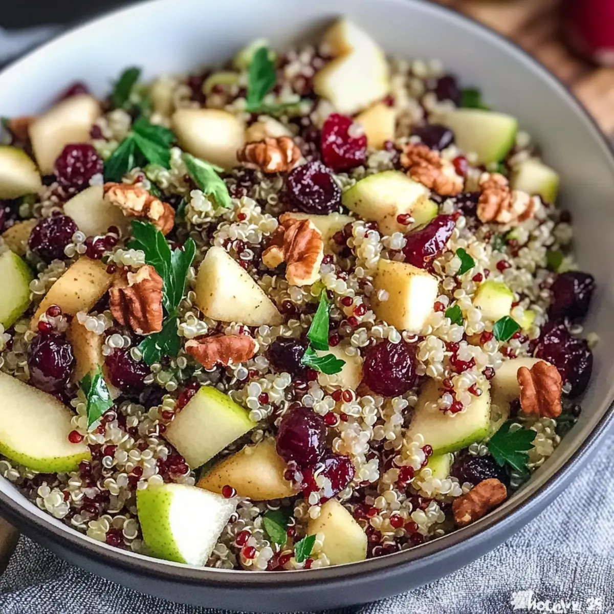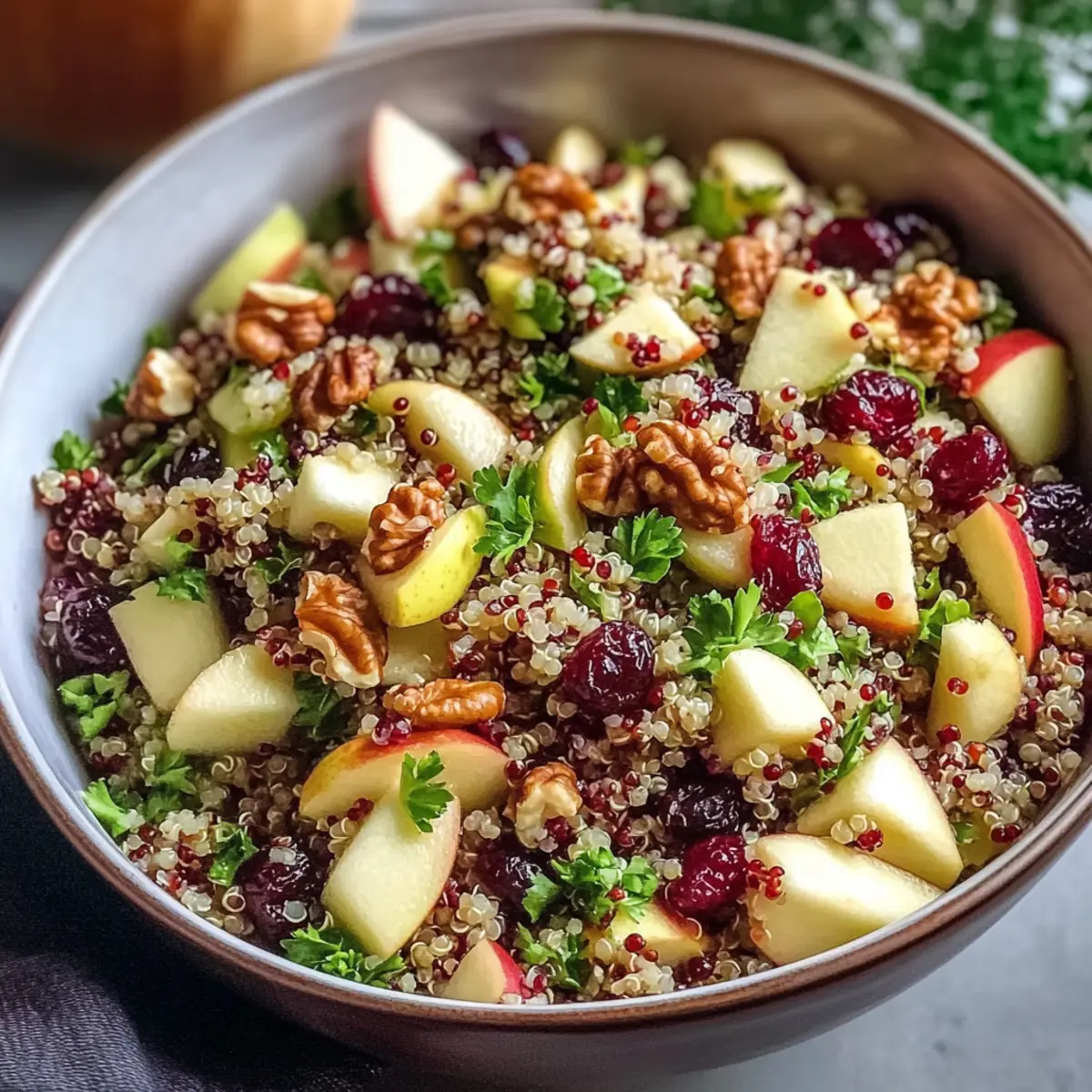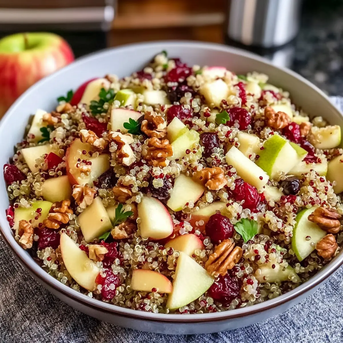 Draußen in der Natur, umgeben von der frischen Brise und dem Duft blühender Äpfel, wird mir bewusst, wie essenziell einfache, gesunde Gerichte für unser Wohlbefinden sind. Mein Quinoa Apfel Salat vereint nussige Quinoa mit knackigen Äpfeln und saftigen Cranberries, perfekt umhüllt von einem süß-sauren Maple-Dijon-Dressing. Diese Mischung sorgt nicht nur für einen erfrischenden Geschmack, sondern bietet auch eine tolle Texturvielfalt – von knusprig bis cremig. Ideal für Picknicks und schnelle Mittagessen, lässt sich dieses Rezept in nur 20 Minuten zubereiten und ist somit perfekt für alle, die frisch kochen möchten, ohne viel Zeit zu investieren. Neugierig, wie einfach und lecker es sein kann, ein Stück Natur auf den Teller zu bringen? Dann schauen wir uns das Rezept gemeinsam an! Warum wirst du diesen Salat lieben? Einfachheit pur: Die Zubereitung ist schnell und unkompliziert, ideal für alle Kochliebhaber. Frischer Geschmack: Die Kombination aus knackigen Äpfeln und nussiger Quinoa sorgt für ein Geschmackserlebnis, das jeder liebt. Vielseitig einsetzbar: Perfekt als Beilage zu Grillgerichten oder als leichter Lunch. Du kannst den Salat auch mit anderen Zutaten anpassen, wie gegrilltem Hähnchen oder Kichererbsen, um ihn noch proteinreicher zu machen. Gesunde Wahl: Dieser Quinoa Apfel Salat ist nicht nur glutenfrei, sondern auch reich an pflanzlichem Protein und Ballaststoffen, was ihn zu einer nahrhaften Option macht. Zeitersparnis: In nur 20 Minuten zubereitet, ist er ideal für schnelle Mahlzeiten, sei es für Arbeitstage oder gesellige Picknicks. Schmecke den Unterschied und entdecke, wie lecker gesund sein kann! Quinoa Apfel Salat Zutaten • Um alles frisch und lecker zu halten, habe ich hier die wichtigsten Zutaten aufgelistet. Für die Basis Quinoa – sorgt für Nüsse und Protein; du kannst jede Sorte verwenden (weiß, rot oder tricolor). Äpfel – bringen Süße und Crunch; empfehlenswerte Sorten sind Gala, Honeycrisp oder Granny Smith für eine herbe Note. Cranberries – fügen einen tangy Kick hinzu; du kannst sie durch getrocknete Kirschen oder Rosinen ersetzen. Für das Dressing Ahornsirup – dient als süßer Akzent im Dressing; Honig kann verwendet werden, wenn du keinen veganen Süßstoff möchtest. Dijon-Senf – bringt eine kräftige Geschmacksnote ins Dressing; nutze weniger für eine mildere Variante. Apfelessig – sorgt für die nötige Säure; du kannst auch normalen Essig verwenden, falls nötig. Knoblauch – für zusätzlichen Geschmack, mache ihn frisch für das beste Aroma. Allgewürz, Salz & Pfeffer – zur Geschmacksverbesserung; achte darauf, die Menge nach deinem Geschmack anzupassen. Für die Extras Zuckerwalnüsse – fügen Süße und Crunch hinzu; du kannst sie durch geröstete Mandeln oder Pekannüsse ersetzen oder ganz weglassen. Petersilie – sorgt für Frische; verwende Minze oder Basilikum für eine andere Note. Gemüsebrühe – gibt der Quinoa einen wunderbaren Geschmack; Wasser kann als Ersatz dienen, wenn du keine Brühe hast. Dieser Quinoa Apfel Salat ist nicht nur einfach zuzubereiten, sondern auch vollgepackt mit gesunden Zutaten, die dir Freude beim Kochen und Essen bereiten werden! Schritt-für-Schritt-Anleitung für Quinoa Apfel Salat Step 1: Quinoa zubereiten Wasche die Quinoa gründlich unter fließendem Wasser, um die Bitterstoffe zu entfernen. Koche sie dann in einer Tasse Gemüsebrühe in einem Topf bei mittlerer Hitze. Sobald die Brühe kocht, füge die getrockneten Cranberries hinzu, decke den Topf ab und lasse die Quinoa etwa 15 Minuten quellen, bis sie weich ist und das Wasser aufgesogen wurde. Fluffe die Quinoa anschließend mit einer Gabel auf und transferiere sie in eine große Schüssel. Step 2: Vinaigrette herstellen In einer kleinen Schüssel verrühre 4 Esslöffel Olivenöl, 2 Esslöffel Ahornsirup, 1 Esslöffel Dijon-Senf, 1 Esslöffel Apfelessig sowie eine gepresste Knoblauchzehe und eine Prise Allgewürz, Salz und Pfeffer. Schlage die Mischung gut durch, bis eine gleichmäßige, cremige Konsistenz entsteht. Diese süß-saure Vinaigrette wird deinem Quinoa Apfel Salat eine erfrischende Note verleihen. Step 3: Zutaten kombinieren Füge der aufgeflufften Quinoa nun 2 gewürfelte Äpfel, 2 Stangen fein geschnittenen Sellerie und eine Handvoll frisch gehackte Petersilie hinzu. Wenn du willst, streue auch eine Tasse gezuckerte Walnüsse über die Mischung. Rühre vorsichtig um, damit die Zutaten gut verteilt sind, ohne die Quinoa zu zerdrücken, und lass die Farben und Texturen aufeinander treffen. Step 4: Salat anrichten Gieße die vorbereitete Vinaigrette gleichmäßig über den Quinoa Apfel Salat. Mische alles sorgfältig mit einem großen Löffel oder einer Gabel, bis die Zutaten vollständig mit dem Dressing überzogen sind. Platziere den Salat dekorativ auf einer größeren Servierplatte oder lasse ihn in der Schüssel, um ihn bequemer zu servieren. Step 5: Servieren Lass den Salat für mindestens 30 Minuten im Kühlschrank ruhen, damit sich die Aromen entfalten können. Du kannst ihn dann kalt oder bei Raumtemperatur servieren. Dieser Quinoa Apfel Salat ist nicht nur ein echter Farbtupfer, sondern auch ein leckerer, nahrhafter Genuss, der sowohl als Beilage als auch als Hauptgericht überzeugt. Meal Prep für Quinoa Apfel Salat Die Zubereitung des Quinoa Apfel Salats ist ideal für alle, die Zeit sparen möchten! Du kannst die Quinoa und die Vinaigrette bis zu 3 Tagen im Voraus zubereiten. Koche die Quinoa in Gemüsebrühe und lasse sie abkühlen, während du die Vinaigrette aus Olivenöl, Ahornsirup, Dijon-Senf und Apfelessig anrührst. Bewahre beides in separaten luftdichten Behältern im Kühlschrank auf, um die Frische zu gewährleisten. Füge die gewürfelten Äpfel, Sellerie und Nüsse erst kurz vor dem Servieren hinzu, damit sie knackig bleiben und nicht braun werden. Wenn du bereit bist, den Salat zu genießen, kombiniere einfach alles in einer großen Schüssel und lass es mindestens 