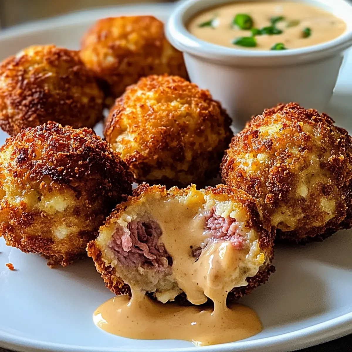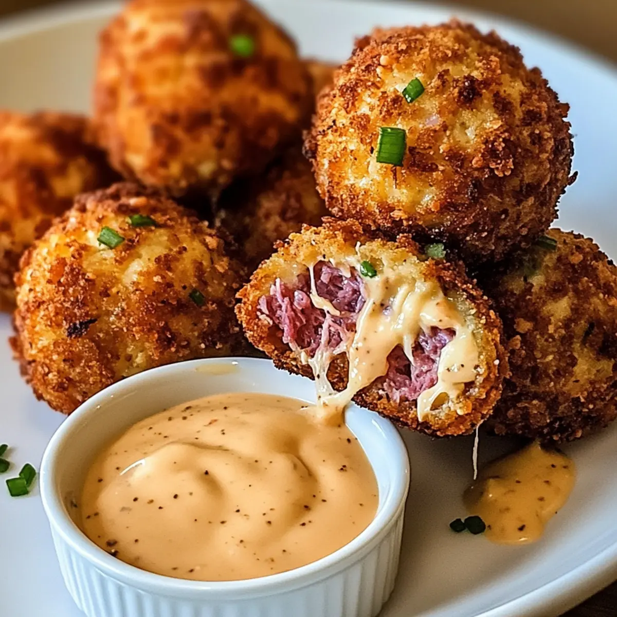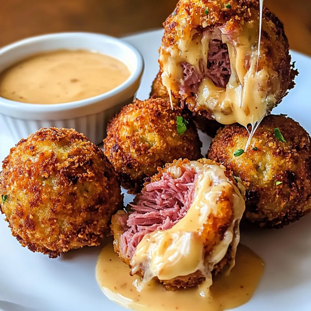 Eines Abends, während ich am Herd stand und eine kleine Schüssel mit Zutaten vorbereitete, kam mir der Gedanke: Warum nicht die Aromen eines klassischen Reuben-Sandwichs in ein schnelles, knackiges Snackformat verwandeln? So entstanden die köstlichen Reubenbällchen, die außen schön knusprig und innen wunderbar geschmolzen sind. Diese kleinen Leckerbissen vereinen zartes Rinderfleisch, würzigen Sauerkraut und cremigen Schweizer Käse, alles umhüllt von einer goldenen Panko-Kruste. Ideal für gesellige Abende oder als perfekte Ergänzung zu deinem nächsten Spieltag-Snack. Was diesen Genuss noch besser macht? Sie sind schnell zubereitet und können auch glutenfrei zubereitet werden! Bist du bereit, den herzhaften Geschmack dieser Reubenbällchen mit einem pikanten Thousand Island Dip zu entdecken? Warum solltest du Reubenbällchen lieben? Einfachheit: Die Zubereitung dieser Reubenbällchen ist kinderleicht und benötigt nur grundlegende Kochkenntnisse, perfekt für jeden Hobbykoch. Herzhafter Geschmack: Die Kombination aus zartem Rindfleisch, würzigem Sauerkraut und schmelzendem Käse sorgt für ein Geschmackserlebnis, das alle Anhänger der klassischen Reuben-Sandwiches begeistern wird. Vielseitigkeit: Du kannst die Bällchen ganz nach deinem Geschmack anpassen – probiere sie mit Pastrami oder sogar als vegetarische Version mit einer Pilzfüllung. Zeitersparnis: In weniger als einer Stunde hast du einen leckeren Snack vorbereitet, ideal für spontane Dinnerpartys. Beliebtheit: Jeder wird von diesen köstlichen Leckerbissen begeistert sein – sie sind perfekt für gesellige Abende und Spieltage! Entdecke auch unsere Tipps für glutenfreie Optionen, um alle Gäste glücklich zu machen. Reubenbällchen Zutaten • Stelle sicher, dass du alles zur Hand hast für diese köstlichen Reubenbällchen! Für die Bällchen Corned Beef – Sorgt für einen herzhaften, würzigen Geschmack; du kannst auch Pastrami verwenden, um eine rauchige Note zu erhalten. Sauerkraut – Gibt einen tollen, säuerlichen Geschmack; achte darauf, dass das Sauerkraut gut abgetropft und trocken ist, um ein Zerfallen zu vermeiden. Schweizer Käse – Für eine cremige und schmelzende Textur; Gruyère oder Provolone sind hervorragende Alternativen. Frischkäse – Macht die Mischung reichhaltiger und hilft, alles zu bindet. Dijon-Senf – Verleiht eine angenehme Schärfe im Geschmack. Knoblauchpulver & Zwiebelpulver – Diese Gewürze sorgen für zusätzliche, herzhafte Noten. Salz und schwarzer Pfeffer – Für das Würzen der Mischung. Allzweckmehl – Gibt eine knusprige Beschichtung, bevor die Bällchen frittiert werden; du kannst auch glutenfreies Mehl verwenden. Eier – Binden die Panade zusammen. Panko-Brösel – Für einen extra knusprigen Biss; doppelte Beschichtung sorgt für noch mehr Crunch. Für den Dip Mayonnaise – Basis der Dip-Sauce. Ketchup – Fügt eine süße Komponente hinzu. Süße Relish – Verleiht eine schöne Fruchtigkeit. Scharfe Sauce – Für die nötige Würze; passe die Menge nach deinem Geschmack an! Geräuchertes Paprika – Gibt dem Dip eine rauchige Tiefe. Worcestershire-Sauce – Rundet die Aromen ab. Minced Onion – Für zusätzlichen Geschmack im Dip. Step-by-Step Instructions für Reubenbällchen mit würzigem Dip Step 1: Mischung vorbereiten In einer großen Schüssel die klein geschnittenen Corned Beef, das gut abgetropfte und trocken gedrückte Sauerkraut, gewürfelten Schweizer Käse, Frischkäse, Dijon-Senf, Knoblauchpulver, Zwiebelpulver, Salz und Pfeffer gut vermengen. Mit einem Löffel oder der Hand kräftig durchmischen, bis alles gleichmäßig verteilt ist. Diese Mischung sollte eine homogene, leicht klebrige Konsistenz haben, die gut zusammenhält. Step 2: Mischung kühlen Die fertige Mischung in die Kühltruhe oder den Kühlschrank stellen und für etwa 30 bis 45 Minuten kühlen. Dies hilft dabei, die Bällchen leichter formen zu können und sorgt dafür, dass sie beim Frittieren nicht auseinanderfallen. Während die Mischung kühlt, kannst du die nächsten Schritte bereits vorbereiten. Step 3: Bällchen formen Nach dem Kühlen die Mischung aus dem Kühlschrank nehmen und mit den Händen oder einem Esslöffel kleine Bällchen von etwa 2 bis 4 cm Durchmesser formen. Lege sie auf ein Backblech oder einen Teller, damit sie bereit sind, in die Panade eingewickelt zu werden. Achte darauf, dass die Bällchen gleichmäßig geformt sind, damit sie gleichmäßig garen. Step 4: Panierstation einrichten Richte eine Panierstation ein, indem du drei Schalen bereitstellst: eine mit Allzweckmehl, eine mit verquirlten Eiern und eine mit Panko-Bröseln. Diese getrennten Schalen ermöglichen ein einfaches und schnelles Panieren der Reubenbällchen. Stelle sicher, dass alle Zutaten in Reichweite sind, um das Panieren effizient durchzuführen. Step 5: Bällchen panieren Beginne, jedes Bällchen zuerst in das Mehl zu rollen, um eine Grundschicht zu schaffen. Tauche dann das bemehlte Bällchen in die Eier und lasse überschüssige Flüssigkeit abtropfen. Zuletzt die Bällchen in die Panko-Brösel rollen und sicherstellen, dass sie gleichmäßig bedeckt sind. Diese doppelte Panierung sorgt für eine besonders knusprige Außenschicht. Step 6: Öl erhitzen Erhitze etwa 5 cm Öl in einem großen Topf oder einer tiefen Pfanne, bis es eine Temperatur von 175 °C (350 °F) erreicht. Du kannst dies testen, indem du ein kleines Stück der Panko-Brösel hineingibst; wenn es brutzelt, ist das Öl bereit. Achte darauf, das Öl nicht zu stark zu erhitzen, um ein Verbrennen der Brösel zu vermeiden. Step 7: Bällchen frittieren Frittiere die Reubenbällchen in kleinen Portionen (nicht mehr als fünf auf einmal), um sicherzustellen, dass sie gleichmäßig garen. Frittiere sie für etwa 2 bis 3 Minuten oder bis sie goldbraun und knusprig sind. Drehe sie gelegentlich, um eine gleichmäßige Bräunung zu gewährleisten und schaue zu, wie sie im heißen Öl köstlich aufploppen. Step 8: Abtropfen
