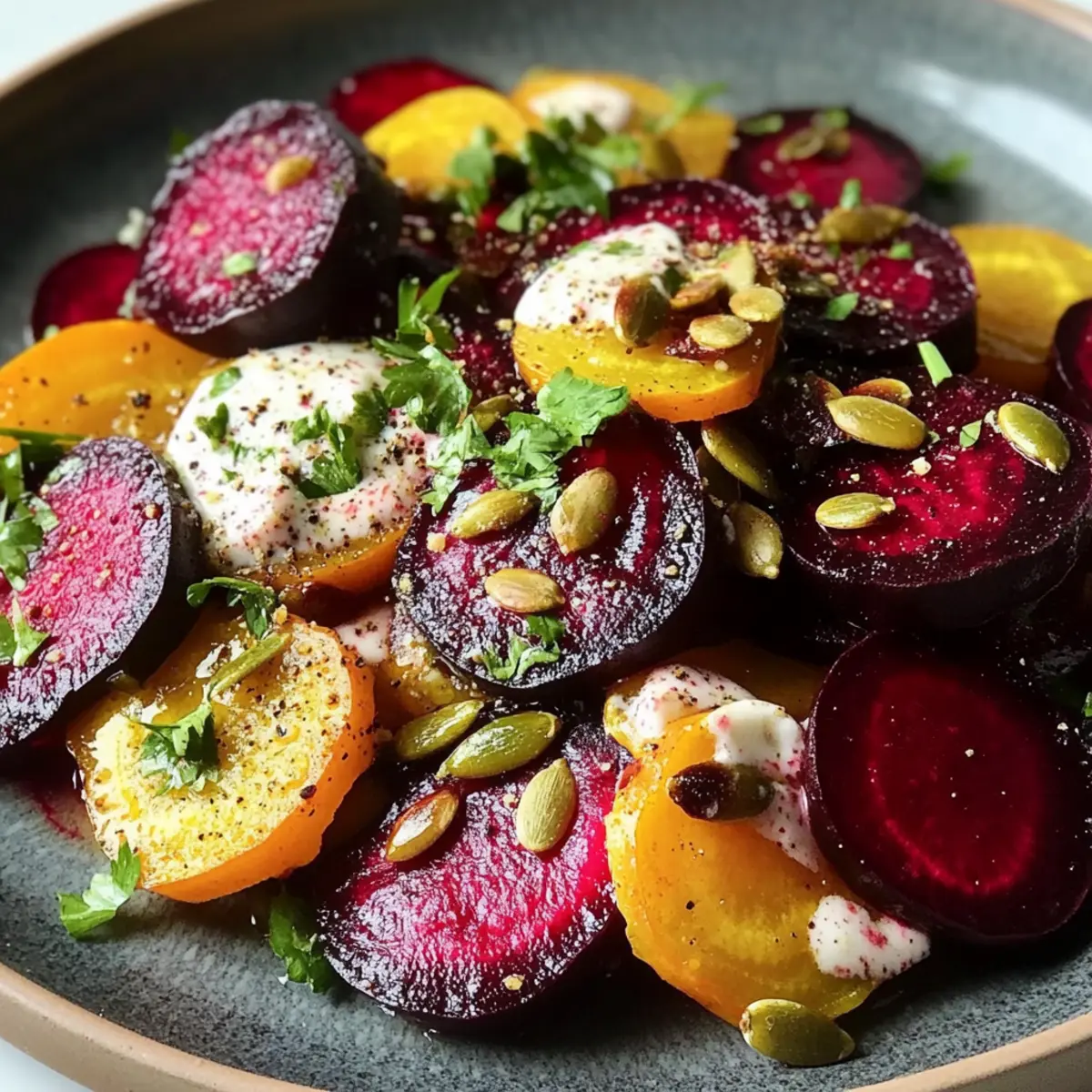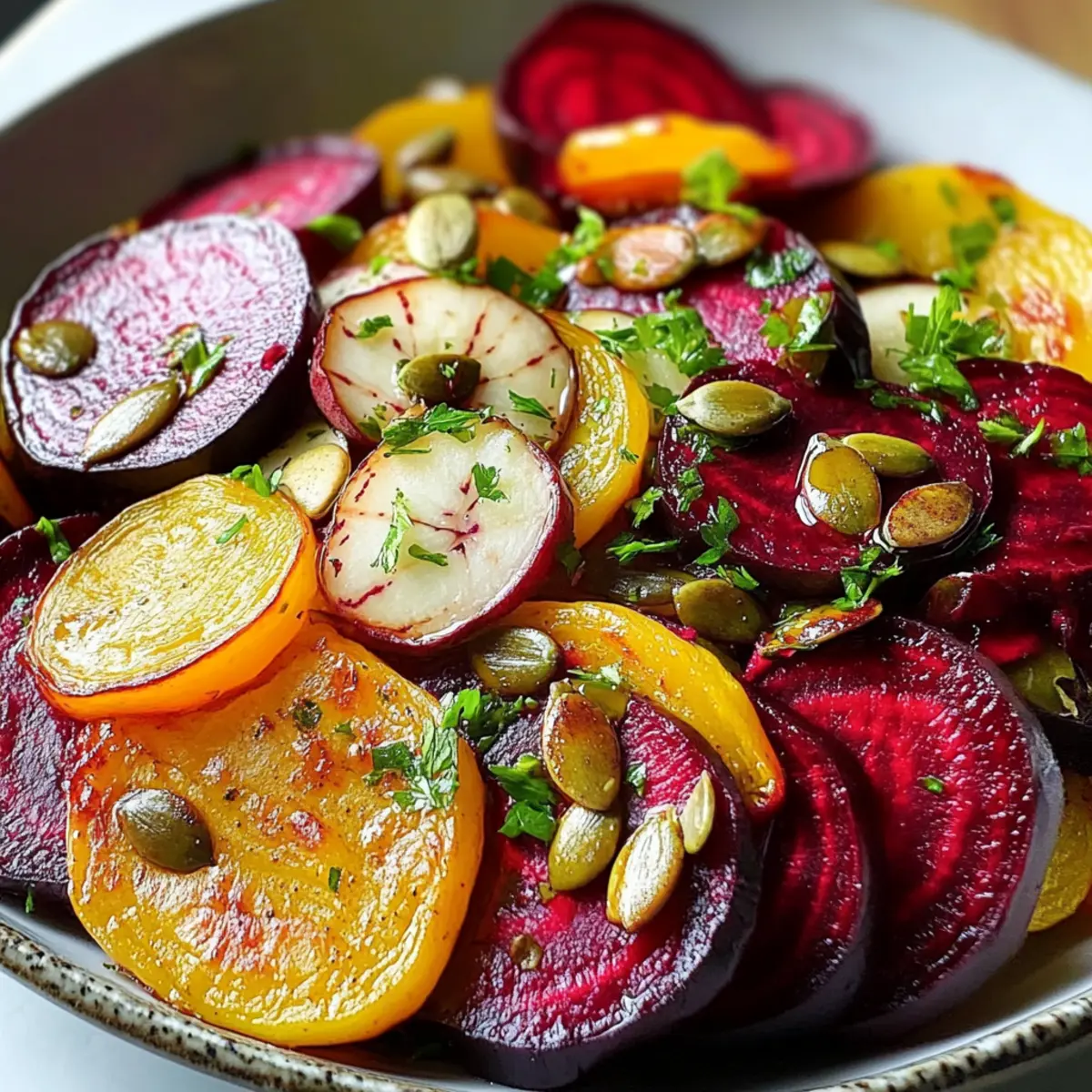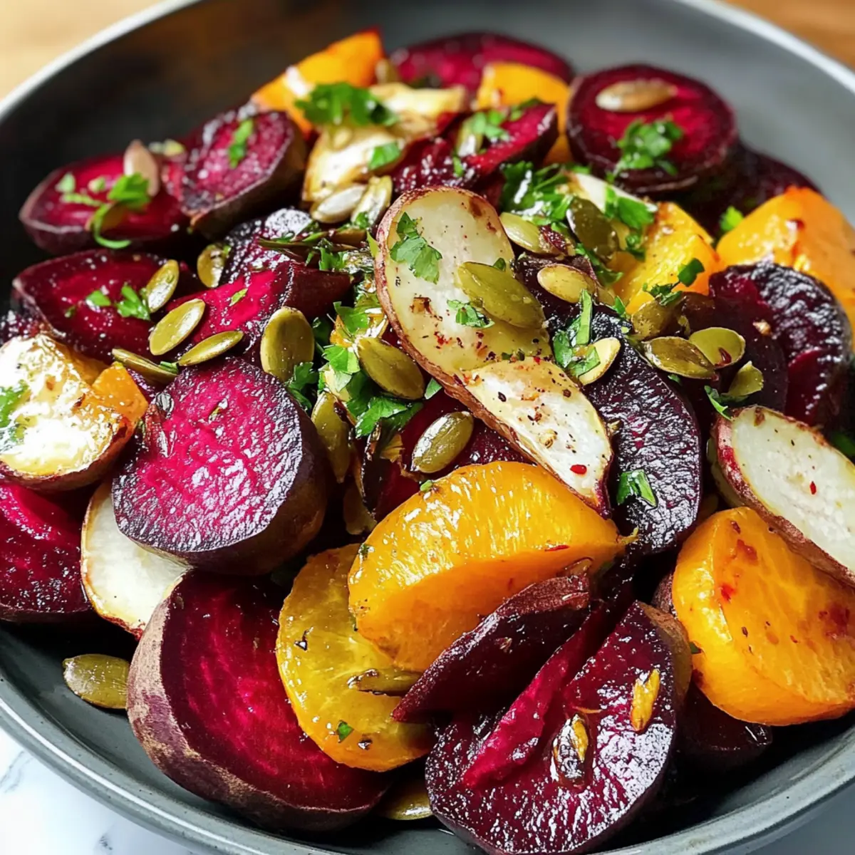 Nehme das Backblech nach insgesamt 20 Minuten aus dem Ofen, idealerweise wenn die Rüben zart und die Kürbiskerne angenehm geröstet sind. Übertrage die Rüben und Kürbiskerne sorgfältig auf eine Servierplatte. Träufle das restliche Kürbiskernöl und den Balsamico-Essig gleichmäßig über das Gemüse. Diese Schritte verleihen dem bunten Rote-Bete-Salat mit frischem Meerrettich eine schöne glänzende Note.