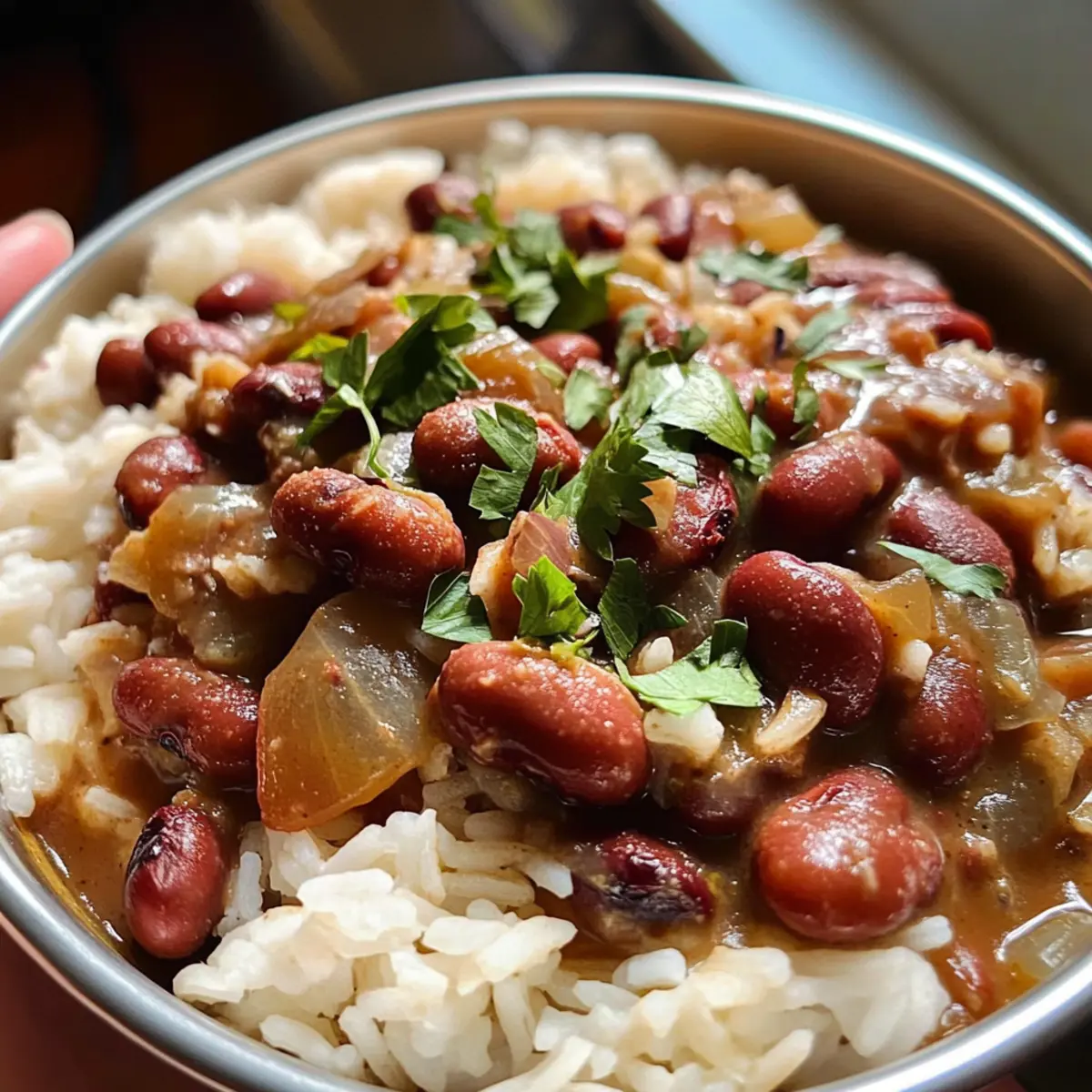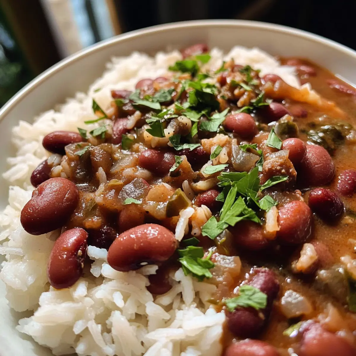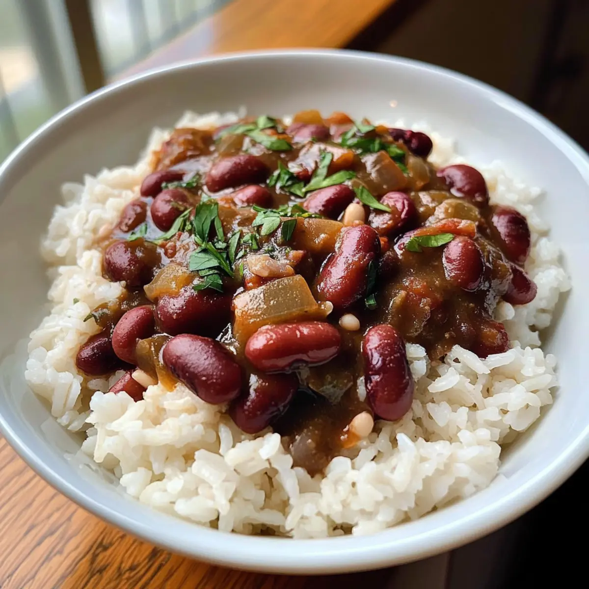Wenn der herrliche Duft von roten Bohnen und Reis durch meine Küche zieht, fühle ich mich sofort wie zuhause. Dieses klassische Southern Comfort Food ist nicht nur ein geschmackliches Erlebnis, sondern auch ein echtes Soulfood, das an kühlen Tagen für Wärme und Geborgenheit sorgt. Die Kombination aus zarten Bohnen und fluffigem Reis ist einfach unwiderstehlich und macht diese Speise zu einem Favoriten in jeder Jahreszeit. Ganz gleich, ob Sie ein schnelles Familienessen oder eine gesellige Runde mit Freunden planen, rote Bohnen und Reis lassen sich schnell zubereiten und bieten zudem eine praktische Option für alle, die etwas gesünder essen möchten. Und wenn Sie ein wenig experimentieren möchten, können Sie auch ganz einfach eine vegetarische Variante zaubern! Welche neuen Geschmäcker werden Sie diesem Gericht hinzufügen? Warum werden Sie dieses Rezept lieben? Simplicity: Die Zubereitung von roten Bohnen und Reis ist kinderleicht und benötigt keine besonderen Kochkünste. Vielseitigkeit: Ob mit oder ohne Wurst, Sie können nach Belieben variieren, beispielsweise mit einer vegetarischen Option oder verschiedenen Gewürzen. Herzhfter Genuss: Die Kombination aus zarten Bohnen und fluffy Reis bietet ein wahres Geschmackserlebnis, das Sie und Ihre Gäste begeistern wird. Familienfreundlich: Dieses Rezept ist ideal für ein schnelles Familienessen und wird sicher auch die Kleinsten am Tisch überzeugen – wer kann schon einem so herzhaften Soulfood widerstehen? Zeitersparnis: Mit der Möglichkeit, Dosenbohnen zu verwenden, sparen Sie wertvolle Zeit in der Küche, ohne auf Geschmack verzichten zu müssen. Möchten Sie etwas Abwechslung? Probieren Sie doch mal meine Orientalischer Rote Linsen als Beilage oder meinen Haehnchen Blumenkohl Reis für eine köstliche Ergänzung! Rote Bohnen und Reis Zutaten • Für die Bohnen: Kidneybohnen – die Hauptquelle für Protein und Herzhaftigkeit; Dosenbohnen sind eine zeitsparende Alternative. Olivenöl – sorgt für einen reichen Geschmack und hilft beim Anbraten; auch Pflanzenöl oder Butter sind geeignete Alternativen. Zwiebel (1 große) – sorgt für ein aromatisches Grundgerüst; kann durch Schalotten ersetzt werden, ist aber nicht zwingend notwendig. Grüne Paprika – fügt Süße und Textur hinzu; rote oder gelbe Paprika sind ebenfalls eine gute Wahl. Sellerie (2 Stangen) – trägt zum aromatischen Grundmix bei; Fennel kann hier eine interessante Abwechslung bieten. Gehackter Knoblauch (2 Esslöffel) – unverzichtbar für die Geschmacksfülle; in einem Notfall kann auch Knoblauchpulver (1 Teelöffel) verwendet werden. Lorbeerblätter (2) – unbedingt für das Aroma beim Simmern; nicht weglassen! Getrocknete Petersilie (1 Esslöffel) – verleiht den Bohnen zusätzlichen Geschmack; frische Petersilie kann zur Garnierung dienen. Getrockneter Thymian (1 Teelöffel) – für erdige Noten; kann weggelassen werden, wenn nicht vorhanden. Cajun-Gewürz (1 Teelöffel) – sorgt für Würze und Komplexität; passen Sie die Menge nach persönlichem Geschmack an. Cayennepfeffer (½ Teelöffel) – fügt Schärfe hinzu; je nach persönliche Vorliebe anpassen. Getrockneter Salbei (¼ Teelöffel) – bringt Tiefe ins Gericht; für einen leichteren Geschmack kann er weggelassen werden. Andouille-Wurst (1 Pfund, in Scheiben geschnitten) – bietet einen rauchigen Geschmack, kann jedoch durch andere Wurstarten oder Gemüse für eine vegetarische Option ersetzt werden. Wasser (6 Tassen für die Bohnen, 4 Tassen für das Kochen des Reises) – unerlässlich für die Zubereitung; bei Verwendung von Dosenbohnen und Reis die Menge anpassen. Langkornreis (2 Tassen) – dient als Basis; brauner Reis oder Quinoa sind gesunde Alternativen. Zusätzlich empfehle ich, beim Kochen von roten Bohnen und Reis gleich eine größere Menge zuzubereiten – so haben Sie immer ein köstliches Gericht parat! Schritt-für-Schritt-Anleitung für Rote Bohnen und Reis Step 1: Bohnen einweichen Legen Sie die Kidneybohnen über Nacht in eine große Schüssel mit ausreichend Wasser, um sie vollständig zu bedecken. Lassen Sie sie mindestens 8 Stunden einweichen, damit sie weich werden und beim Kochen die richtige Konsistenz erreichen. Dies ist ein wichtiger erster Schritt für das perfekte Ergebnis beim Zubereiten von roten Bohnen und Reis. Step 2: Bohnen kochen Gießen Sie das Einweichwasser ab und geben Sie die Bohnen in einen großen Topf. Fügen Sie 6 Tassen frisches Wasser, 2 Lorbeerblätter, 1 Esslöffel getrocknete Petersilie, 1 Teelöffel getrockneten Thymian, 1 Teelöffel Cajun-Gewürz, ½ Teelöffel Cayennepfeffer und ¼ Teelöffel getrockneten Salbei hinzu. Bringen Sie alles zum Kochen und reduzieren Sie dann die Hitze auf niedrig. Lassen Sie die Bohnen 1 Stunde lang sanft köcheln, bis sie zart sind. Step 3: Gemüse anbraten Während die Bohnen kochen, erhitzen Sie 2 Esslöffel Olivenöl in einer separaten Pfanne bei mittlerer Hitze. Fügen Sie 1 große gehackte Zwiebel, 1 gewürfelte grüne Paprika und 2 Stangen gehackten Sellerie hinzu. Braten Sie das Gemüse unter gelegentlichem Rühren etwa 5-7 Minuten lang an, bis es weich und aromatisch ist. Schließlich fügen Sie 2 Esslöffel gehackten Knoblauch hinzu und braten Sie ihn für weitere 1-2 Minuten an, bis er duftet. Step 4: Wurst hinzufügen In die Pfanne mit dem angebratenen Gemüse geben Sie 1 Pfund in Scheiben geschnittene Andouille-Wurst. Braten Sie die Wurst bei mittlerer Hitze 5-7 Minuten lang an, bis sie schön gebräunt ist. Dies gibt der Mischung einen würzigen und rauchigen Geschmack, der perfekt zu den roten Bohnen und Reis passt. Step 5: Mischungen kombinieren Gießen Sie die angebratene Wurst-Gemüse-Mischung in den Topf mit den gekochten Bohnen. Rühren Sie das Ganze gut durch und lassen Sie es weitere 30 Minuten bei niedriger Hitze köcheln. Diese zusätzliche Kochzeit ermöglicht es den Aromen, sich perfekt zu verbinden und zu intensivieren. Step 6: Reis kochen Während die Kombination aus B