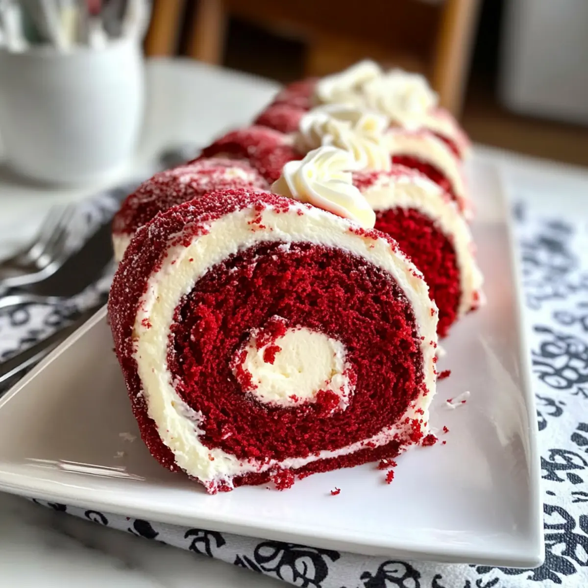 Es gibt kaum etwas Befriedigenderes, als beim Backen einen traumhaften Rotvelvet-Kuchenrolle zu kreieren, die sowohl das Auge als auch den Gaumen verführt. Mit ihrer leuchtend roten Farbe und der fluffigen Textur ist diese köstliche Leckerei nicht nur ein Fest für die Sinne, sondern auch der perfekte Hingucker bei festlichen Anlässen wie Weihnachten oder Valentinstag. Die Kombination aus zarter Schokoladennote und einer himmlischen Frischkäse-Frostingfüllung macht sie zu einem echten Publikumsmagneten. Und das Beste? Diese Kreiation ist schnell und einfach zubereitet, sodass du mehr Zeit mit deinen Liebsten verbringen kannst. Bist du bereit, diese süße Verführung in deiner eigenen Küche zu kreieren? Was macht diese Rotvelvet-Kuchenrolle besonders? Ein Blickfang: Die leuchtend rote Farbe zieht jeden Blick auf sich und sorgt für staunende Gesichter bei deinen Gästen. Himmlischer Geschmack: Die Kombination aus fluffigem Teig und cremiger Frischkäsefüllung ist ein wahres Geschmackserlebnis. Einfach zu machen: Die Zubereitung ist unkompliziert, perfekt für Backanfänger und Profis gleichermaßen. Vielseitige Variationen: Ob mit Minze oder Zitrusfrüchten – diese Kuchenrolle lässt sich vielseitig abwandeln. Ideal für Feiern: Diese süße Leckerei ist der perfekte Abschluss für festliche Anlässe, sei es zu Weihnachten oder Valentinstag. Schnell zubereitet: Ein Genuss, der dir mehr Zeit mit deinen Liebsten schenkt – schnell gemacht und voller Liebe! Rotvelvet-Kuchenrolle Zutaten Für den Teig Allzweckmehl – sorgt für die Struktur der Kuchenrolle, kann durch glutenfreies Mehl ersetzt werden. Ungesüßtes Kakaopulver – verleiht eine subtile Schokoladennote, verwende niederländisches Kakaopulver für intensiviertem Geschmack. Backpulver – sorgt für die leichte Textur des Teigs, achte darauf, dass es frisch ist. Salz – balanciert die Süße und hebt die Aromen hervor. Große Eier – erhöhen die Feuchtigkeit und Struktur, Zimmertemperatur sorgt für besseres Steigen. Zucker – süßt den Teig und sorgt für einen zarten Crumb. Öl (Raps- oder Pflanzenöl) – sorgt für Feuchtigkeit, kann durch geschmolzenes Kokosöl ersetzt werden. Buttermilch – macht den Teig zart und geschmackvoll, kann durch Milch + Essig oder Zitronensaft ersetzt werden. Weißer Essig – reagiert mit dem Backpulver für eine lockerere Textur, empfohlen aber optional. Vanilleextrakt – verstärkt den Geschmack des Kuchens. Rote Lebensmittelfarbe – sorgt für die charakteristische rote Farbe, Gel-Lebensmittelfarbe liefert einen lebendigeren Effekt. Für die Füllung Frischkäse (gekühlt) – Hauptbestandteil der Füllung, kalter Frischkäse erhält die Struktur der Füllung. Butter (Zimmertemperatur) – sorgt für Cremigkeit und Reichtum in der Füllung. Puderzucker – süßt die Füllung und stabilisiert sie. Vanille (für die Füllung) – fügt weiteren Geschmack zur Frischkäsefüllung hinzu. Diese Rotvelvet-Kuchenrolle wird nicht nur deine Sinne erfreuen, sondern auch deine Familie und Freunde beim nächsten Festmahl begeistern! Schritt-für-Schritt-Anleitung für die Rotvelvet-Kuchenrolle Step 1: Backofen vorheizen und Blech vorbereiten Heize deinen Backofen auf 175°C vor und bereite ein 15×10 Zoll großes Backblech mit Backpapier vor. Das Backpapier sorgt dafür, dass der Teig nicht anklebt und erleichtert das spätere Rollen. Stelle sicher, dass das Blech gleichmäßig ausgelegt ist, damit die Rotvelvet-Kuchenrolle gleichmäßig backt. Step 2: Trockene Zutaten sieben Siebe in eine große Schüssel das Allzweckmehl, ungesüßtes Kakaopulver, Backpulver und Salz miteinander. Das Sieben sorgt dafür, dass keine Klumpen entstehen und die trockenen Zutaten gut vermischt sind. Diese Mischung ist die Basis für die fluffige Textur deiner Rotvelvet-Kuchenrolle, die du gleich zubereiten wirst. Step 3: Eier und Zucker mixen Gib die großen Eier in eine Rührschüssel und schlage sie mit einem Mixer für etwa 5 Minuten, bis sie schaumig und leicht werden. Füge dann langsam den Zucker und das Öl hinzu und rühre weiter, bis alle Zutaten gut vermischt sind. Diese Grundlage verleiht der Rotvelvet-Kuchenrolle die nötige Süße und Feuchtigkeit. Step 4: Feuchte Zutaten einrühren Mische die Buttermilch, den weißen Essig, den Vanilleextrakt und die rote Lebensmittelfarbe in die Eier-Zucker-Mischung ein. Rühre alles gut durch, bis eine gleichmäßige Masse entsteht. Die rote Lebensmittelfarbe gibt der Rotvelvet-Kuchenrolle ihre charakteristische Färbung und sorgt für den festlichen Look. Step 5: Trockene Zutaten einarbeiten Falte nun die gesiebte Mehlmischung vorsichtig unter die feuchte Masse, bis alles gerade so kombiniert ist. Achte darauf, nicht zu lange zu rühren, damit die Luftigkeit des Teiges erhalten bleibt. Gieße den Teig anschließend gleichmäßig auf das vorbereitete Blech und streiche ihn mit einem Spatel glatt. Step 6: Backen Schiebe das Blech in den vorgeheizten Ofen und backe die Rotvelvet-Kuchenrolle für 13-15 Minuten. Achte darauf, dass der Kuchen fertig ist, wenn die Oberfläche leicht zurückspringt, wenn du sie sanft berührst. Während des Backens entsteht der wunderbare aromatische Duft, der dich schon jetzt auf die Leckerei einstimmt. Step 7: Abkühlen und Rollen Lasse den Kuchen nach dem Backen für 3 Minuten auf der Arbeitsfläche abkühlen. Danach rolle den noch warmen Kuchen vorsichtig mit dem Backpapier zusammen, um einen logartigen Effekt zu erzielen. Lass ihn vollständig abkühlen; dies hilft, Risse zu vermeiden, wenn du die Füllung hinzufügst. Step 8: Füllung zubereiten Schlage den kalten Frischkäse und die Zimmertemperatur-Butter in einer Schüssel zusammen, bis die Mischung schön cremig ist. Füge dann den Puderzucker und den Vanilleextrakt hinzu und rühre weiter, bis eine glatte und geschmeidige Füllung entsteht. Diese Füllung wird der Höhepunkt deiner Rotvelvet-Kuchenrolle. Step 9: Füllung auftragen und neu rollen Nachdem die Kuchenroll