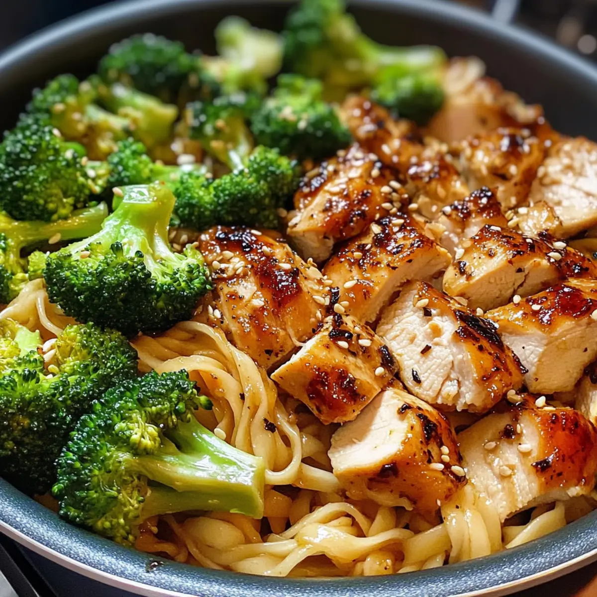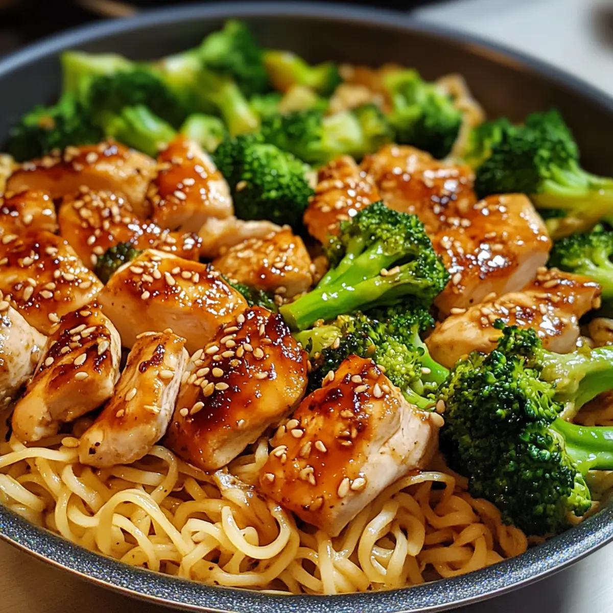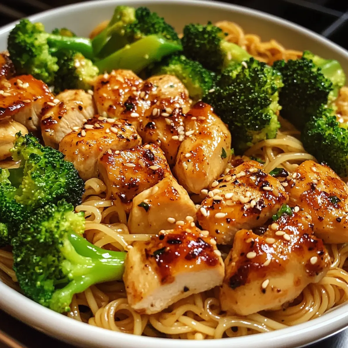 In einem kleinen freundlichen Café, umgeben von frischem Gemüse und dem verlockenden Duft von gebratenem Knoblauch, kam mir die Idee für mein neuestes Gericht: Scharfes Knoblauch-Hühnchen und Brokkoli-Nudelschalen. Dieses Rezept vereint zartes Hühnchen, knackigen Brokkoli und perfekt gekochte Nudeln in einer würzigen Knoblauchsauce – und das alles in nur 35 Minuten! Egal, ob du nach einer schnellen Lösung für hektische Wochentage suchst oder einfach mal Lust auf ein geschmackvolles Gericht hast, diese eine Pfanne wird dich und deine Liebsten begeistern. Diese köstliche und glutenfreie Mahlzeit ist nicht nur einfach zuzubereiten, sondern auch ein echter Hingucker, der das Gefühl von Takeaway nach Hause bringt. Bist du bereit, den Kochlöffel zu schwingen und gemeinsam in dieses aufregende Rezept einzutauchen? Warum wirst du dieses Rezept lieben? Einfachheit pur: Die Zubereitung ist unkompliziert und erfordert nur grundlegende Kochfähigkeiten. Köstlicher Geschmack: Die Kombination aus Hühnchen, Brokkoli und würziger Knoblauchsauce sorgt für ein Geschmackserlebnis, das begeistert. Vielseitigkeit: Du kannst das Rezept leicht anpassen, indem du Gemüse wie Paprika oder Karotten hinzufügst oder statt Hühnchen Tofu verwendest. Perfekte Zeitersparnis: In nur 35 Minuten genießt du ein frisches, selbstgekochtes Gericht, das perfekt für hektische Abende ist. Crowd-Pleaser: Ob für die Familie oder Gäste, jeder wird von diesem bunten und schmackhaften Gericht begeistert sein. Dieses Gericht ist nicht nur eine willkommene Abwechslung zu Fast Food, sondern bietet dir auch eine großartige Möglichkeit, deine Küchenfertigkeiten zu zeigen. Wenn du mehr über gesunde Mahlzeiten erfahren möchtest, schau dir auch unsere Gesunde Rezeptideen für die ganze Familie an. Scharfes Knoblauch-Hühnchen und Brokkoli-Nudelschalen Zutaten Hinweis: Hier sind die Zutaten, die du für dieses köstliche Gericht benötigst – ideal für eine glutenfreie, schnelle Mahlzeit! Für die Nudeln: Nudeln – Die Grundlage des Gerichts; du kannst sie durch Reisnudeln oder Soba-Nudeln ersetzen, um deinen Vorlieben gerecht zu werden. Für das Hühnchen: Hühnchenbrust – Der Hauptbestandteil, der für Herzhaftigkeit sorgt; verwende auch Hühnchenschenkel für eine saftigere Variante. Für das Gemüse: Brokkoliröschen – Fügen Frische und Farbe hinzu, während sie den Nährwert erhöhen; andere Gemüse wie Paprika oder Karotten können für mehr Vielfalt hinzugefügt werden. Für die Sauce: Olivenöl – Ein gutes Kochfett, das beim Anbraten den Geschmack entfaltet; du kannst auch Sesamöl für einen asiatischen Akzent nutzen. Gehackter Knoblauch – Liefert das aromatische Hauptaroma; frischer Knoblauch wird empfohlen, aber Knoblauchpulver ist ein schneller Ersatz. Sojasoße – Sorgt für salzige und umami-reiche Tiefe; verwende glutenfreie Sojasoße für glutenfreie Diäten. Chilipaste – Fügt Schärfe hinzu; passe die Menge nach deinem Geschmack an, Sriracha oder Sambal Oelek sind auch tolle Alternativen. Salz und Pfeffer – Würze nach Geschmack, um das Aromenprofil zu balancieren; essenziell für ein köstliches Ergebnis. Die richtige Zusammenstellung dieser Zutaten wird dir helfen, die perfekte Portion Scharfes Knoblauch-Hühnchen und Brokkoli-Nudelschalen zuzubereiten! Schritt-für-Schritt-Anleitung für Scharfes Knoblauch-Hühnchen und Brokkoli-Nudelschalen Step 1: Nudeln kochen Bringe einen großen Topf mit gesalzenem Wasser zum Kochen. Füge die Nudeln hinzu und koche sie gemäß den Anweisungen auf der Verpackung für etwa 8-10 Minuten, bis sie al dente sind. Wenn sie fertig sind, gieße sie ab, lasse sie aber leicht unterkocht, und stelle sie beiseite, um ein Verkleben zu verhindern. Step 2: Öl erhitzen Erhitze in einer großen Pfanne bei mittlerer Hitze 2 Esslöffel Olivenöl, bis es schimmert. Achte darauf, dass das Öl heiß genug ist, aber nicht raucht, um ein optimales Braten zu gewährleisten. Dies ist der perfekte Zeitpunkt, um den würzigen Aroma von Scharfem Knoblauch-Hühnchen und Brokkoli-Nudelschalen zu entfalten. Step 3: Knoblauch anbraten Füge 3-4 Gehakte Knoblauchzehen in die Pfanne hinzu und brate sie für etwa 30 Sekunden an, bis sie goldbraun und aromatisch sind. Pass auf, dass der Knoblauch nicht verbrennt, da dies den Geschmack beeinträchtigen kann. Die köstlichen Aromen werden sofort freigesetzt und bereiten auf den nächsten Schritt vor. Step 4: Hühnchen braten Gib 500g in Stücke geschnittene Hühnchenbrust in die Pfanne und brate sie für 5-7 Minuten an. Rühre ständig um, damit das Hühnchen gleichmäßig bräunt und durchgegart ist, bis es eine goldene Farbe hat und nicht mehr rosa erscheint. Diese saftigen Stücke werden das Grundgerüst für das Gericht bilden. Step 5: Brokkoli hinzufügen Jetzt kommt der frische Brokkoli! Füge 200g Brokkoliröschen in die Pfanne hinzu und brate sie für 3-4 Minuten mit, bis sie leuchtend grün und zart, aber dennoch knackig sind. Achte darauf, die Zutaten gut zu vermengen, damit das Gemüse gleichmäßig gegart wird und perfekt zu deinem Scharfen Knoblauch-Hühnchen passt. Step 6: Sojasauce und Chilipaste einrühren Gieße 4 Esslöffel Sojasauce und 2 Esslöffel Chilipaste über das Hühnchen und die Brokkoli-Nudelschalen-Mischung. Rühre gründlich, sodass alle Zutaten gleichmäßig mit der würzigen Sauce überzogen sind. Lass alles kurz köcheln, sodass sich die Aromen gut verbinden, ca. 1-2 Minuten. Step 7: Nudeln unterheben Nun ist es Zeit, die vorbereiteten Nudeln hinzuzufügen! Gib die abgetropften Nudeln in die Pfanne und wirf alles zusammen, bis die Nudeln gleichmäßig mit der Sauce vermischt sind. Rühre für 2-3 Minuten, damit die Nudeln die köstlichen Aromen aufnehmen können und ihr die volle Geschmackstiefe des Scharfen Knoblauch-Hühnchens genießen könnt. Step 8: Abschmecken und servieren Schmecke die Mischung abschließend mit Salz und Pfeffer ab, um die Aromen zu balancieren. Serviere das Gericht hei