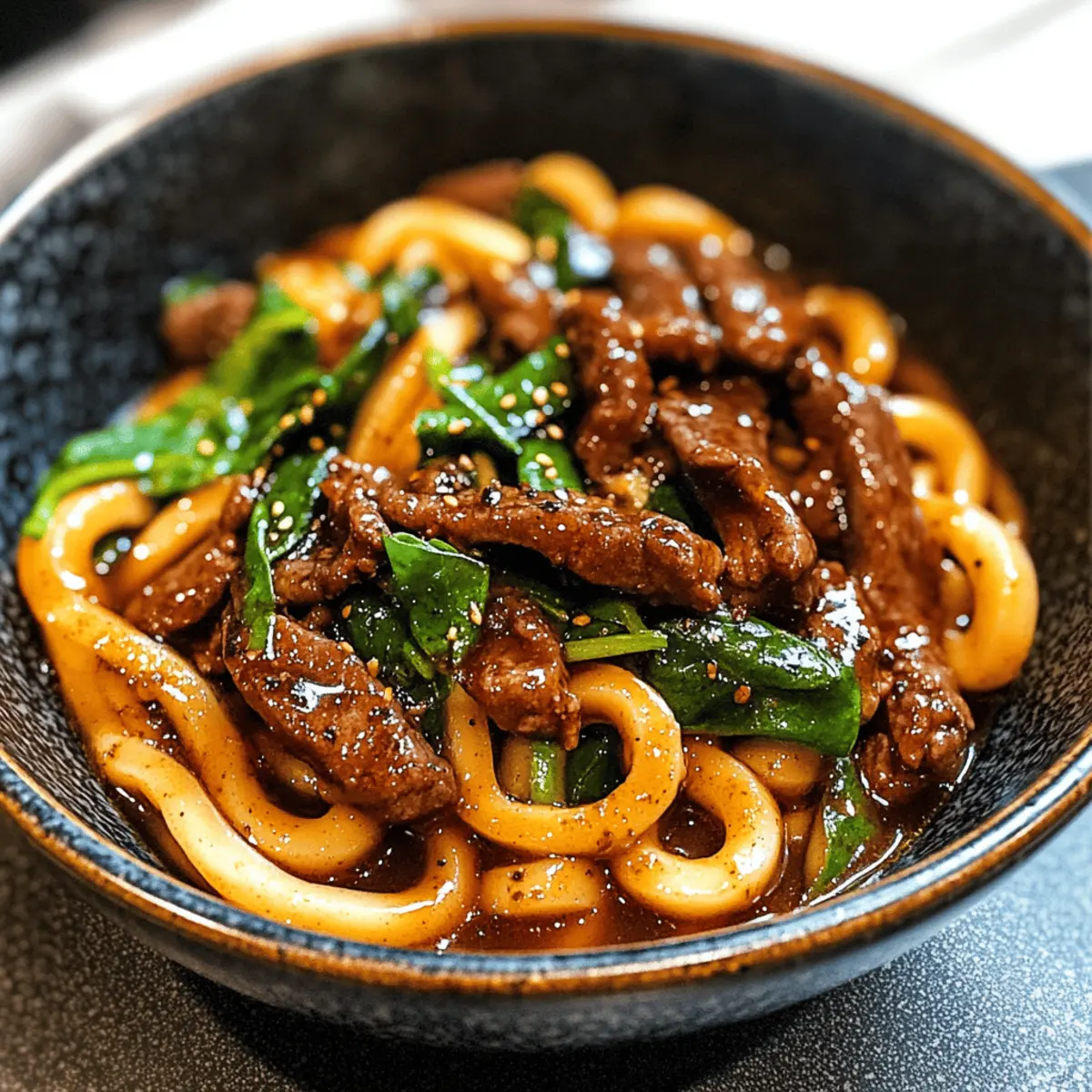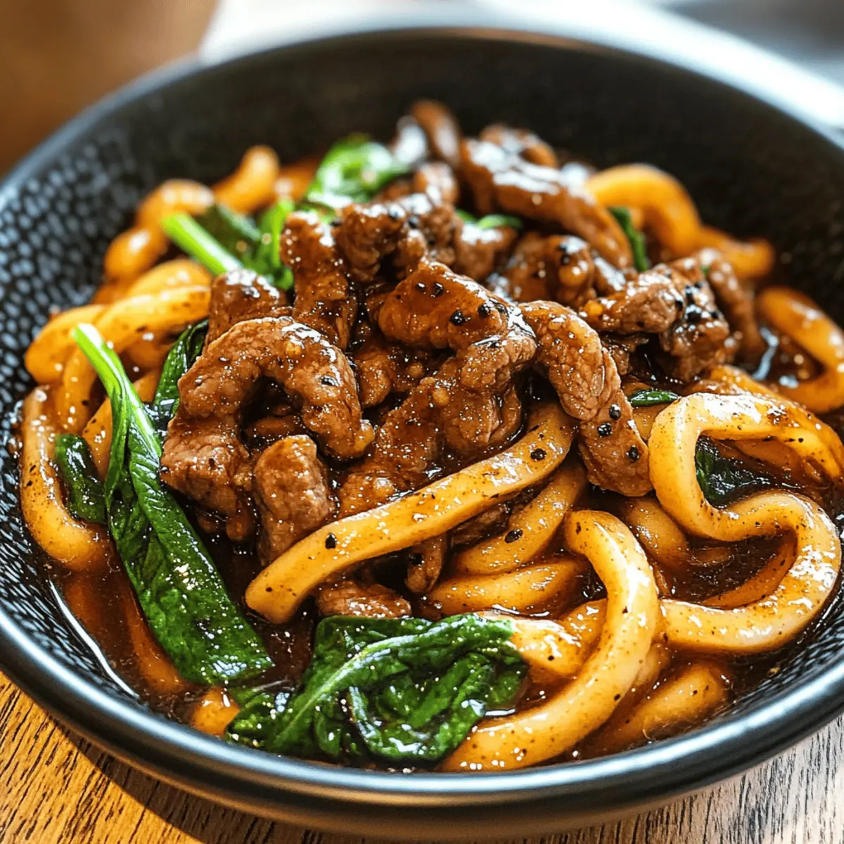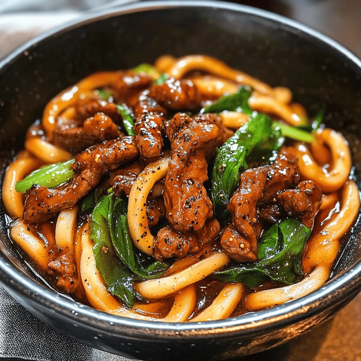 Es ist einer dieser Abende, an denen ich einfach keine Zeit zum Kochen habe, aber unbedingt etwas Köstliches auf den Tisch bringen möchte. Genau hier kommen die Schwarzen Pfeffer Rindfleisch Udon Nudeln ins Spiel – eine wahre Rettung für alle, die in weniger als 15 Minuten ein schmackhaftes Gericht auf den Tisch zaubern wollen! Diese einfach zuzubereitenden Udon Nudeln bieten die perfekte Kombination aus zartem Rindfleisch, frischen Gemüse und einer würzigen schwarzen Pfeffersauce, die für einen tollen Umami-Geschmack sorgt. Ob unter der Woche oder für eine schnelle Mittagspause, dieses Gericht ist nicht nur ein Publikumsliebling, sondern auch ein Genuss für alle, die frische, hausgemachte Küche lieben. Neugierig, wie du dieses asiatische Highlight selbst zubereiten kannst? Lass uns direkt loslegen! Warum sind die Schwarzer Pfeffer Rindfleisch Udon Nudeln einzigartig? Schnelle Zubereitung: In nur 15 Minuten kannst du ein köstliches Gericht genießen, das selbst an den hektischsten Abenden perfekt ist. Reichhaltiger Geschmack: Die Kombination aus zartem Rindfleisch und würziger schwarzer Pfeffersauce verleiht deinem Gaumen ein wahres Geschmackserlebnis. Vielseitigkeit: Du kannst die Nudeln ganz nach deinem Geschmack anpassen, indem du Gemüse wie Paprika oder Spinat hinzufügst. Gesunde Wahl: Dieses Gericht bietet eine ausgewogene Mischung aus Proteinen, Kohlenhydraten und Ballaststoffen. Frisch und Hausgemacht: Vergiss den Fast Food-Langweiler – die Schwarzen Pfeffer Rindfleisch Udon Nudeln sind eine schmackhafte und befriedigende Alternative, die alle begeistern wird, die frisch zubereitete Hausmannskost lieben. Hol dir diese schnelle Inspiration und entdecke auch unsere anderen Rezepte wie Mediterrane Rindfleisch Bowls oder Rindfleisch Paprika Reis! Schwarzer Pfeffer Rindfleisch Udon Nudeln Zutaten • Um deine Geschmacksnerven zu kitzeln, hier die Zutaten für die leckeren Schwarzen Pfeffer Rindfleisch Udon Nudeln: Für die Nudeln • Frische Udon (200g) – Hauptbestandteil mit einer schmackhaften, bissfesten Textur; frische Varianten sind ideal, da sie keine Vorbehandlung benötigen. Für das Rindfleisch • Shabu Shabu Rindfleisch (100g) – Zart und schnell zu garen, ideal für ein schnelles Kochen. Alternativ kann auch Rinderlende verwendet werden. Für das Gemüse • Zwiebel (1/2) – Gibt dem Gericht Süße und Tiefe; kann durch Schalotten ersetzt werden, wenn du einen milderen Geschmack bevorzugst. • Knoblauch (1 TL, gehackt) – Verleiht dem Gericht eine aromatische Note. Frisch ist am besten, aber Knoblauchpulver geht auch im Notfall. • Ingwer (1/2 TL, gehackt, optional) – Fügt eine angenehme Wärme hinzu; kann durch gemahlenen Ingwer ersetzt werden. • Chye Sim oder Blattgemüse (nach Geschmack) – Bringt Frische und Nährstoffe; nutze jede verfügbare Variante wie Spinat oder Pak Choi. Für die Sauce • Dunkle Sojasauce (1/4 Tasse oder Kicap Manis) – Sorgt für eine reichhaltige Farbe und komplexen Geschmack; Kicap Manis ist für eine süßere Note empfehlenswert. • Austernsauce (1 TL) – Verstärkt die Umami-Noten; für eine vegetarische Variante einfach weglassen. • Tomatenmark (1 EL) – Fügt Süße und Fülle hinzu; kann auch durch Ketchup ersetzt werden. • Schwarzer Pfeffer (2 TL, nach Geschmack) – Hauptgewürz für die Schärfe; frisch gemahlen sorgt für den besten Geschmack. • Wasser (1 Tasse) – Unterstützt das Kochen der Nudeln und hilft, die Sauce zu binden. • Maisstärke-Slurry (2 TL Maisstärke + Wasser) – Dient zum Andicken der Sauce. Schritt-für-Schritt-Anleitung für Schwarzer Pfeffer Rindfleisch Udon Nudeln Step 1: Nudeln vorbereiten Bringe einen Topf mit Wasser zum Kochen und blanchiere die frischen Udon-Nudeln für etwa 1-2 Minuten, bis sie locker und heiß sind. Wenn du verpackte Udon verwendest, kannst du sie später direkt zur Sauce hinzufügen. Danach die Nudeln abtropfen lassen und beiseite stellen, während du die Sauce zubereitest. Step 2: Aromastoffe anbraten Erhitze in einer großen Pfanne 2 Esslöffel Öl bei mittelhoher Hitze. Gib die gewürfelte Zwiebel, den gehackten Knoblauch und optional den gehackten Ingwer hinzu. Brate alles unter Rühren für etwa 2-3 Minuten an, bis die Zwiebeln weich und durchsichtig sind und die Mischung aromatisch duftet. Step 3: Rindfleisch hinzufügen Füge das Shabu Shabu Rindfleisch in die Pfanne und brate es für 2-3 Minuten an, bis es außen schön gebräunt ist. Achte darauf, dass es nicht zu lange gart, damit das Fleisch zart bleibt. Rühre häufig um, sodass es gleichmäßig bräunt und nicht anbrennt. Step 4: Sauce zubereiten Gib die dunkle Sojasauce, Austernsauce, Tomatenmark und den schwarzen Pfeffer in die Pfanne. Mische alles gut mit einem Holzlöffel für etwa 1-2 Minuten, bis die Sauce homogen ist und köchelt. Der aromatische Duft wird sich in der Küche verbreiten und macht Lust auf die nächsten Schritte. Step 5: Nudeln kombinieren Füge die blanchierten Udon-Nudeln in die Pfanne und werfe sie in der Sauce, sodass sie gleichmäßig bedeckt sind. Gieße eine Tasse Wasser hinzu, um die Nudeln weiter zu garen und die Sauce zu lockern. Rühre alles gründlich um, damit die Sauce gut in die Nudeln eindringen kann. Step 6: Sauce andicken Bereite die Maisstärke-Slurry vor, indem du 2 Teelöffel Maisstärke mit etwas Wasser vermischst. Rühre die Mischung in die Pfanne ein und koche sie für 1-2 Minuten weiter, bis die Sauce glänzend und dicklich wird. Sie sollte die Nudeln gut umhüllen und einen köstlichen Glanz haben. Step 7: Gemüse hinzufügen Gib das Chye Sim oder dein bevorzugtes Blattgemüse in die Pfanne und rühre vorsichtig um. Lasse das Gemüse für etwa 1-2 Minuten mitgaren, bis es gerade verwelkt, aber noch lebendig grün bleibt. Dies bringt Frische und Nährstoffe in deine Schwarzer Pfeffer Rindfleisch Udon Nudeln. Step 8: Servieren Verteile die Schwarzer Pfeffer Rindfleisch Udon Nudeln auf Tellern und garniere sie nach Wunsch mit zusätzlic
