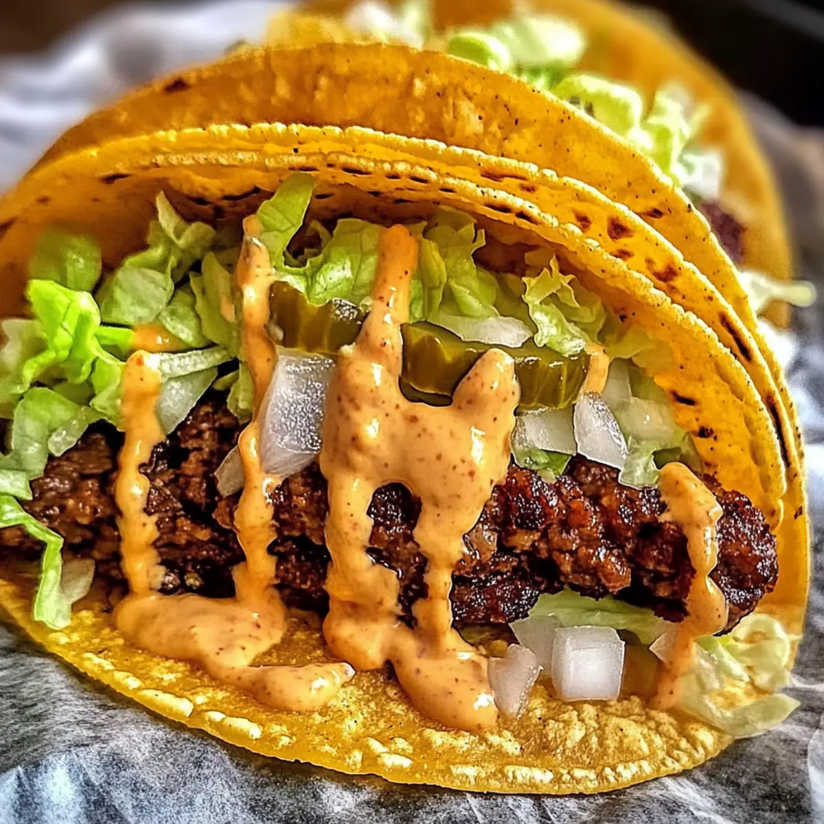 Verteile die Burger-Sauce gleichmäßig auf jedem Taco und füge deine gewünschten Toppings wie Salat, Zwiebeln und Gurken hinzu. Diese Ergänzungen verleihen deinen Smash Burger Tacos noch mehr Geschmack und Textur.