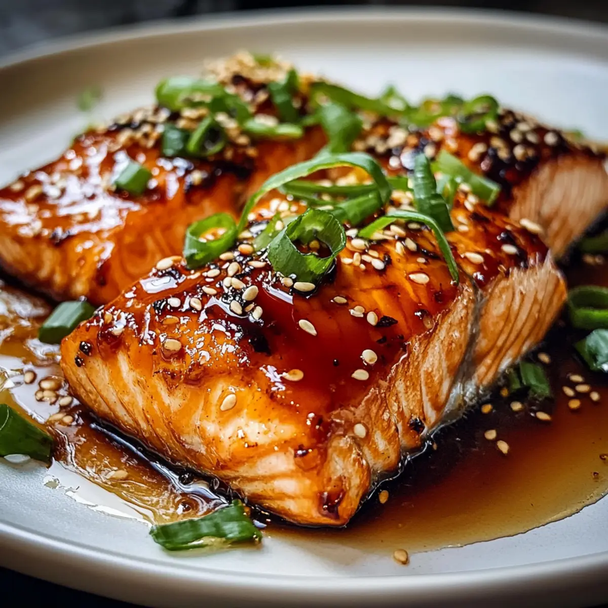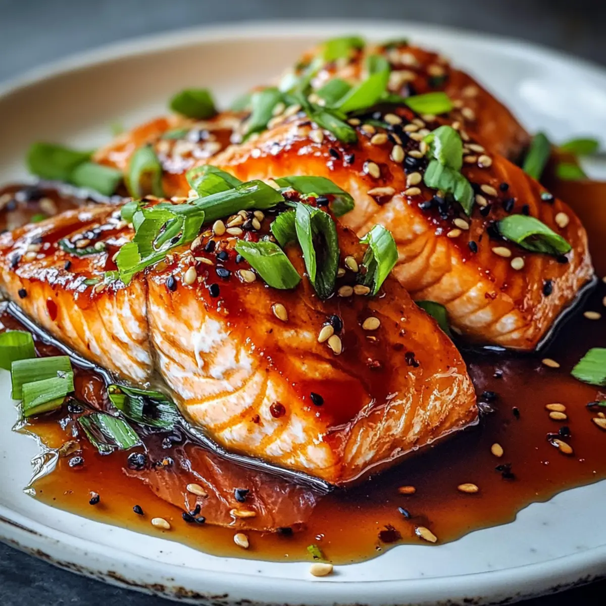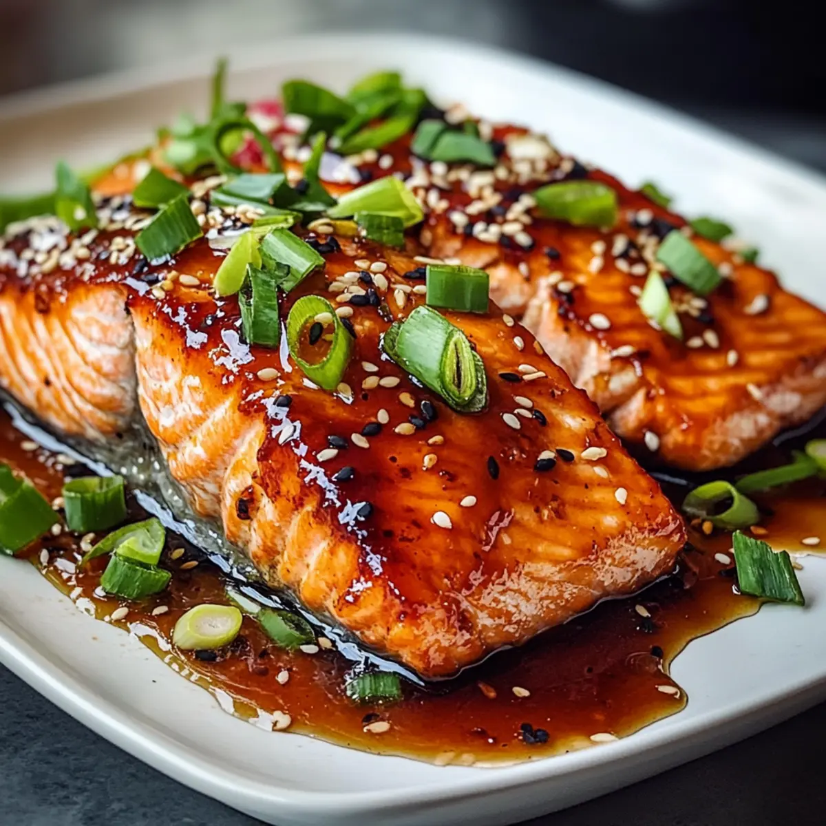Sobald der Lachs fertig gebacken ist, nimm ihn aus dem Ofen und träufle die erwärmte Glasur über die Filets. Garniere das Gericht mit den in Scheiben geschnittenen Frühlingszwiebeln und, falls gewünscht, mit Sesamsamen. Diese letzten Schritte verleihen dem Gericht einen frischen und ansprechenden Look.