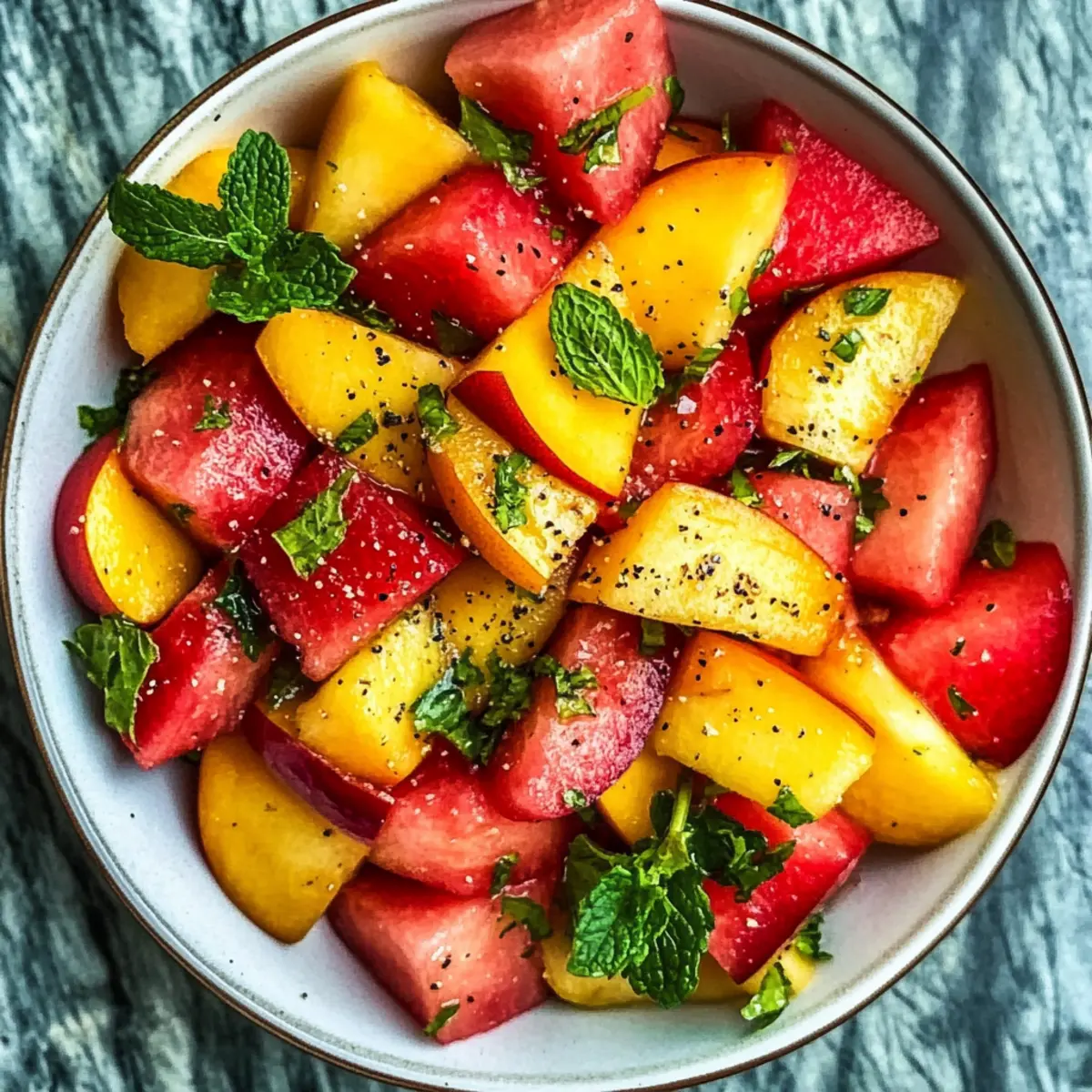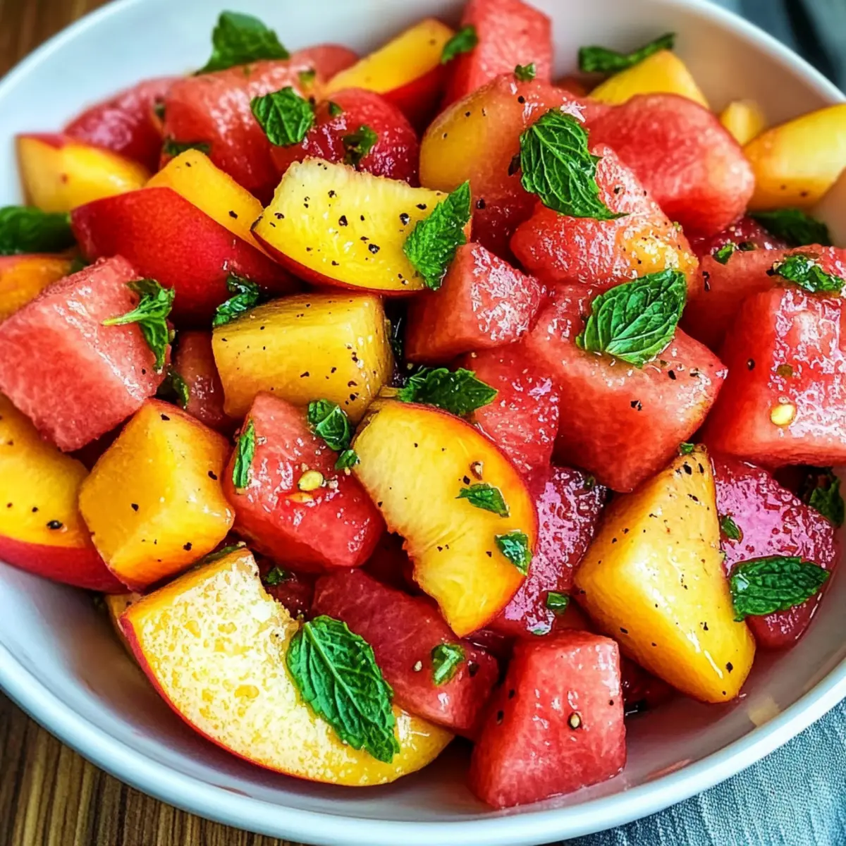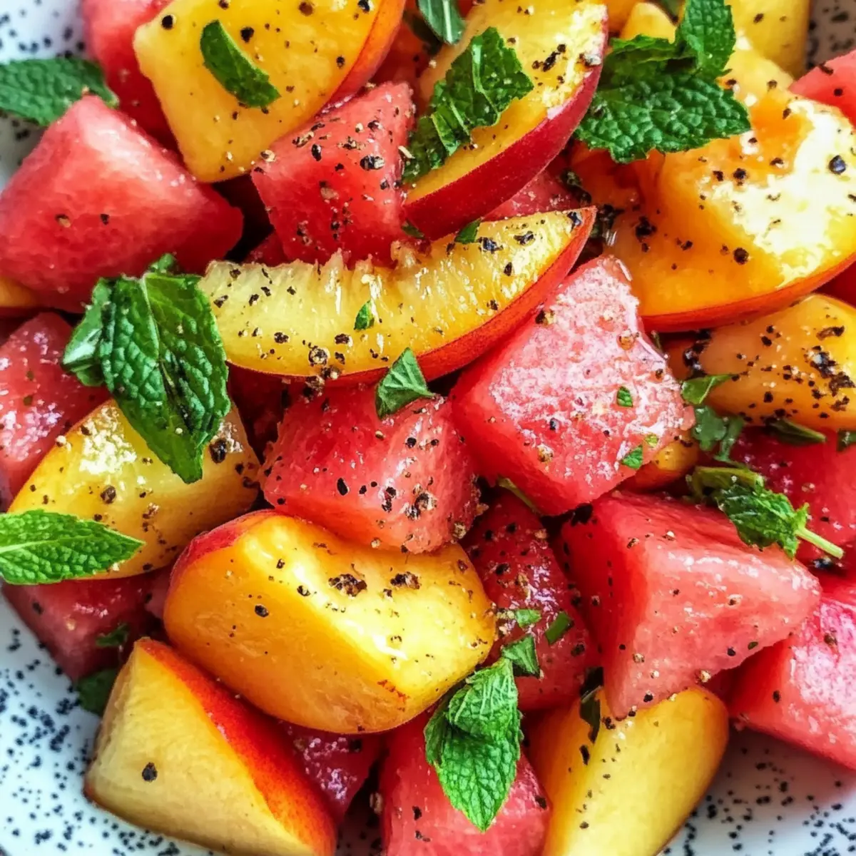 Jedes Mal, wenn die Temperaturen steigen und die Sonne strahlt, möchte ich mich in erfrischenden Geschmackserlebnissen verlieren – genau wie bei diesem Sommer Pfirsich Wassermelonen Salat! Mit saftigen, süßen Pfirsichen und knuspriger, erfrischender Wassermelone zaubert dieses Rezept ein Stück Sommer direkt in deine Schüssel. In nur 10 bis 15 Minuten zubereitet, ist es nicht nur eine perfekte Ergänzung für Grillpartys und Picknicks, sondern auch eine nahrhafte, glutenfreie und vegane Option, die hydratisiert und belebt. Die Kombination aus frischer Minze und einem Spritzer Zitrusfrüchten bringt jeden Bissen zum Leben und entfaltet eine Leichtigkeit, die für die warmen Tage ideal ist. Bist du bereit, diesen Sommer mit fruchtigen Aromen zu erhellen? Lass uns loslegen! Warum ist dieser Salat so besonders? Erfrischend und leicht: Dieser Sommer Pfirsich Wassermelonen Salat ist perfekt für heiße Tage und bietet eine knusprige, saftige Textur, die erfrischt und belebt. Schnelle Zubereitung: In nur 10-15 Minuten zubereitet, ist er ideal für spontane Grillpartys oder Picknicks. Gesund und nährstoffreich: Mit einer Kombination aus glutenfreien und veganen Zutaten ist er eine gesunde Wahl für alle, die bewusster essen möchten. Vielfältig einsetzbar: Verwandle ihn in eine Hauptspeise, indem du Quinoa hinzufügst oder ihn mit grilltem Hähnchen kombinierst. Optisch beeindruckend: Die bunten Farben machen diesen Salat zu einem echten Hingucker auf jedem Tisch, der garantiert Begeisterung auslöst! Sommer Pfirsich Wassermelonen Salat Zutaten Schnelle und einfache Zutatenliste für ein erfrischendes Erlebnis! Für die Früchte: Pfirsiche – sorgen für Süße und eine saftige Textur; wähle reife Freestone-Sorten für einfaches Schneiden. Wassermelone – liefert Hydration und einen knackigen Biss; greife zu saftigen, kernlosen Melonen mit einer cremigen gelben Stelle für optimale Reife. Frische Minze – bringt eine kühle Frische; wähle Spearmint für einen milderen Geschmack, um die anderen Aromen nicht zu überlagern. Für das Dressing: Zitronen-/Limettensaft – verstärkt die Aromen ohne zu überwältigen; passe die Menge nach deinem Geschmack an. Olivenöl (optional) – fügt Reichhaltigkeit hinzu; kann durch zusätzliches Zitrussaft ersetzt werden, um es leichter zu halten. Meersalz & frisch gemahlener schwarzer Pfeffer – hebt den Geschmack hervor und balanciert die Süße des Salats perfekt. Die genussvollen Zutaten machen diesen Sommer Pfirsich Wassermelonen Salat zu einer wahren Freude! Schritt-für-Schritt-Anleitung für Sommer Pfirsich Wassermelonen Salat Step 1: Früchte vorbereiten Schneide die reifen Pfirsiche in Spalten oder Stücke und würfle die Wassermelone in etwa 2,5 cm große Stücke, wobei du die Kerne entfernst. Achte darauf, dass die Früchte schwer in der Hand liegen und beim Rezenzen leicht nachgeben – so sind sie perfekt reif. Verwende ein scharfes Messer und ein Schneidebrett für eine sichere und effektive Vorbereitung. Step 2: Minze vorbereiten Spüle die frischen Minzblätter unter kaltem Wasser ab und tupfe sie vorsichtig mit einem Küchentuch trocken. Schneide die Blätter grob oder reiße sie in kleine Stücke. Dies sorgt für eine intensive Frische im Sommer Pfirsich Wassermelonen Salat und macht das Dressing lebendiger. Halte die Minze beiseite, während du die anderen Zutaten kombinierst. Step 3: Zutaten kombinieren In einer großen Schüssel vermenge die gewürfelte Wassermelone, die Pfirsichstücke und die grob gehackte Minze. Denke daran, die Schüssel so zu wählen, dass genug Platz zum Mischen bleibt. Du solltest die Farben der saftigen Früchte deutlich sehen können, was bereits Lust auf den Salat macht. Step 4: Würzen Streue eine Prise Meersalz und frisch gemahlenen schwarzen Pfeffer über die Mischung. Füge den Zitronen- oder Limettensaft hinzu, um die Aromen des Sommer Pfirsich Wassermelonen Salat zu intensivieren. Wenn du magst, träufle auch etwas Olivenöl über die Mischung, um das Ganze abzurunden. Step 5: Sanft mischen Verwende saubere Hände oder einen großen Löffel, um die Zutaten vorsichtig zu vermengen. Achte darauf, nicht zu kräftig zu mischen, damit die Früchte nicht zerquetscht werden. Du möchtest, dass jede Frucht gut umhüllt ist, aber gleichzeitig ihre Form behält, um die Textur zu wahren. Step 6: Kühlen (optional) Decke die Schüssel mit Frischhaltefolie ab und stelle den Salat für 15–20 Minuten in den Kühlschrank. Dies ermöglicht es den Aromen, sich zu vermischen und die Frische zu betonen. Du wirst merken, dass sich die Farben und Aromen noch intensiver entfalten, bevor du den Sommer Pfirsich Wassermelonen Salat servierst. Expertentipps für den Sommer Pfirsich Wassermelonen Salat Reife Früchte wählen: Achte darauf, dass die Pfirsiche und Wassermelonen reif sind, um die süßesten und saftigsten Aromen zu erhalten. Minze richtig zubereiten: Vermeide es, die Minze zu fein zu hacken. Große Stücke oder grob zerrissene Blätter verleihen dem Sommer Pfirsich Wassermelonen Salat einen intensiveren Geschmack. Vorbereitung im Voraus: Du kannst die Früchte bis zu 12 Stunden im Voraus vorbereiten. Mische sie jedoch erst kurz vor dem Servieren, um die Frische zu garantieren. Frische Zutaten: Verwende keine gefrorenen Früchte, da diese ihre Textur verlieren und nicht dasselbe Erlebnis bieten. Einzelne Zutaten lagern: Wenn du den Salat im Voraus zubereitest, lagere die Zutaten separat, um zu verhindern, dass viel Saft freigesetzt wird. Perfekte Vorbereitung für den Sommer Pfirsich Wassermelonen Salat Dieser Sommer Pfirsich Wassermelonen Salat ist ideal für die Vorbereitung, da du die Früchte bis zu 12 Stunden im Voraus schneiden kannst, um Zeit zu sparen – einfach die Pfirsiche in Stücke und die Wassermelone in Würfel schneiden. Lagere die geschnittenen Früchte getrennt in luftdichten Behältern im Kühlschrank, und achte darauf, überschüssige Flüssigkeit aus der Wassermelone abzugießen, um 