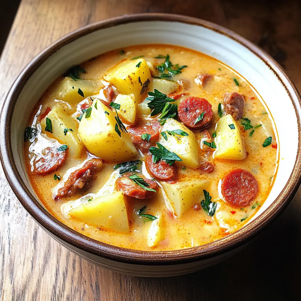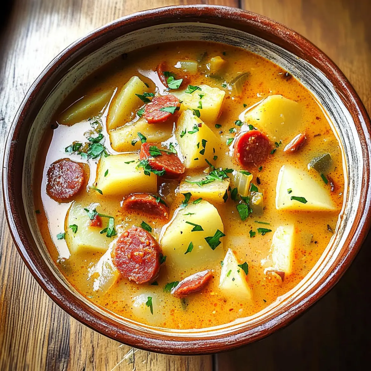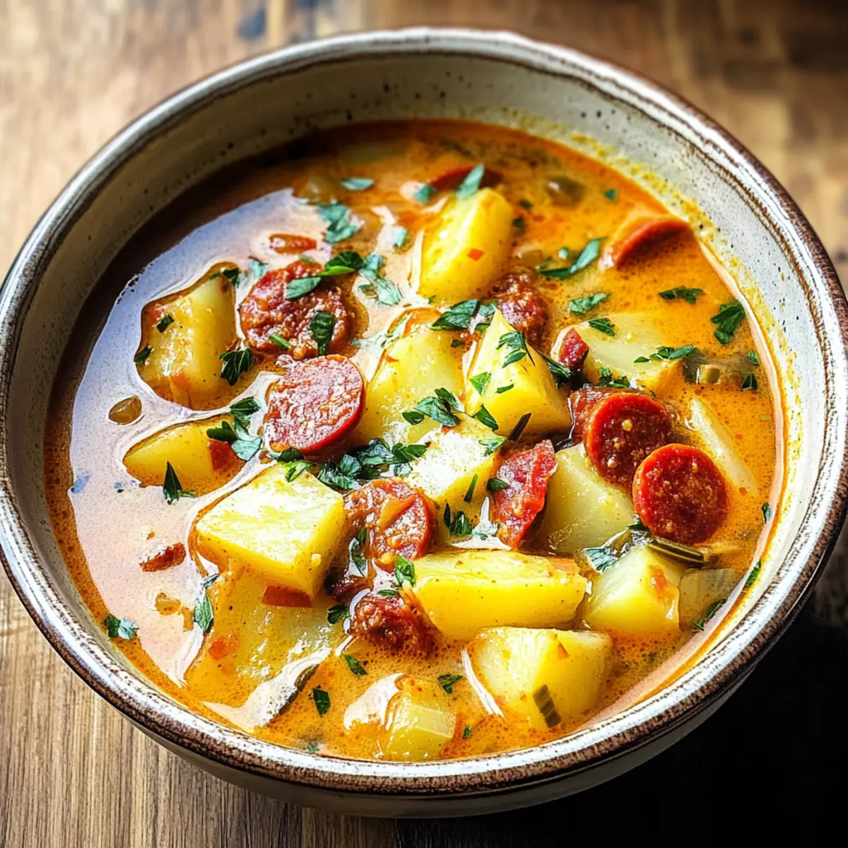 Die Aromen Spaniens entfalten sich direkt in meinem Topf, als ich die köstliche Spanische Kartoffelsuppe mit Chorizo zubereite. Diese herzhafte Suppe ist nicht nur ein vollwertiges Wohlfühlessen, sondern auch blitzschnell zubereitet – in nur 40 Minuten auf dem Tisch! Die Kombination aus cremigen Kartoffeln, knackigen Paprika und dem rauchigen Geschmack der Chorizo zaubert an kalten Tagen ein warmes Lächeln auf die Lippen. Egal, ob du einen langen Arbeitstag hattest oder einfach nur Lust auf ein schnelles, aber schmackhaftes Gericht hast – diese Suppe ist ein wahres Soulfood. Bist du bereit, die Geschmackspalette dieses lecker-wärmenden Gerichts zu entdecken? Warum wirst du diese Suppe lieben? Herzhaft und befriedigend: Diese spanische Kartoffelsuppe mit Chorizo bietet einen reichen, herzhaften Geschmack, der die Sinne verführt und perfekt für kalte Tage ist. Schnell zubereitet: Mit nur 40 Minuten in der Küche ist diese Suppe ideal für hektische Wochentage und sorgt dafür, dass du zügig nach einem langen Tag entspannen kannst. Vielseitige Anpassungen: Du kannst sie leicht vegetarisch gestalten, indem du die Chorizo durch vegetarische Alternativen ersetzt. Das macht sie für viele Essgewohnheiten zugänglich, perfekt, um auch Freunde zu beeindrucken. Einfach zu lagern: Reste können unkompliziert im Kühlschrank aufbewahrt werden und schmecken ebenso gut nach ein paar Tagen – ideal für Meal Prep! Kombination der Aromen: Diese Suppe vereint die Aromen Spaniens und bringt die mediterrane Küche direkt zu dir nach Hause. Kombiniere sie mit etwas frischem Brot, und du hast ein komplettes Gericht! Zutaten für spanische Kartoffelsuppe mit Chorizo Für die Suppe • Olivenöl – ein hervorragendes Kochfett, um die Chorizo anzubraten; alternativ kann pflanzliches Öl verwendet werden. • Spanische Chorizo – der Hauptgeschmacksträger; mild oder würzig je nach Vorliebe. • Gelbe Zwiebel – sorgt für Süße und Tiefe, weißer Zwiebel als Ersatz möglich. • Knoblauch – verstärkt den Geschmack; frisch gehackt ist ideal. Du kannst die Menge nach Geschmack erhöhen (bis zu 6 Zehen). • Grüne Paprika – bringt Textur und Süße; kann durch rote Paprika ersetzt werden für mehr Süße. • Karotte – fügt Süße und Farbe hinzu, mehr kann hinzugefügt oder durch Sellerie ersetzt werden. • Getrockneter Oregano – dient zur Geschmacksverstärkung. Italienisches Gewürz als Alternative möglich. • Gemahlener Kreuzkümmel – fügt warme Erdigkeit hinzu; unverzichtbar für das Geschmacksprofil. • Süßes Paprikapulver – für Farbe und Geschmack; geräuchertes Paprikapulver fügt Tiefe hinzu. • Salz und schwarzer Pfeffer – grundlegende Gewürze; nach Geschmack anpassen. • Cayennepfeffer – sorgt für Schärfe; Menge nach persönlicher Vorliebe anpassen oder weglassen. • Doppeltes Tomatenmark – schafft Umami-Tiefe in der Suppe; normales Tomatenmark ist ebenfalls geeignet. • Mehl – dient als Verdickungsmittel; kann durch Maisstärke für glutenfreie Varianten ersetzt werden. • Wachskartoffeln – behalten ihre Form gut in der Suppe; Yukon Gold oder rote Kartoffeln sind ideal. • Hühnerbrühe – Basisflüssigkeit für Geschmack; selbstgemachte Brühe ist bevorzugt. • Schlagsahne – sorgt für Reichhaltigkeit; kann durch leichtere Sahne ersetzt oder weggelassen werden. • Frische Petersilie – bringt Geschmack und Frische; kann durch Koriander ersetzt oder weggelassen werden. Diese spanische Kartoffelsuppe mit Chorizo ist ein echtes Soulfood, das die Herzen im Sturm erobert! Schritt-für-Schritt-Anleitung zur spanischen Kartoffelsuppe mit Chorizo Step 1: Zutaten vorbereiten Schneide die Wachskartoffeln, die grüne Paprika, die Karotte und die Zwiebel in kleine Stücke. Hacke den Knoblauch fein und schneide die frische Petersilie. Diese Vorbereitungen sorgen dafür, dass alle Zutaten schnell zur Hand sind, während du mit der Zubereitung der spanischen Kartoffelsuppe mit Chorizo beginnst. Step 2: Chorizo anbraten Erhitze in einem großen Topf bei mittelhoher Hitze einen Esslöffel Olivenöl. Füge die in Scheiben geschnittene Chorizo hinzu und brate sie ca. 3 Minuten lang an, bis sie braun und leicht knusprig ist. Das Braten der Chorizo bringt den rauchigen Geschmack in die spanische Kartoffelsuppe mit Chorizo, den du lieben wirst. Step 3: Gemüse sautieren Gib die gewürfelte grüne Paprika in den Topf und brate sie 2 Minuten mit der Chorizo. Danach füge die Zwiebel und den Knoblauch hinzu und koche alles weitere 2 Minuten, bis die Zwiebel transparent wird. Mische dann die Karotte dazu und würze mit Salz, Pfeffer, Kreuzkümmel, Oregano, Paprika und Cayennepfeffer. Lasse alles für 2 Minuten weiter braten. Step 4: Tomatenmark und Mehl hinzufügen Rühre nun das doppelte Tomatenmark in das Gemüse und die Chorizo ein, bis es gut vermischt ist. Streue das Mehl darüber und rühre weiter, bis alles gleichmäßig verteilt ist. Dies wird die Basis der spanischen Kartoffelsuppe mit Chorizo binden und ihr eine cremige Konsistenz verleihen. Step 5: Suppe köcheln lassen Füge die gewürfelten Kartoffeln und die Hühnerbrühe in den Topf hinzu. Bringe die Mischung zum Kochen und reduziere dann die Hitze. Decke den Topf ab und lasse die Suppe 15 Minuten lang köcheln, bis die Kartoffeln weich sind. Überprüfe, ob sie mit einer Gabel leicht zerdrückt werden können, bevor du fortfährst. Step 6: Mit Sahne verfeinern Rühre die Schlagsahne und die gehackte Petersilie in die Suppe ein und koche sie weitere 3 Minuten. Dies verleiht der traditionellen spanischen Kartoffelsuppe mit Chorizo eine zusätzliche Cremigkeit und Frische. Schmecke die Suppe ab und passe die Gewürze nach deinem Geschmack an, bevor du sie servierst. Lagerungstipps für spanische Kartoffelsuppe mit Chorizo Kühlschrank: Bewahre die Suppe in einem luftdichten Behälter für bis zu 3 Tage im Kühlschrank auf. So bleibt sie frisch und die Aromen können sich weiter entfalten. Gefrierschr