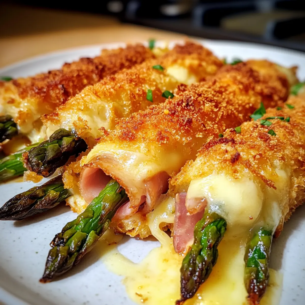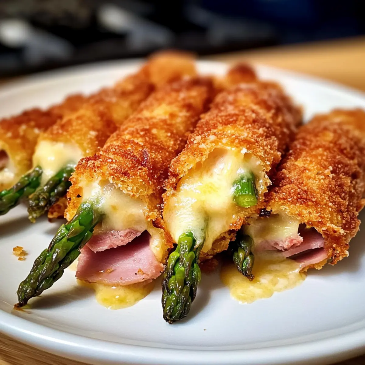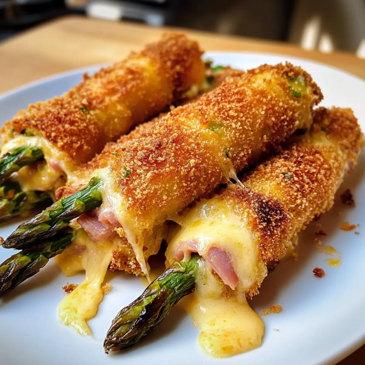 Wenn die ersten Spargelstangen im Frühling erscheinen, kann ich an nichts anderes denken, als an köstliche Gerichte, die ich damit zaubern kann. Eine meiner neuesten Entdeckungen ist das Spargel Cordon Bleu – eine himmlische Kombination aus zartem Spargel, geschmolzenem Käse und herzhaftem Kochschinken, umhüllt von einer knusprigen goldbraunen Kruste. Diese unkomplizierte Rezeptur ist nicht nur ein wahrer Genuss, sondern auch ein schneller Abendessen-Hit, der sich sowohl als Hauptgericht als auch als Beilage hervorragend eignet. Perfekt für Gäste oder einfach um die Familie zu beeindrucken! Was hältst du davon, dein nächstes Dinner mit einem Hauch von Frische und Innovation zu verfeinern? Warum wird dieses Gericht ein Favorit? Einfachheit: Die Zubereitung ist unkompliziert und erfordert nur wenige Schritte, sodass du schnell ein schmackhaftes Gericht auf den Tisch bekommst. Vielseitigkeit: Ob als Hauptspeise oder Beilage, das Spargel Cordon Bleu passt zu jedem Anlass und lässt sich problemlos an verschiedene Ernährungsbedürfnisse anpassen, zum Beispiel glutenfrei mit bestimmten Zutaten. Köstliche Aromen: Die Kombination aus frischem Spargel, geschmolzenem Käse und herzhaftem Kochschinken sorgt für einen unwiderstehlichen Geschmack, der deine Gäste begeistern wird. Gesundheit: Spargel ist reich an Vitaminen und Ballaststoffen, sodass du dich ohne schlechtes Gewissen an diesem Gericht erfreuen kannst. Schnelle Zubereitung: Mit nur wenigen Zutaten und kurzer Kochzeit kannst du im Handumdrehen ein beeindruckendes Dinner kreieren. Probiere auch unser Rezept für Bunter Kinder Nudelsalat oder die Zarte Rinderbissen Mit für weitere schnelle Gerichte! Spargel Cordon Bleu Zutaten Für die Füllung Kochschinken – gibt einen herzhaften Geschmack; für eine leichtere Option kann Putenkochen verwendet werden. Gouda – sorgt für eine schöne Schmelz-Konsistenz; kann durch Edam oder Mozzarella ersetzt werden für einen anderen Geschmack. Spargel – das Hauptzutat, die Frische und Nährstoffe bietet; benutze grünen Spargel für eine bessere optische Wirkung und schneide die harten Enden ab. Für den Teig Mehl – dient zum Bemehlen, damit das Ei besser haftet; kann durch Maisstärke für eine glutenfreie Zubereitung ersetzt werden. Eier – verbinden die Panade; ein Leinsamen-Ei ist eine tolle vegane Alternative. Paniermehl/Panko – sorgt für die knusprige Kruste; glutenfreies Paniermehl kann für diätetische Einschränkungen verwendet werden. Für das Frittieren Butterschmalz – entfaltet einen reichhaltigen Geschmack beim Frittieren; kann durch Pflanzenöl ersetzt werden für eine leichtere Zubereitung. Dieses Spargel Cordon Bleu hat alles, was du für ein schnelles und schmackhaftes Abendessen brauchst! Schritt-für-Schritt-Anleitung für Spargel Cordon Bleu Step 1: Spargel vorbereiten Zuerst den Spargel gründlich waschen und die harten Enden abschneiden. Danach die Stangen mit einem Küchentuch abtrocknen, um überschüssige Feuchtigkeit zu entfernen. Achte darauf, dass der Spargel frisch und knackig ist, um das beste Ergebnis für dein Spargel Cordon Bleu zu erzielen. Step 2: Spargelrollen füllen Lege zwei Spargelstangen übereinander und wickle sie mit einer Scheibe Kochschinken und einer Scheibe Gouda ein. Verwende einen Zahnstocher, um die Rolle sicher zusammenzuhalten. Achte darauf, dass der Käse gut um den Spargel gewickelt ist, damit er beim Frittieren schmilzt und die Aromen verbindet. Step 3: Panierstation einrichten Bereite drei Teller vor: einen mit gewürzt Mehl, einen mit verquirlten Eiern und den dritten mit Paniermehl oder Panko. Stelle sicher, dass die Zutaten gleichmäßig verteilt sind, um eine einheitliche Panade zu ermöglichen. Diese Schritt ist entscheidend für die knusprige Kruste deines Spargel Cordon Bleu. Step 4: Rollen panieren Nimm jede Spargelrolle und wälze sie zuerst im Mehl, dann tauche sie in das verquirlte Ei und schließlich in die Panade. Drücke die Panade leicht an, um eine schöne, gleichmäßige Schicht zu erhalten. Diese Schichten sorgen dafür, dass dein Spargel Cordon Bleu beim Frittieren knusprig und goldbraun wird. Step 5: Öl erhitzen Erhitze in einer großen Pfanne bei mittelhoher Hitze Butterschmalz oder Pflanzenöl, bis es heiß ist. Du kannst testen, ob das Öl bereit ist, indem du ein kleines Stück Panade hineinwirfst – wenn es brutzelt, ist das Öl perfekt zum Frittieren. Achte darauf, die Temperatur nicht zu hoch zu wählen, damit die Panade nicht verbrennt. Step 6: Spargel Cordon Bleu frittieren Lege vorsichtig die panierten Rollen in die heiße Pfanne und brate sie etwa 3-4 Minuten pro Seite, bis sie goldbraun sind. Wende die Rollen vorsichtig, um ein Zerbrechen zu vermeiden. Die knusprige Kruste soll eine schöne, gleichmäßige Bräunung aufweisen, bevor du sie herausnimmst. Step 7: Abtropfen und servieren Nach dem Frittieren die Spargel Cordon Bleu Rollen auf ein mit Küchenpapier ausgelegtes Blech legen, um überschüssiges Öl abtropfen zu lassen. Serviere die heißen Rollen sofort, idealerweise mit einer leckeren Hollandaise-Sauce als Dip. Ihr zarter Geschmack und die köstliche Textur werden deine Gäste beeindrucken! Spargel Cordon Bleu Variationen Hier kannst du deiner Kreativität freien Lauf lassen und das Rezept ganz nach deinem Geschmack anpassen! Glutenfrei: Verwende glutenfreies Paniermehl und Mehl, um diese köstliche Speise für glutenempfindliche Gäste zuzubereiten. Vegan: Tausche den Käse gegen Cashew- oder Mandelkäse und nutze ein Leinsamen-Ei, um das Gericht pflanzlich zu gestalten. Würziger Kick: Füge in die Panade geräuchertes Paprikapulver oder Cayennepfeffer hinzu, um die Schärfe zu steigern. Fischig: Ersetze den Schinken durch Räucherlachs für eine edle, maritime Variante des Spargel Cordon Bleu. Käsevielfalt: Probiere statt Gouda einen kräftigen Cheddar oder Blauschimmelkäse aus, um einen besonderen Geschmack zu kreieren. Gemüse-Boost: Ergänze die Füllung mit frischen 