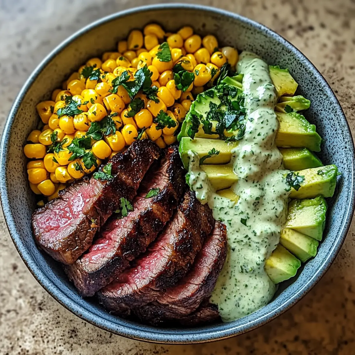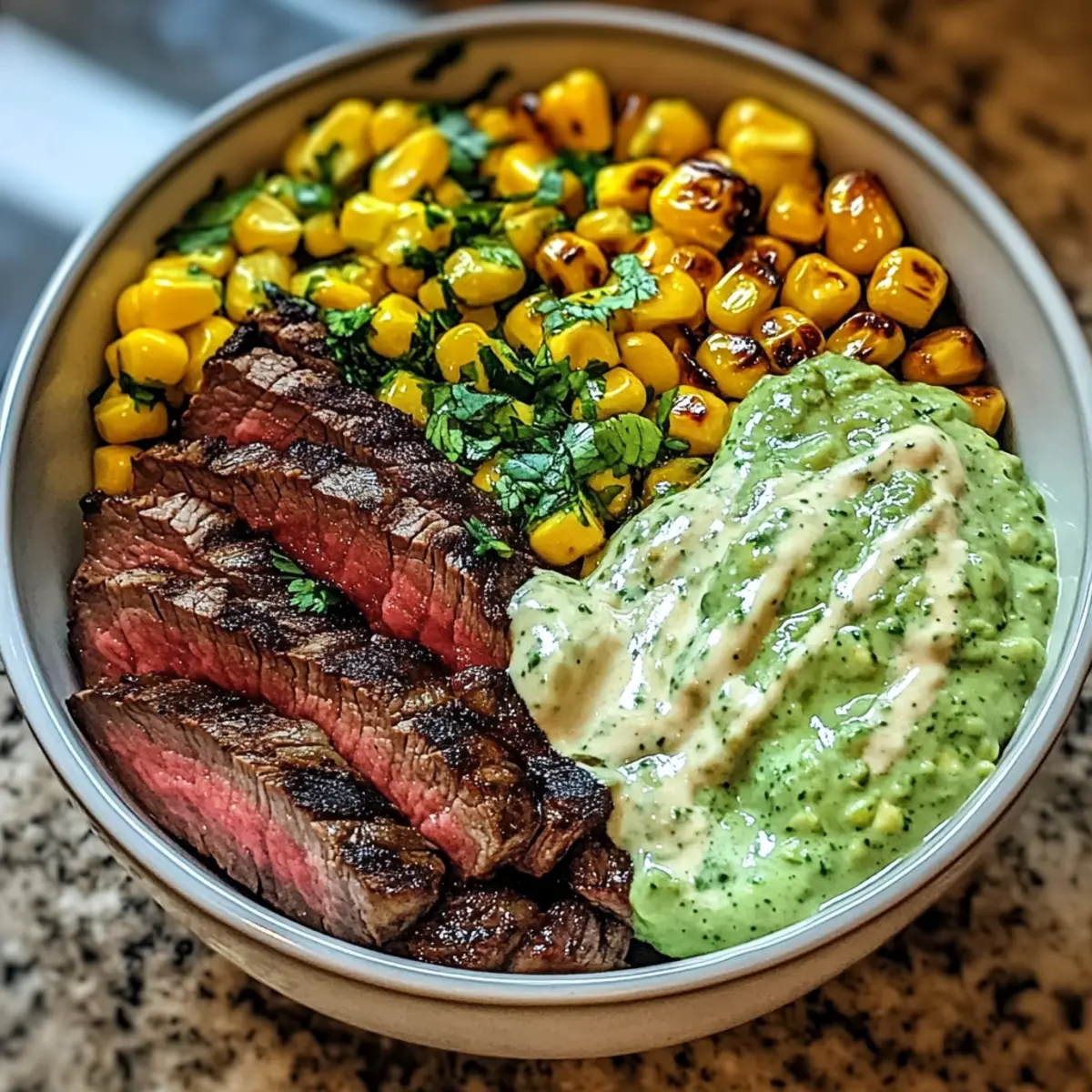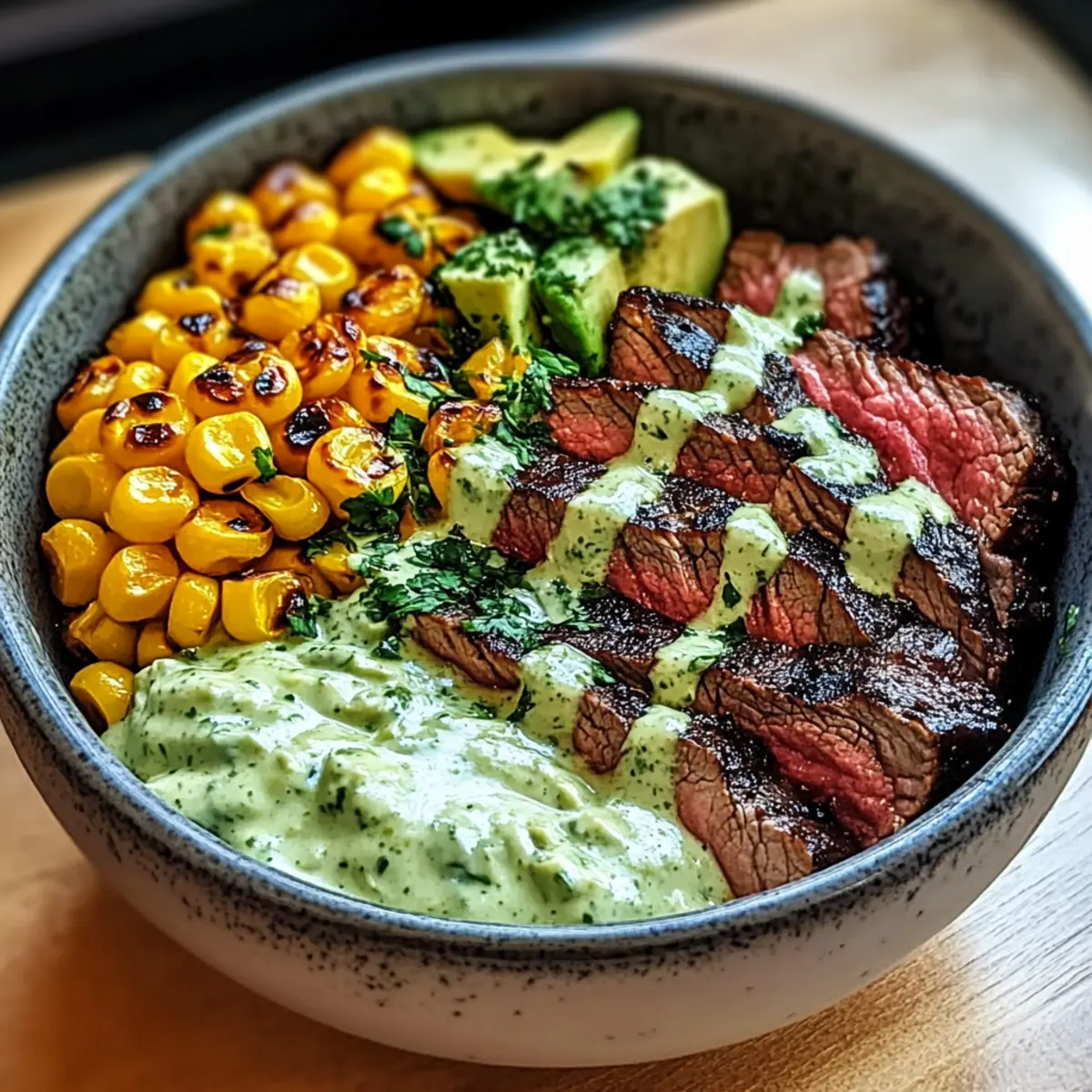 Die Küchenzeitung in meinem Kopf klopfte laut, als ich an einem Erlebnistag voller Farben und Aromen arbeitete. Heute dreht sich alles um die Steak, Avocado und geröstete Mais-Schüssel mit Koriander-Crème-Sauce. Diese köstliche Schüssel vereint zart gewürztes Steak, cremige Avocado und süßen, gerösteten Mais – ein Fest der Texturen und Geschmäcker, das ihr schnell zubereiten könnt! Perfekt für ein unkompliziertes Abendessen unter der Woche oder zur Verfeinerung eures Meal Preps, lässt sich dieses Gericht mühelos nach eurem Geschmack anpassen. Neugierig, wie einfach ihr dieses geschmackvolle Gericht selbst zaubern könnt? Warum werden Sie dieses Rezept lieben? Einzigartiger Geschmack: Diese Steak, Avocado und geröstete Mais-Schüssel vereint Aromen, die begeistern. Vielseitig anpassbar: Ob mit Quinoa, Reis oder einer vegetarischen Variante – die Optionen sind endlos. Schnelle Zubereitung: In weniger als 30 Minuten habt ihr ein köstliches Gericht auf dem Tisch. Gesund und nahrhaft: Vollgepackt mit Nährstoffen, macht es satt und glücklich. Gourmet-Erlebnis: Genießt den Luxus kreativer Essen ohne Restaurantbesuch – perfekt, um Familie und Freunde zu beeindrucken. Und wenn ihr nach weiteren tollen Rezepten sucht, schaut euch auch Gnocchi mit grünem Spargel und Parmesan oder Lachs Salat Avocado an! Steak, Avocado und geröstete Mais-Schüssel Zutaten • Für die Schüssel: Steak – wählt cuts wie Rinderfilet oder Hüftsteak für eine zarte Textur. Avocado – sorgt für Cremigkeit; achtet darauf, dass sie reif ist, um das beste Aroma zu erhalten. Frischer oder gefrorener Mais – bietet Süße und Textur; frischer Mais ist ideal, aber gefroren funktioniert ebenfalls. Reis oder Quinoa – diese Basis nimmt die Aromen auf und sorgt für einen sättigenden Mix. • Für die Koriander-Crème-Sauce: Frischer Koriander – verleiht der Sauce einen aromatischen Kick. Limette – bringt Frische und Säure; passt die Menge nach eurem Geschmack an. Jalapeño – fügt etwas Schärfe hinzu; reduziert die Menge für eine milde Sauce. • Zum Kochen: Olivenöl – praktisch zum Braten von Steak und zum Rösten des Mais; verbessert den Geschmack und verhindert das Ankleben. • Für die Gewürzmischung: Salz und Pfeffer – die Grundgewürze für optimalen Geschmack. Paprika, Knoblauchpulver, Chili-Pulver – diese Gewürze machen das Steak würzig und anpassbar je nach persönlichem Geschmack. Eure Steak, Avocado und geröstete Mais-Schüssel mit Koriander-Crème-Sauce ist im Handumdrehen zubereitet und wartet darauf, entdeckt zu werden! Schritt-für-Schritt-Anleitung für Steak, Avocado und geröstete Mais-Schüssel mit Koriander-Crème-Sauce Step 1: Steak vorbereiten Nehmt das Steak 30 Minuten vor dem Braten aus dem Kühlschrank, damit es auf Zimmertemperatur kommt. Reibt es großzügig mit Salz, Pfeffer, Paprika, Knoblauchpulver und Chili-Pulver ein, um einen aromatischen Geschmack zu gewährleisten. Bereitet das Steak vor, während ihr die anderen Zutaten erledigt. Step 2: Mais rösten Heizt den Ofen auf 220 °C (425 °F) vor. Bereitet den Mais – frisch oder gefroren – vor, indem ihr ihn mit Olivenöl, Salz und einer Prise Chili-Pulver vermischt. Breitet den Mais gleichmäßig auf einem Backblech aus und röstet ihn 15-20 Minuten lang, bis er goldbraun und leicht knusprig ist, und rührt ihn nach der Hälfte der Zeit um. Step 3: Koriander-Crème-Sauce zubereiten Während der Mais röstet, bereitet ihr die Koriander-Crème-Sauce vor. Gebt frischen Koriander, Limettensaft und Jalapeño in einen Mixer und püriert alles, bis es eine glatte Konsistenz erreicht. Schmeckt die Sauce ab und passt die Mengen an Limette und Jalapeño nach eurem Geschmack an, um die perfekte Balance aus Frische und Schärfe zu finden. Step 4: Steak braten Erhitzt eine Gusseisenpfanne bei hoher Hitze, bis sie rauchig ist. Gebt einen Schuss Olivenöl hinzu und bratet das Steak 4-5 Minuten lang auf jeder Seite für ein medium-rare Ergebnis (135 °F). Eine schöne, goldene Kruste ist der visuelle Hinweis auf idealen Gargrad. Lasst das Steak anschließend 5 Minuten ruhen, damit der Saft sich setzen kann. Step 5: Schüssel zusammenstellen Kocht währenddessen Reis oder Quinoa als Basis für die Schüssel und stellt sicher, dass es warm und fluffig ist. Schneidet das Steak nach dem Ruhen dünn gegen die Faser und platziert es auf dem Reis oder Quinoa. Fügt die cremige Avocado hinzu, den gerösteten Mais und träufelt großzügig die Koriander-Crème-Sauce darüber. Step 6: Servieren und genießen Serviert die Steak, Avocado und geröstete Mais-Schüssel sofort, damit alle Aromen aufeinander abgestimmt sind. Diese köstliche Kombination sorgt für eine farbenfrohe und schmackhafte Mahlzeit, die sowohl gesund als auch zufriedenstellend ist. Ladet eure Familie oder Freunde ein, um gemeinsam zu genießen! Lagerungstipps für Steak, Avocado und geröstete Mais-Schüssel mit Koriander-Crème-Sauce Zimmertemperatur: Die Schüssel sollte nicht länger als 2 Stunden bei Zimmertemperatur stehen, um die Frische der Zutaten zu erhalten. Kühlschrank: Im Kühlschrank hält sich die vorbereitete Steak, Avocado und geröstete Mais-Schüssel bis zu 3 Tage. Lagert die Komponenten getrennt, insbesondere die Avocado, um Braunwerden zu vermeiden. Gefrierschrank: Für eine längere Lagerung können die Komponenten wie gekochter Reis oder das Steak bis zu 3 Monate im Gefrierbeutel aufbewahrt werden. Vor dem Servieren vollständig auftauen und aufwärmen. Wiedererwärmen: Erhitzt das Steak in einer Pfanne oder Mikrowelle und achtet darauf, es nicht zu überkochen. Die Koriander-Crème-Sauce kann ebenfalls bei Bedarf kurz erwärmt werden. Expertentipps für Steak, Avocado und geröstete Mais-Schüssel Die richtige Ruhezeit: Lassen Sie das Steak nach dem Braten ruhen, um die Säfte im Fleisch zu verteilen und es saftig zu halten. Genauer Gargrad: Nutzen Sie ein Fleischthermometer, um den perfekten Gargrad zu erreichen. Medium-