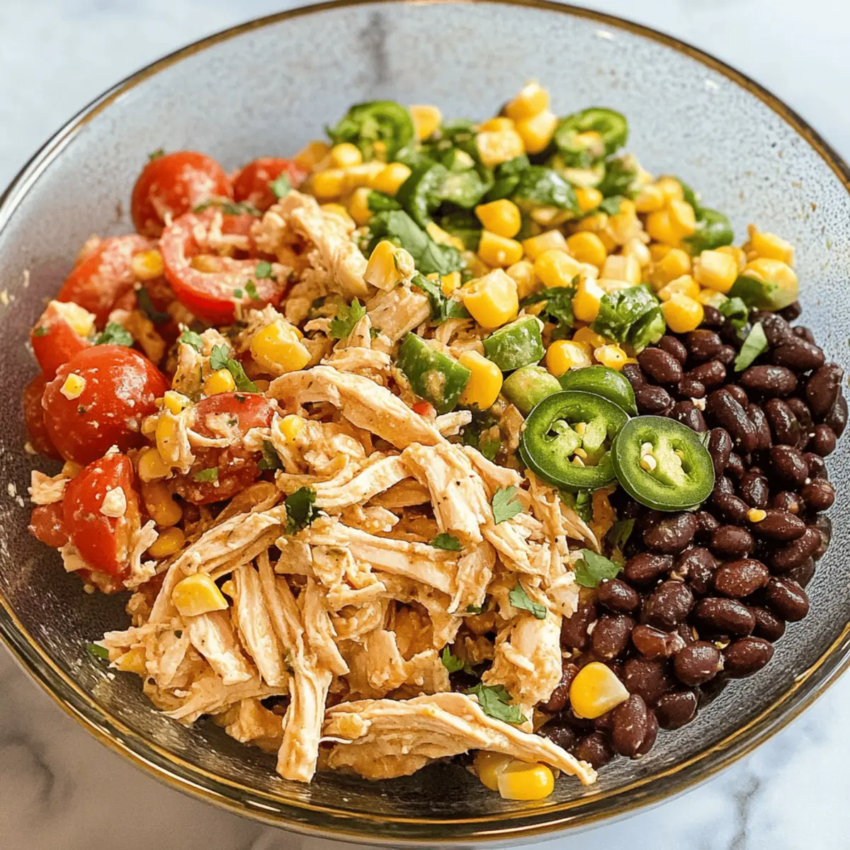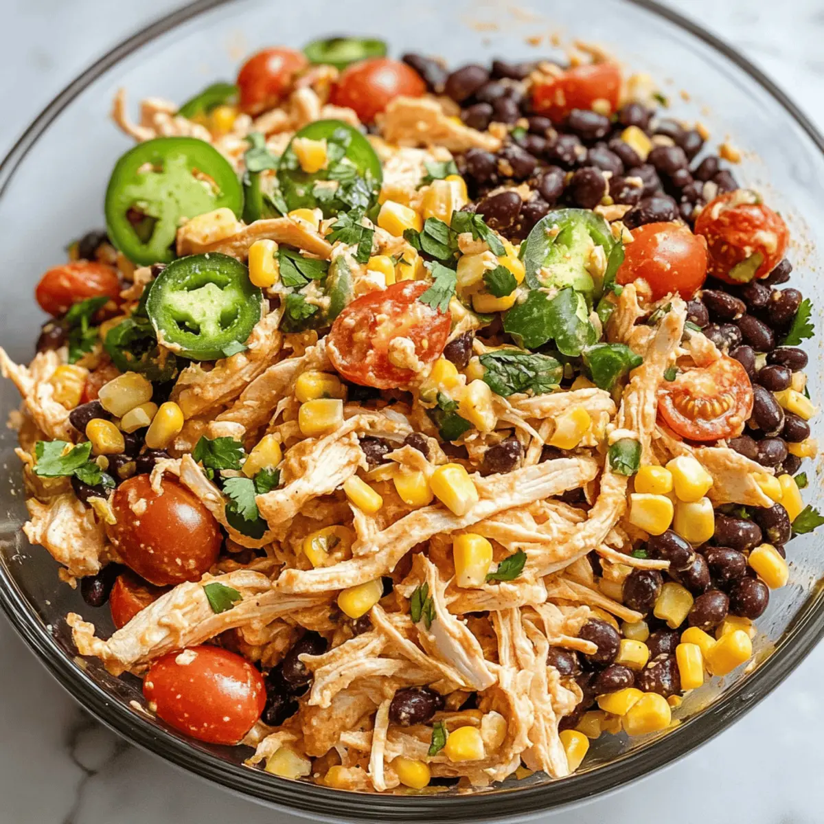 Es war einer dieser Tage, an denen ich eine schnelle und dennoch sättigende Mahlzeit benötigte. Ich war hungrig, aber das letzte, was ich wollte, war ein schnelles Fast-Food-Essen. Genau dann kam mir der Gedanke an einen Südwestlich gewürzten Hühnersalat. Diese bunten und würzigen Zutaten – zarte Hähnchenstücke, schwarze Bohnen, süßer Mais und frische Jalapeños – sind nicht nur unglaublich lecker, sondern auch perfekt für eine schnelle Zubereitung. Der Salat ist zudem glutenfrei und kann ganz nach deinem Geschmack mit griechischem Joghurt für eine leichtere Dressing-Option angepasst werden. Ob als schnelles Mittagessen oder als herzhaftes Abendessen, dieser Salat ist ein wahrer Genuss und lässt sich in nur 10 Minuten zubereiten. Bist du bereit, deinen nächsten Lieblingssalat zu entdecken? Warum wirst du diesen Salat lieben? Einfachheit trifft Genuss: Die Zubereitung ist unkompliziert und benötigt nur wenige Minuten. Voller Geschmack: Die Kombination aus Gewürzen und frischen Zutaten verleiht dem Salat eine aufregende Geschmackstiefe. Vielfältige Optionen: Du kannst Zutaten nach Belieben anpassen, wie z.B. griechischen Joghurt anstelle von Mayo verwenden oder andere Nüsse und Samen einfügen. Gesund und Nahrhaft: Mit proteinreichen Hähnchen und ballaststoffreichen Bohnen ist dieser Salat ein echter Kraftspender. Perfekt für Meal Prep: Du kannst ihn hervorragend im Voraus zubereiten, so hast du für die Woche gesunde Mahlzeiten parat. Ideal für jeden Anlass: Ob für ein schnelles Mittagessen oder als herzhaftes Abendessen, dieser Salat wird deine Gäste begeistern! Südwestlich gewürzter Hühnersalat Zutaten Hinweis: Diese Zutaten sind einfach zu beschaffen und liefern die Basis für einen köstlichen südwestlich gewürzten Hühnersalat. Für das Dressing Mayo oder griechischer Joghurt – Verwende griechischen Joghurt für eine leichtere und proteinreiche Option. Limettensaft – Frisch gepresst sorgt für eine optimale Frische und Ausgewogenheit. Chilipulver – Für eine zusätzliche Geschmackstiefe und eine angenehme Schärfe. Knoblauchpulver – Fügt Geschmack hinzu und verstärkt die Würze. Kreuzkümmel – Bringt einen warmen, erdigen Geschmack in den Salat. Paprika – Für einen leicht süßlichen und rauchigen Geschmack. Salz – Zum Abrunden der Aromen. Für den Salat Gekochtes, zerkleinertes Hähnchen – Der Hauptbestandteil für Protein; kann auch durch Dosenhähnchen ersetzt werden. Schwarze Bohnen – Reich an Ballaststoffen und Protein; vorher abspülen und abtropfen. Süßer Mais – Bringt Süße und Knusprigkeit; sowohl aus der Dose als auch aus dem Gefrierfach geeignet. Frische Jalapeños – Für einen würzigen Kick; die Menge nach Geschmack anpassen. Kirschtomaten – Fügen Saftigkeit und Farbe hinzu; können weggelassen werden, wenn nicht gewünscht. Rote Zwiebel – Für eine knackige Schärfe; kann auch durch Frühlingszwiebeln ersetzt werden. Pepitas (Kürbiskerne) – Sorgen für einen nussigen Geschmack und Crunch; Sonnenblumenkerne sind eine gute Alternative. Jede dieser Zutaten trägt dazu bei, dass dein südwestlich gewürzter Hühnersalat nicht nur frisch und lecker ist, sondern auch gesund und unkompliziert zubereitet werden kann. Schritt-für-Schritt-Anleitung für den Südwestlich gewürzten Hühnersalat Step 1: Dressing zubereiten In einer mittelgroßen Schüssel vermischst du die Mayo oder den griechischen Joghurt mit dem frisch gepressten Limettensaft, Chilipulver, Knoblauchpulver, Kreuzkümmel, Paprika und einer Prise Salz. Verrühre alles gut mit einem Schneebesen, bis eine cremige und einheitliche Konsistenz entsteht. Dieser Schritt dauert etwa 3-5 Minuten und sorgt für eine würzige Basis für deinen Südwestlich gewürzten Hühnersalat. Step 2: Salatzutaten vorbereiten Nehme eine große Schüssel und füge das zerkleinerte Hähnchen, schwarze Bohnen (die gut abgespült und abgetropft wurden), süßen Mais, die gehackten Jalapeños, geviertelten Kirschtomaten, die gewürfelte rote Zwiebel und die Pepitas hinzu. Mische die Zutaten vorsichtig mit einem Löffel für etwa 2-3 Minuten, bis alles gleichmäßig verteilt ist und du eine bunte Mischung erkennst, die gleich einen tollen Geschmack entfalten wird. Step 3: Dressing hinzufügen Gieße das vorbereitete Dressing über die Salatzutaten in der großen Schüssel. Nutze zwei Gabeln oder einen großen Löffel, um den Salat sanft zu vermengen, sodass das Dressing alle Zutaten gut umhüllt. Dieser Schritt sollte circa 2 Minuten in Anspruch nehmen, um sicherzustellen, dass jedes Stück zart ummantelt ist und der Geschmack gleichmäßig verteilt wird. Step 4: Anrichten und Servieren Serviere den Südwestlich gewürzten Hühnersalat sofort auf Tellern oder in Wraps, oder lege ihn auf ein Bett aus frischem Salat. Du kannst auch zusätzliche Jalapeños oder einige zusätzliche Pepitas für mehr Crunch als Garnitur verwenden. Dieses Gericht ist einfach und benötigt kaum mehr als 10 Minuten bis zur Fertigstellung, ideal für ein schnelles Mittagessen oder ein herzhaftes Abendessen. Tipps für den besten Südwestlich gewürzten Hühnersalat Vorgekochtes Hähnchen: Verwende vorgekochtes, zerkleinertes Hähnchen oder Rotisserie-Hähnchen, um die Vorbereitungszeit zu verkürzen und den Geschmack zu intensivieren. Bohnen abspülen: Spüle die schwarzen Bohnen gründlich ab, um überschüssiges Salz und Konservierungsstoffe zu entfernen, was den Geschmack verbessert. Soße anpassen: Experimentiere mit der Menge der Jalapeños im Dressing für die gewünschte Schärfe; eine kleine Menge reicht oft aus. Frische Zutaten: Nutze frisch gepressten Limettensaft für den besten Geschmack; das gibt dem Salat eine lebendige Frische. Lagerungstipps: Der Südwestlich gewürzte Hühnersalat bleibt bis zu 4-5 Tage im Kühlschrank frisch; vermeide das Einfrieren, da das Dressing verwässern kann. Verfeinerungen: Füge frische Kräuter wie Koriander oder gewürfelte Paprika hinzu, um den Salat noch
