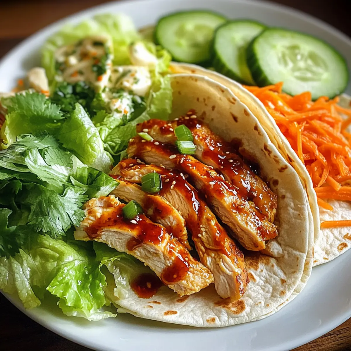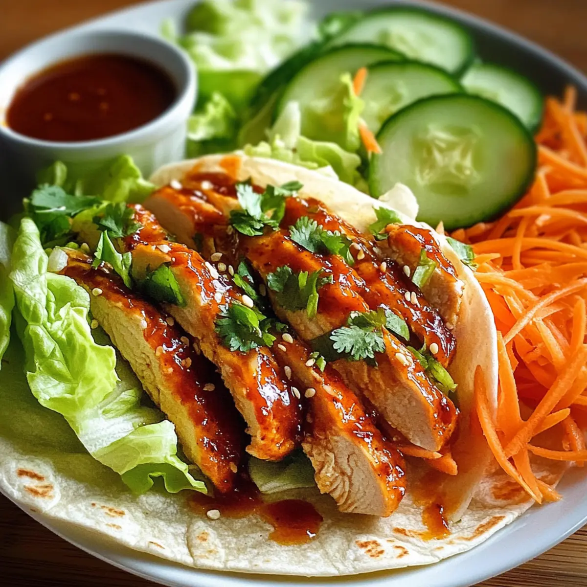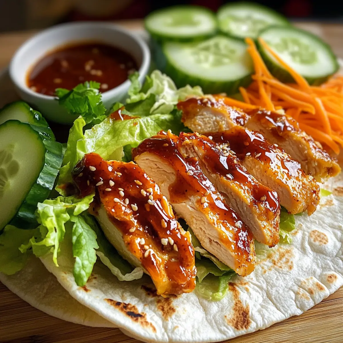 Stell dir vor, du bist an einem sonnigen Tag unterwegs und der Duft von frisch zubereitetem Essen umhüllt dich. Genau das erleben wir mit diesen köstlichen Süße Chili Hühnchen Wraps! Zarte Hühnerbrust, eingehüllt in eine süß-würzige Chilisoße, vereint sich mit knackigem Gemüse zu einem perfekten Geschmackserlebnis. Diese blitzschnelle und einfache Rezeptur ist ideal für hektische Wochentage oder ein entspanntes Mittagessen. Außerdem sind die Wraps nicht nur ein Genuss für den Gaumen, sondern auch eine gesunde Wahl, die du mit frischen Zutaten anpassen kannst. Bist du bereit, deine Küche in einen kleinen Tempel der Aromen zu verwandeln? Lass uns loslegen! Warum wirst du diese Wraps lieben? Schnelligkeit und Einfachheit: Dieses Rezept lässt sich in kürzester Zeit zubereiten und erfordert nur grundlegende Kochkenntnisse. Perfekt für beschäftigte Tage! Frische Zutaten: Die Kombination aus frischem Gemüse und zartem Hühnchen sorgt für einen gesunden Genuss, der auch Kinder begeistert. Vielseitig: Du kannst die Wraps leicht anpassen, indem du Zutaten wie Würzige Puten Brokkoli oder verschiedene Gemüse hinzufügst, um immer neue Geschmackserlebnisse zu schaffen. Verführerischer Geschmack: Die süß-würzige Chilisoße verleiht dem Gericht einen einzigartigen Kick, der jede Geschmacksknospe erfreut. Praktisch für Meal Prep: Bereite die Füllungen im Voraus vor und lagere sie getrennt von den Tortillas – so bleibt alles frisch! Genieße deine eigenen Süße Chili Hühnchen Wraps und erlebe ein Stück kulinarisches Glück! Süße Chili Hühnchen Wraps Zutaten Für das Hühnchen • Hühnchenbrust ohne Knochen und Haut – Hauptprotein, das eine herzhafte Basis bietet. Du kannst es durch Tofu oder Garnelen ersetzen. • Süße Chili Soße – Verleiht einen charakteristischen süß-scharfen Geschmack und eine klebrige Textur. Eine direkte Ersatzempfehlung gibt es nicht, aber du kannst die Süße anpassen. • Sojasoße – Verstärkt den Umami-Geschmack und die Komplexität der Marinade. Optional für eine natriumarme Variante weglassen. • Olivenöl – Wird zum Braten verwendet, um eine schöne Kruste zu erreichen. Du kannst es durch jedes neutrale Speiseöl ersetzen. • Knoblauchpulver – Sorgt für herzhaften Geschmack. Frischer, gehackter Knoblauch kann für intensiveren Geschmack verwendet werden. • Gehackter Ingwer – Fügt eine warme, aromatische Note zur Marinade hinzu. Frischer Ingwer ist eine großartige Alternative. • Salz und Pfeffer – Unverzichtbare Gewürze für den Geschmack. Nach persönlichem Geschmack anpassen. Für die Wraps • Große Tortillas aus Weizen – Die Basis, die alle Zutaten hält. Vollkorn- oder Maistortillas sind ebenfalls geeignet. • Geriebener Salat – Sorgt für Frische und Knusprigkeit. Jede Blattgrün-Sorte kann verwendet werden. • Geriebene Karotten – Bringen Süße und Farbe ins Spiel. Du kannst sie durch Paprika für einen anderen Knusper ersetzen. • Würfeln von Gurken – Für einen erfrischenden Kontrast, der die Reichhaltigkeit des Hühnchens ausgleicht. Zucchini kann ebenfalls als Alternative verwendet werden. • Frisch gehackter Koriander (optional) – Fügt eine kräuterige Frische hinzu. Omitiere es, wenn du weniger Kräutergeschmack magst. • Limettenstücke – Optional, für einen spritzigen Abschluss. Andere Zitrusfrüchte wie Zitrone können ebenfalls verwendet werden. Schritt-für-Schritt-Anleitung für Süße Chili Hühnchen Wraps Step 1: Hühnchen vorbereiten Würze die Hühnerbruststücke großzügig mit Salz, Pfeffer, Knoblauchpulver und gehacktem Ingwer. Lege die Hühnerbrust in eine Schüssel und achte darauf, dass sie gleichmäßig bedeckt ist. Dies sorgt für einen reichen Geschmack. Lass die Würzung für etwa 10 Minuten einziehen, während du die Marinade zubereitest. Step 2: Marinade zubereiten Verrühre in einer separaten Schüssel die süße Chili-Sauce und die Sojasoße gründlich. Verwende einen Schneebesen, um Klumpen zu vermeiden und eine glatte Konsistenz zu erreichen. Gieße die Hälfte dieser Marinade über das gewürzte Huhn und lasse es mindestens 30 Minuten marinieren, um den Geschmack zu intensivieren. Step 3: Hähnchen braten Erhitze in einer großen Pfanne bei mittlerer Hitze etwas Olivenöl. Füge die marinierten Hühnerbruststücke hinzu und brate sie für etwa 6-7 Minuten auf jeder Seite, bis sie goldbraun sind und eine Innentemperatur von 75 °C erreichen. Achte darauf, dass das Hühnchen zart und saftig bleibt, bevor du es aus der Pfanne nimmst. Step 4: Hähnchen schneiden Lasse das gebratene Hühnchen nach dem Braten auf einem Schneidebrett für 5 Minuten ruhen. Dies ermöglicht es dem Fleisch, saftig zu bleiben. Schneide es anschließend in dünne Streifen, die leicht in die Wraps gefüllt werden können. Step 5: Tortillas erwärmen Erwärme die großen Tortillas in einer trockenen Pfanne oder in der Mikrowelle für etwa 20-30 Sekunden, bis sie weich und biegsam sind. Dies erleichtert das Falten und Rollen der Wraps. Achte darauf, die Tortillas nicht zu lange zu erhitzen, damit sie nicht austrocknen. Step 6: Wraps zusammenstellen Lege auf jede tortilla eine Handvoll geriebenen Salat, gefolgt von den Hühnerstreifen, geriebenen Karotten und gewürfelten Gurken. Füge nach Belieben ein paar frische Korianderblätter hinzu. Diese Kombination sorgt für eine erfrischende Textur in deinen Süße Chili Hühnchen Wraps. Step 7: Sauce hinzufügen Gieße die restliche Süß-Chili-Sauce über die Zutaten in den Tortillas. Dies verleiht den Wraps den letzten Geschmackskick und sorgt dafür, dass alles saftig bleibt. Achte darauf, nicht zu viel Sauce zu verwenden, damit die Wraps nicht durchweichen. Step 8: Wraps einrollen Falte die Seiten der Tortilla über die Füllungen und rolle sie dann von unten nach oben fest auf. Jedes Stück sollte gut verschlossen sein, damit die Füllung nicht herausfällt. Wiederhole diesen Schritt mit den restlichen Tortillas und Füllungen. 
