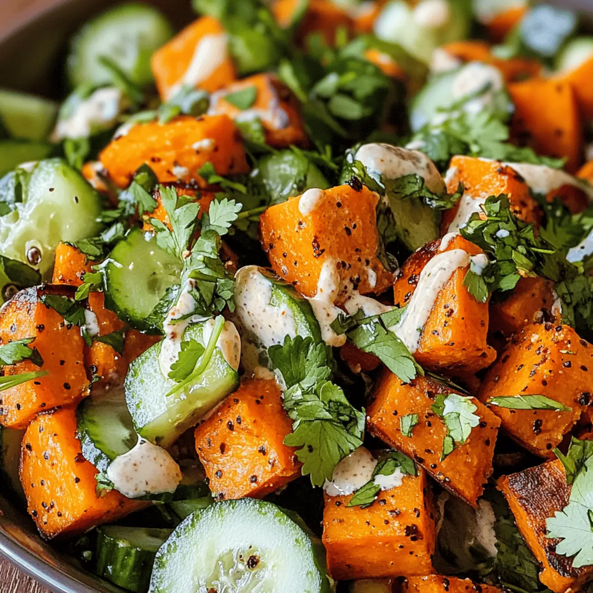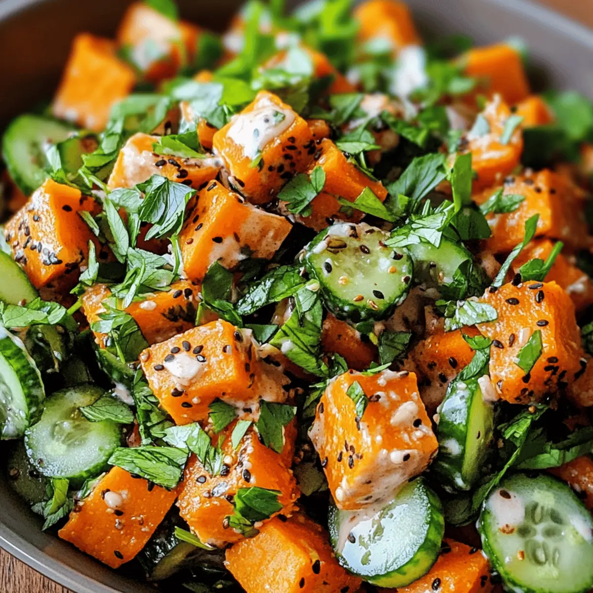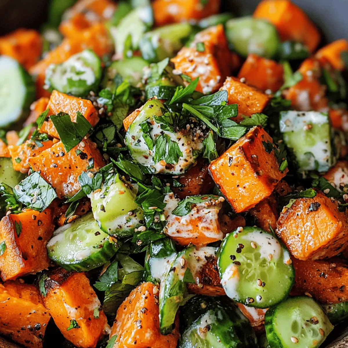 Als ich kürzlich in meinem Garten saß, umgeben von duftenden Kräutern und frischem Gemüse, konnte ich nicht widerstehen, einen ganz besonderen Salat zu kreieren: den Süßkartoffel-Gurkensalat mit cremigem Miso-Dressing. Diese Kombination aus knusprigen, goldbraunen Süßkartoffelwürfeln und erfrischenden Gurkenscheiben sorgt nicht nur für ein Auge voll Freude, sondern ist auch ein köstlicher Genuss für den Gaumen. Ganz nebenbei ist dieses Rezept vegan und lässt sich in kürzester Zeit zubereiten – perfekt für alle, die eine gesunde und schnelle Mahlzeit suchen. Egal, ob als Beilage oder als leichtes Hauptgericht, dieses Rezept wird nicht nur Ihre Geschmacksknospen erfreuen, sondern auch Ihre Gäste begeistern. Neugierig, wie Sie diesen sommerlichen Genuss in Ihre Küche holen können? Lasst uns anfangen! Warum ist dieser Salat so besonders? Vielfältige Texturen: Der knusprige Biss der Süßkartoffeln kombiniert sich perfekt mit der erfrischenden Gurke und der cremigen Konsistenz des Miso-Dressings. Einfach und schnell: Die Zubereitung ist unkompliziert, was dieses Rezept ideal für geschäftige Tage macht. Nur ein paar Schritte und schon haben Sie eine köstliche Mahlzeit! Vegan und gesund: Vollgepackt mit Vitaminen und Ballaststoffen, ist dieser Salat eine nahrhafte Wahl für alle, die auf ihre Gesundheit achten. Erfrischend und leicht: Ideal für den Sommer, kann dieser Salat nicht nur als Beilage, sondern auch als leichtes Hauptgericht genossen werden – perfekt für Picknicks oder Grillabende. Wenig Aufwand, große Wirkung: Beeindrucken Sie Ihre Gäste ganz unkompliziert mit diesem bunten und geschmackvollen Gericht. Es ist großartig, wie diese einfache Kombination aus Zutaten zu einem echten Fest für den Gaumen wird! Süßkartoffel-Gurkensalat Zutaten Hinweis: Für die Zubereitung dieses köstlichen Süßkartoffel-Gurkensalats mit cremigem Miso-Dressing benötigen Sie die folgenden Zutaten. Für die Süßkartoffeln Süßkartoffeln – liefern einen süßen, erdigen Geschmack; unbedingt vorher einweichen für optimale Knusprigkeit. Olivenöl – sorgt für die richtige Bräunung und gesunde Fette; kann durch Avocadoöl ersetzt werden. Maisstärke – verleiht den Süßkartoffeln zusätzlichen Crunch; arrowroot-Pulver ist eine gute Alternative. Für die Salatmischung Gurke – bringt eine erfrischende Knackigkeit; entfernen Sie die Kerne für weniger Feuchtigkeit. Frühlingszwiebeln – sorgt für einen milden Zwiebelgeschmack; durch Schnittlauch ersetzen, wenn gewünscht. Koriander – frisches Kraut für einen Geschmacksboost; kann durch Petersilie ersetzt werden. Für das Dressing Veganer Skyr – Basis für das Dressing, sorgt für die cremige Konsistenz; griechischer Joghurt ist eine nicht-vegane Option. Tahini – bringt nussigen Geschmack und Reichhaltigkeit; Sonnenblumenbutter kann ebenfalls verwendet werden. Miso-Paste – fügt dem Dressing Tiefe und Umami hinzu; rote oder weiße Miso-Paste verwenden oder durch Sojasauce ersetzen. Sesamöl – ergänzt den Salatgeschmack; bei Allergie leichtes Olivenöl verwenden. Limettensaft – sorgt für eine frische Note; kann durch Zitronensaft für andere Säure ersetzt werden. Für die Garnierung Sesamkörner – für zusätzlichen Crunch und Dekoration; alternativ Sonnenblumenkerne verwenden. Chiliöl – für einen pikanten Kick; bei Bedarf weglassen oder durch eine milde Ölmischung ersetzen. Schritt-für-Schritt-Anleitung für Süßkartoffel-Gurkensalat mit cremigem Miso-Dressing Step 1: Süßkartoffeln einweichen Schneiden Sie die Süßkartoffeln in kleine Würfel und geben Sie sie in eine Schüssel mit Wasser. Lassen Sie die Süßkartoffelwürfel für 1 Stunde einweichen, damit die Stärke entfernt wird und sie nach dem Backen knusprig werden. Diese wichtige Vorbereitung sorgt für die perfekte Textur im Süßkartoffel-Gurkensalat mit cremigem Miso-Dressing. Step 2: Backofen vorheizen Heizen Sie den Ofen auf 220°C vor. Während der Ofen aufheizt, gießen Sie die eingeweichten Süßkartoffeln ab und tupfen Sie sie mit einem Küchentuch trocken. Mischen Sie die Süßkartoffeln in einer Schüssel mit Olivenöl und Maisstärke, bis sie gleichmäßig beschichtet sind. Dies verleiht den Würfeln zusätzlichen Crunch. Step 3: Süßkartoffeln backen Verteilen Sie die beschichteten Süßkartoffeln gleichmäßig auf einem mit Backpapier ausgelegten Backblech. Backen Sie die Süßkartoffeln für 15 Minuten im Ofen. Nach dieser Zeit wenden Sie die Würfel vorsichtig, um eine gleichmäßige Bräunung zu erzielen, und backen Sie sie weitere 15 Minuten, bis sie goldbraun und knusprig sind. Step 4: Gurken vorbereiten Während die Süßkartoffeln backen, bereiten Sie die Gurke vor. Halben Sie die Gurke längs, entfernen Sie die Kerne mit einem Löffel und schneiden Sie sie in dünne Streifen. Schneiden Sie die Frühlingszwiebeln in feine Ringe und hacken Sie den Koriander grob. Diese frischen Zutaten sorgen für eine erfrischende Note im Salat. Step 5: Salatmischung anrichten In einer großen Schüssel kombinieren Sie die geschnittene Gurke, Frühlingszwiebeln, Koriander und optional Sesamkörner sowie einen Spritzer Chiliöl. Mischen Sie die Zutaten sanft, sodass die Aromen gut verteilt sind. Diese Mischung bringt Farbe und Knackigkeit in den Süßkartoffel-Gurkensalat mit cremigem Miso-Dressing. Step 6: Dressing zubereiten Für das Dressing geben Sie in eine Schüssel den veganen Skyr, Tahini, Sesamöl, Miso-Paste, Limettensaft und etwas Wasser. Viskosität und Geschmack können durch die Menge Wasser angepasst werden; dann alles gut mit einem Schneebesen vermengen, bis eine cremige und glatte Konsistenz entsteht. Dieses dressing ergänzt den Salat perfekt. Step 7: Anrichten und Servieren Mischen Sie die gebackenen Süßkartoffeln vorsichtig mit der Gurkenmischung in der großen Schüssel. Übergießen Sie das Ganze mit dem cremigen Miso-Dressing und verrühren Sie alles behutsam, bis alles gut vermischt ist. Servieren Sie d