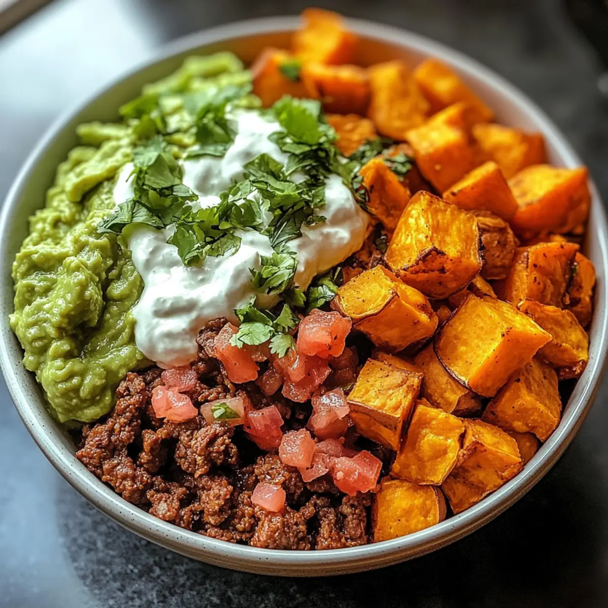 Nimm eine große Schüssel oder mehrere kleinere Schalen und beginne mit einer Schicht der gerösteten Süßkartoffeln. Füge dann das taco-gewürzte Hackfleisch hinzu, gefolgt von einer großzügigen Portion Pico de Gallo und einem Klecks Guacamole. Toppe das Ganze mit einem Löffel Sauerrahm.