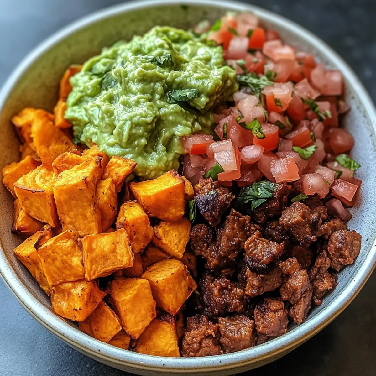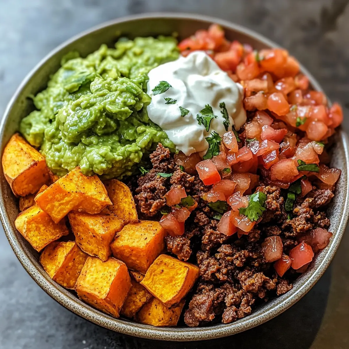 5. Baue die Schüssel auf mit gerösteten Süßkartoffeln, Hackfleisch, Pico de Gallo und Guacamole.