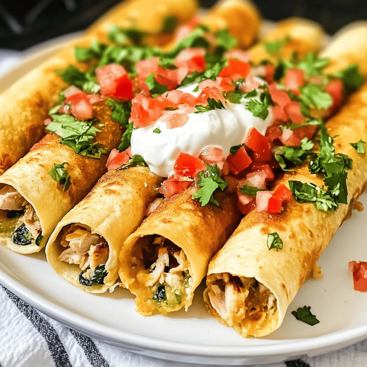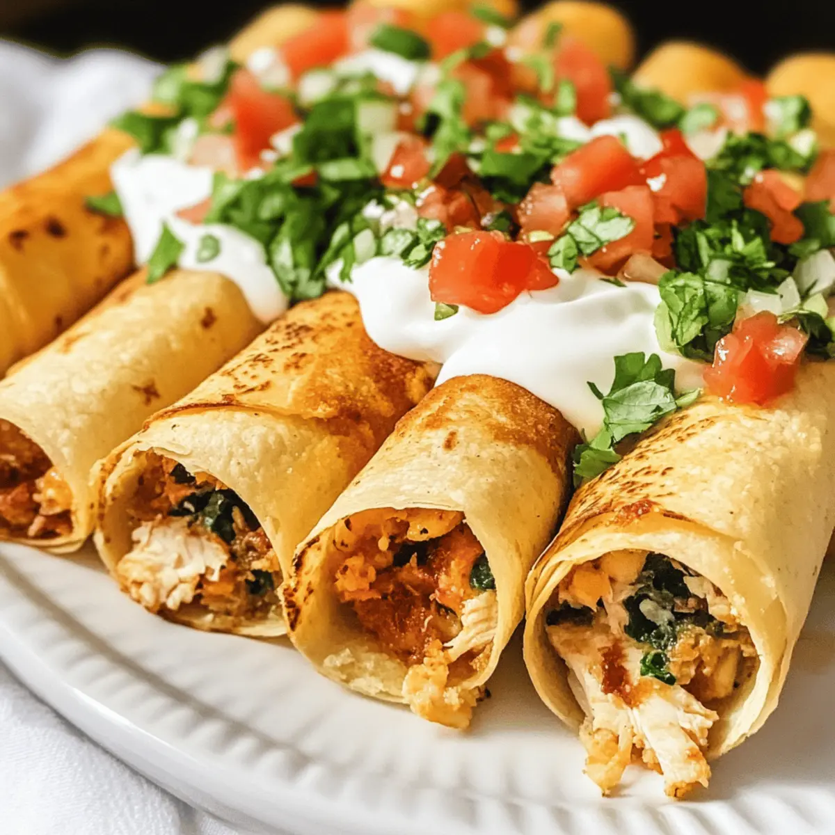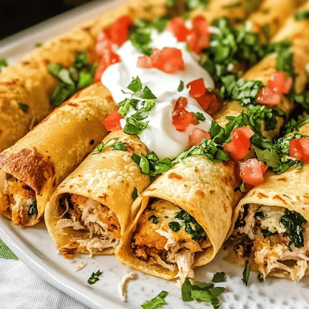 Ein unwiderstehlicher Knusperschmaus steht bereit, um auf den Tisch zu kommen! Diese Crispy Chicken Taquitos sind nicht nur ein Fest für die Geschmacksnerven, sondern auch ein echter Stimmungsmacher für jede Gelegenheit. Innerhalb von nur 30 Minuten zubereitet, sind sie die perfekte Lösung für hektische Wochentage oder gemütliche Abende mit Freunden und Familie. Sie können dabei variieren, indem Sie die Füllung mit zartem Rind- oder Schweinefleisch oder etwas würziger Salsa anpassen. Egal, wie gut es nach einem langen Tag nach schnellem Essen duftet – diese knusprigen Taquitos sind eine köstliche, hausgemachte Wahl, die gesund und sättigend ist! Und sagen Sie mal, wer könnte da widerstehen? Lassen Sie uns gleich die perfekte Mischung für diese kleinen Genussmomente entdecken! Warum sind Taquitos die perfekte Wahl? Pfiffig und vielseitig: Diese Taquitos sind nicht nur unglaublich lecker, sondern bieten auch unendliche Anpassungsmöglichkeiten – vom proteinreichen Hähnchen bis hin zu würzigem Rind- oder Schweinefleisch. Schnelle Zubereitung: Innerhalb von nur 30 Minuten sind sie fertig, ideal für stressige Abende oder spontane Zusammenkünfte. Geselliges Essen: Perfekt für Partys oder gemütliche Familienabende, sie bringen alle um den Tisch! Gesund und sättigend: Mit frischen Zutaten und voller Geschmack sind sie eine gesunde Alternative zu Fast Food. Gleich ausprobieren und vielleicht dazu noch eine homemade Salsa servieren! Taquitos Zutaten Für die Füllung Geräucherter Hähnchenbrust – sorgt für zarten, herzhaften Geschmack und kann alternativ durch Rind- oder Schweinefleisch ersetzt werden. Frischkäse – verleiht eine cremige Textur; immer auf Zimmertemperatur verwenden, damit er sich leicht vermischen lässt. Babyspinat – sorgt für eine schöne Farbe und Nährstoffe; Stiele vorher entfernen für ein besseres Esserlebnis. Colby Jack Käse – schmilzt gut und gibt Geschmack; kann durch eine mexikanische Käsemischung ersetzt werden. Salsa – bringt Würze und Feuchtigkeit; sowohl hausgemachte als auch gekaufte Optionen sind perfekt für die Taquitos. Für das Frittieren Pflanzenöl oder Rapsöl – wichtig für den perfekten knusprigen Außenrand; darauf achten, dass das Öl heiß genug ist. Für die Tortillas Mais-Tortillas (15 cm) – die ideale Grundlage für die Taquitos; alternativ sind auch Mehltortillas möglich. Für das Topping Sauerrahm – verleiht eine cremige und leicht säuerliche Note; Menge nach Geschmack anpassen. Frisch geschnittene Tomaten – für einen frischen Biss und zusätzliche Farbe. Hedeschneider Salat – crispy und erfrischend, ideal als Topping. Pico de Gallo – bringt einen zusätzlichen Frischekick und harmoniert wunderbar mit den Taquitos. Bereiten Sie sich darauf vor, einen köstlichen Happen zu genießen, der die Herzen Ihrer Lieben erobern wird! Schritt-für-Schritt-Anleitung für Crispy Chicken Taquitos Step 1: Öl erhitzen Erhitzen Sie in einem mittelgroßen Topf 1,5 cm Pflanzenöl bei mittlerer Hitze, bis es eine Temperatur von 175°C erreicht. Überprüfen Sie die Hitze, indem Sie einen kleinen Tropfen Teig hinein geben – er sollte sofort aufsteigen und an die Oberfläche blubbern. Bereiten Sie sich vor, während das Öl erhitzt wird! Step 2: Füllung zubereiten In einer großen Schüssel vermengen Sie das geräucherte Hähnchen, Frischkäse, Babyspinat, Colby Jack Käse und Salsa. Fügen Sie je nach Belieben eine Prise Salz und Pfeffer hinzu. Mischen Sie alles gründlich, bis eine homogene, cremige Füllung entsteht. Diese Mischung sorgt dafür, dass Ihre Crispy Chicken Taquitos lecker und herzhaft sind! Step 3: Tortillas füllen Legen Sie jeweils 2-3 Esslöffel der Füllung in die Mitte einer Mais-Tortilla. Rollen Sie die Tortilla straff auf und drücken Sie die Enden zusammen, damit sie gut verschlossen bleibt. Platzieren Sie die gefüllten Taquitos mit der Naht nach unten auf einen Teller. Wiederholen Sie diesen Vorgang, bis alle Tortillas gefüllt sind. Step 4: Taquitos frittieren Wenn das Öl heiß genug ist, legen Sie die Taquitos vorsichtig eine nach der anderen in das heiße Öl. Frittieren Sie sie etwa 2-3 Minuten auf jeder Seite, bis sie goldbraun und knusprig sind. Entfernen Sie die Taquitos mit einer Zange und lassen Sie sie auf einem mit Küchenpapier ausgelegten Teller abtropfen, um überschüssiges Öl zu entfernen. Step 5: Servieren Servieren Sie die warmen Crispy Chicken Taquitos sofort, garniert mit frischen Toppings wie gehackten Tomaten, frisch geschnittenem Salat und Sauerrahm. Mit Pico de Gallo für einen zusätzlichen Frischekick anrichten – das wird Ihre Familie begeistern! Was passt zu Crispy Chicken Taquitos? Ein unwiderstehlicher Happen wird perfekt ergänzt durch köstliche Beilagen, die das Geschmackserlebnis noch weiter bereichern. Frische Guacamole: Die cremige Avocado-Salsa bringt eine tolle Frische und harmoniert hervorragend mit den knusprigen Taquitos. Pico de Gallo: Diese frische Salsa aus Tomaten, Zwiebeln und Koriander ist der perfekte Kontrast und verleiht zusätzliche Textur. Zesty Sour Cream: Ein Klecks saftiger Sauerrahm verleiht den Taquitos eine angenehm cremige Note und rundet den Geschmack ab. Leichte mexikanische Bohnen: Sie bieten eine proteinreiche und sättigende Beilage, die gut im Einklang mit den Taquitos steht. Maiskolben im Grillstil: Süß und rauchig, sorgt gegrillter Mais für einen sommerlichen Geschmack, der an Festlichkeiten erinnert. Mexikanischer Reis: Ein gewürzter Reis bringt eine herzhafte Komponente ins Spiel und macht das Meal komplett. Eisgekühlte Margarita: Ein perfektes Getränk, das die Aromen der Taquitos ergänzt und für gesellige Abenden sorgt! Chips und Salsa: Ein knuspriger Snack-Segen, der als Vorspeise oder Beilage serviert wird und für zusätzlichen Crunch sorgt. Schokoladenkekse: Ein süßer Abschluss nach dem herzhaften Hauptgericht, ideal für ein rundum gelungenes Essen. Machen Sie Ihr Taquito-Essen unvergesslich, indem 