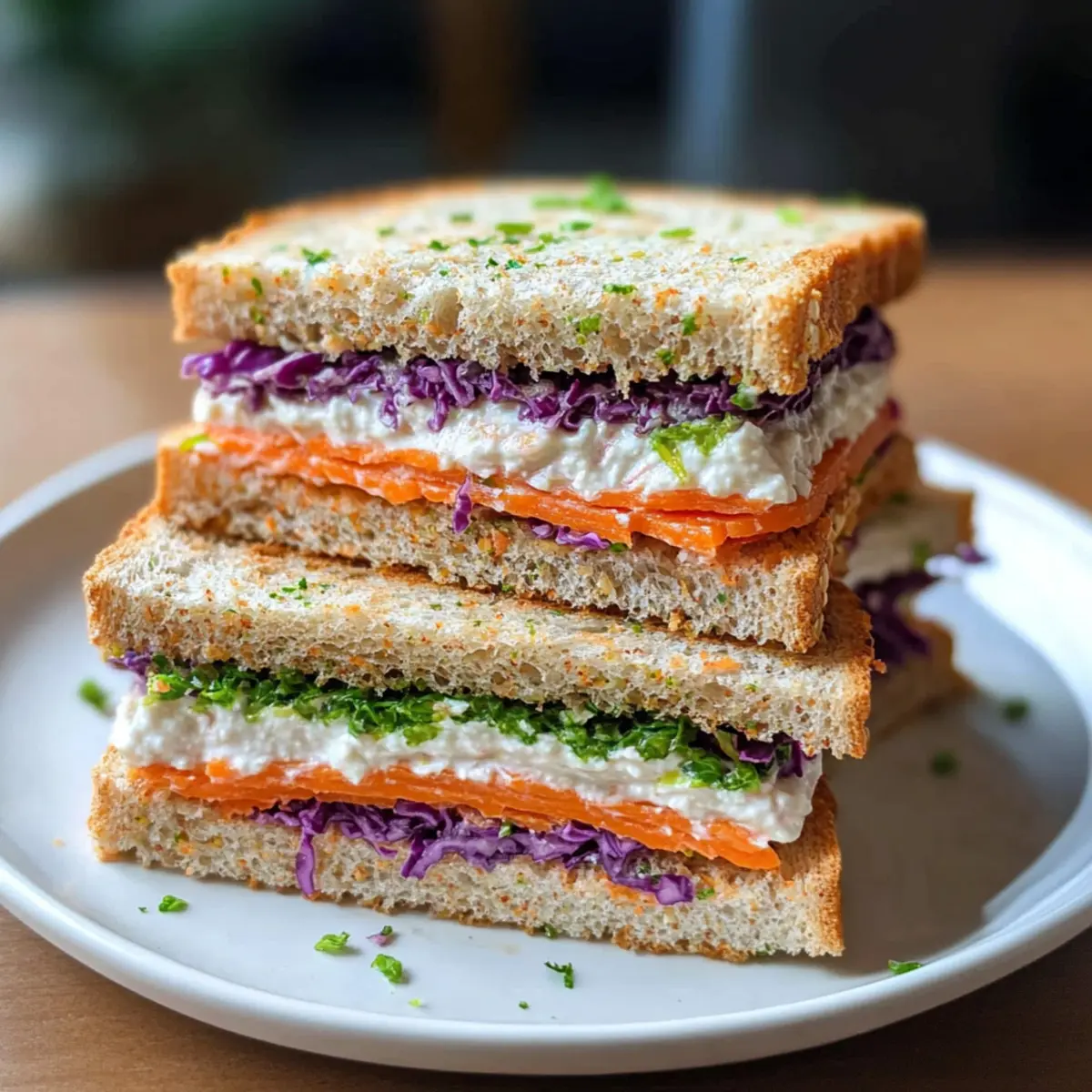 Diese Teeparty-Sandwiches sind perfekt für alle, die vielbeschäftigt sind und dennoch gesunde Snacks genießen möchten! Du kannst die Joghurtfüllung bis zu 24 Stunden im Voraus zubereiten, indem du den Joghurt abtropfen lässt und dann mit der fein gehackten Karotte und dem roten Kohl vermischst. Achte darauf, die Sandwiches in Wachspapier und ein leicht feuchtes Papiertuch einzuwickeln, um sie frisch zu halten und ein Durchweichen zu verhindern. Am Serviertag einfach die vorbereiteten Sandwiches in Hälften oder kleine Stücke schneiden und auf einem hübschen Teller anrichten. So sparst du nicht nur Zeit, sondern hältst auch die Qualität und den Geschmack der Teeparty-Sandwiches auf höchstem Niveau!