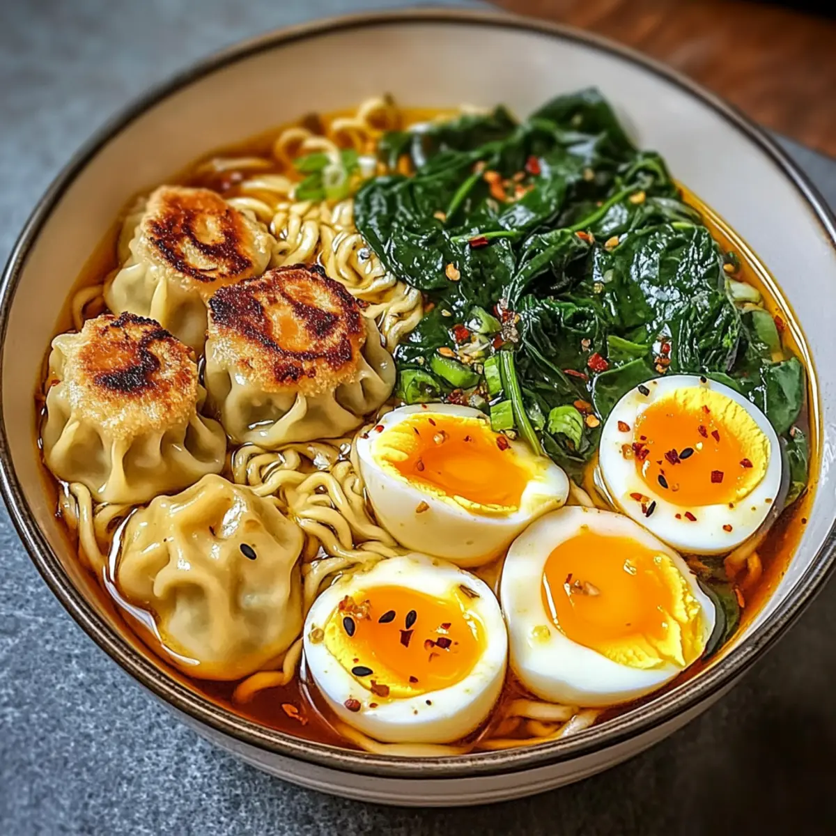 Hinweis: Bereite dich darauf vor, in eine wohltuende und herzhafte Teigtaschen Ramen Schüssel einzutauchen, die deine Geschmacksknospen verzaubern wird!