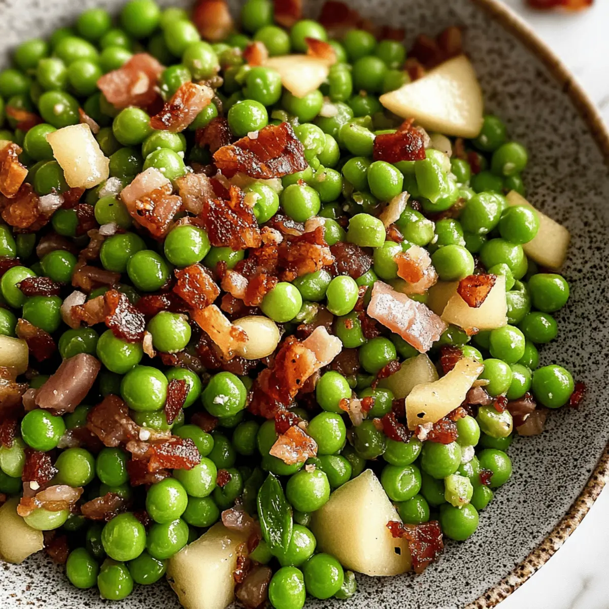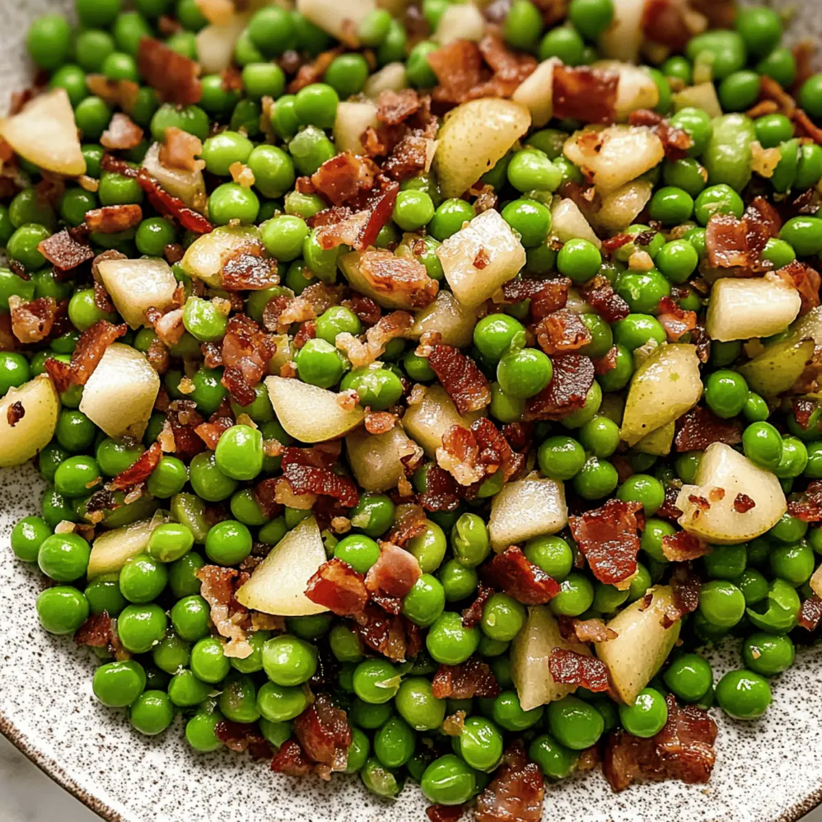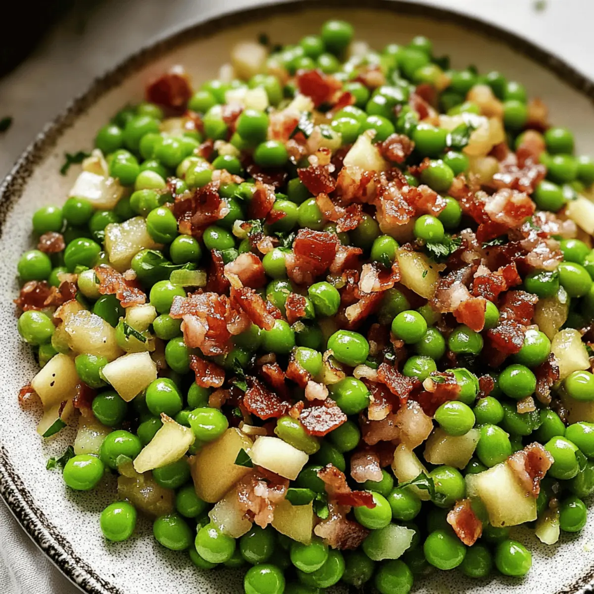 Während ich in der Küche an meinen Feiertagsvorbereitungen arbeitete, erreichte mich ein verlockender Duft, der mich in die Höhe schnellen ließ. Es war die Kombination aus knusprigem Pancetta und süßer Birne – ein perfektes Gefühl, um meine Thanksgiving Erbsen zu verfeinern. Diese aromatische Beilage verwandelt die klassischen grünen Erbsen in ein Fest der Aromen und ist zudem super einfach zuzubereiten. In nur wenigen Minuten gelingt dir mit diesem Rezept ein schmackhaftes Gericht, das nicht nur deinen Gaumen erfreut, sondern auch auf jedem Festtagsbuffet zum Hingucker wird. Die Verbindung von zarten Erbsen, herzhaftem Pancetta und frischer Zitrone bringt eine unwiderstehliche Note auf deinen Tisch. Bist du bereit, dein Thanksgiving-Menü zu bereichern und alle Gäste mit einem einfachen, aber eindrucksvollen Gericht zu beeindrucken? Warum sind diese Erbsen ein Hit? Einfachheit, diese leckeren Thanksgiving Erbsen mit Pancetta und Birne sind in kürzester Zeit zubereitet und erfordern nur grundlegende Kochkünste. Aromatische Kombination aus süßer Birne und herzhaftem Pancetta sorgt für einen unvergesslichen Geschmack, der sich von anderen Beilagen abhebt. Vielseitigkeit ist ein weiteres Plus: Ersetze Bacon für Pancetta oder lasse das Fleisch ganz weg für eine vegetarische Variante. Perfekt für Feiern, sie sind nicht nur eine großartige Ergänzung zu deinem Festessen, sondern auch ein echter Blickfang auf jedem Buffet. Wenn du andere genussvolle Beilagen suchst, schau dir auch meine Taco Reis Suppe an, die sich wunderbar kombinieren lässt! Zutaten für Thanksgiving Erbsen • Die perfekten Zutaten für deine Thanksgiving Erbsen mit Pancetta erwarten dich! Für die Erbsen Pancetta – verleiht einen herzhaften Geschmack und eine knusprige Textur; du kannst auch gewürfelten Speck verwenden, wenn du das bevorzugst. Schalotten – sorgen für eine milde Zwiebelsüße beim Anbraten; gelbe Zwiebeln sind ein geeigneter Ersatz, wenn Schalotten nicht zur Hand sind. Dijon-Senf – hebt den Geschmack an und fügt eine subtile Säure hinzu; alternativ kannst du auch groben Senf nutzen für eine andere Textur. Gefrorene Erbsen – bieten Bequemlichkeit und eine süße, zarte Konsistenz; frische Erbsen sind ebenfalls eine wunderbare Wahl, wenn du sie bekommst. Birne – bringt Süße und einen saftigen Kontrast; eine feste Apfelsorte ist ein guter Ersatz, falls du keine Birnen hast. Zitrone – sorgt für ein spritziges Aroma durch Zesten und Saft, was die Reichhaltigkeit ausgleicht; Limette funktioniert auch gut als Alternative. Petersilie – fügt Frische und Farbe hinzu; du kannst auch Schnittlauch verwenden für einen milderen Geschmack. Schwarzer Pfeffer – sorgt für die notwendige Würze; passe die Menge nach deinem Geschmack an. Schritt-für-Schritt-Anleitung für köstliche Thanksgiving Erbsen mit Pancetta und Birne Step 1: Birne vorbereiten Schäle die Birne, schneide sie in kleinen Würfeln und beträufle sie mit etwas Zitronensaft, damit sie nicht braun wird. Achte darauf, gleichmäßig gewürfelte Stücke zu schneiden, um eine gleichmäßige Garzeit zu garantieren. Stelle die vorbereitete Birne beiseite, während du mit dem nächsten Schritt fortfährst. Step 2: Pancetta anbraten Erhitze eine große, beschichtete Pfanne bei mittlerer Hitze. Gebe die gewürfelte Pancetta hinein und brate sie etwa 5–7 Minuten lang, bis sie knusprig und goldbraun ist. Achte darauf, die Pancetta regelmäßig umzurühren, damit sie gleichmäßig bräunt. Nimm die Pancetta aus der Pfanne und lasse sie auf einem Küchenpapier abtropfen, während du das Fett in der Pfanne belässt. Step 3: Schalotten sautieren Füge die geschnittenen Schalotten in die gleiche Pfanne mit etwa 3 Esslöffeln des gepflegten Pancetta-Fettes hinzu. Koche die Schalotten für ungefähr 1–2 Minuten, bis sie weich und leicht durchsichtig sind. Rühre den Dijon-Senf ein und lass ihn für eine weitere Minute anbraten, damit sich die Aromen entfalten. Step 4: Zutaten kombinieren Gib die gefrorenen Erbsen und die gewürfelte Birne in die Pfanne zu den Schalotten. Rühre alles gut um und lasse es etwa 5 Minuten lang köcheln, bis die Erbsen durchgewärmt und die Birne leicht weich ist. Die Erbsen sollten eine frische grüne Farbe behalten, während die Aromen miteinander verschmelzen. Step 5: Gericht vollenden Nimm die Pfanne vom Herd und rühre die Hälfte der knusprigen Pancetta, die gehackte Petersilie und frisch gemahlenen schwarzen Pfeffer unter die Mischung. Übertrage die Thanksgiving Erbsen mit Pancetta und Birne in eine Servierschüssel und streue die restliche Pancetta oben drauf. Garniere das Gericht mit etwas Zitronenzeste für zusätzlichen Geschmack und einen schönen Farbkontrast. Was passt zu Thanksgiving Erbsen mit Pancetta und Birne? Diese festlichen Erbsen sind der perfekte Begleiter für ein beeindruckendes Thanksgiving-Menü und lassen sich wunderbar mit verschiedenen Gerichten und Beilagen kombinieren. Knusprige Ofenkartoffeln: Diese goldbraun gebackenen Kartoffeln bieten einen wunderbaren Kontrast zur zarten Textur der Erbsen und Pancetta. Ihr rustikaler Geschmack harmoniert perfekt mit den erfrischenden Aromen. Zarter Truthahn: Saftiger, gebratener Truthahn passt hervorragend zu diesem Gericht. Die herzhaften Aromen ziehen alle Elemente des Menüs zusammen und sorgen dafür, dass sie sich gegenseitig ergänzen. Cremige Polenta: Die samtige Polenta ist eine großartige Basis, die mit der Süße der Birne und dem Salzgeschmack der Pancetta harmoniert. Sie bringt eine schöne, cremige Textur ins Spiel. Geröstetes Gemüse: Eine bunte Mischung aus geröstetem Gemüse wie Karotten, Süßkartoffeln und Rosenkohl sorgt für zusätzliche Farb- und Geschmacksakzente in deinem Festtagsmenu. Spritzige Cranberry-Sauce: Die säuerliche Note der Cranberry-Sauce gleicht die Süße der Erbsen aus und bringt einen zusätzlichen festlichen Touch auf den Tisch. Feiner Weißwein: Eine Flasche gut gekühlter Sauvigno