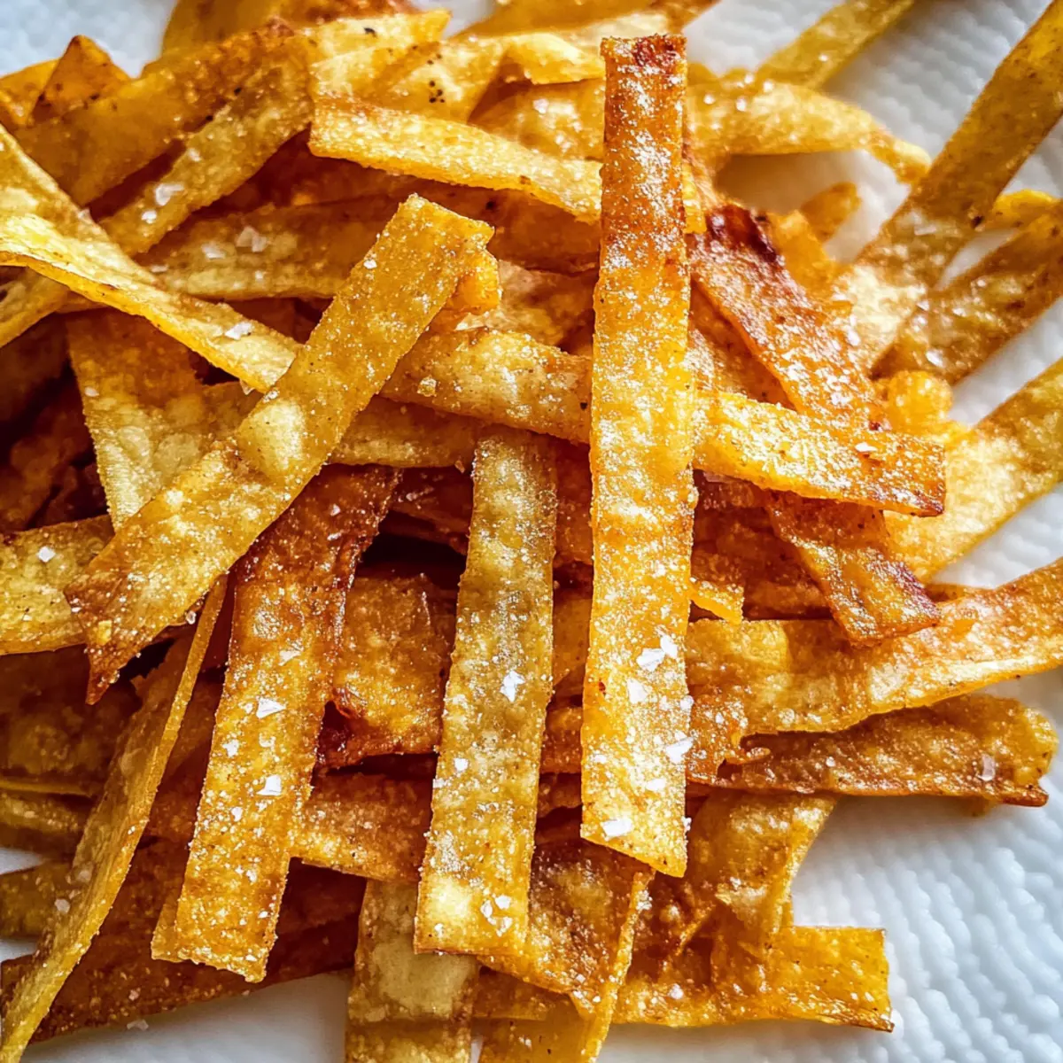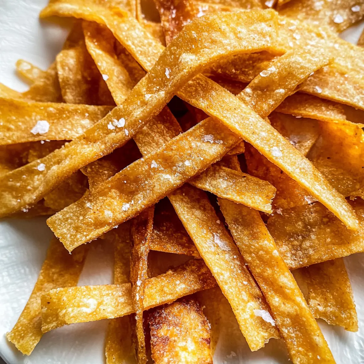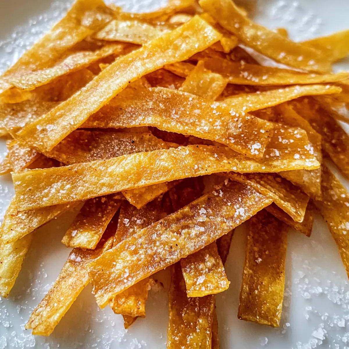 Als ich neulich in meiner Küche stand, spürte ich die Vorfreude auf eine knusprige Überraschung. Diese Tortillastreifen sind der Inbegriff von Einfachheit und Genuss: Mit nur drei Zutaten lassen sie sich schnell zubereiten und bieten eine perfekte, knusprige Ergänzung zu all deinen Lieblingsgerichten. Egal, ob du sie als Topping für Chili, in Salaten oder einfach als Snack genießt – sie sind unglaublich vielseitig und schmecken einfach großartig. Zudem haben sie den Vorteil, dass sie in der Back- oder Fritteuse zubereitet werden können, was dir die Freiheit gibt, je nach Laune zu wählen. Bist du bereit, den nächsten Schritt zu wagen und deine eigenen knusprigen Tortillastreifen zu kreieren? Warum sind Tortillastreifen so beliebt? Einfachheit: Die Zubereitung ist ein Kinderspiel – du benötigst nur drei Zutaten und hast in wenigen Minuten köstliche Tortillastreifen! Knuspriger Genuss: Diese Streifen bieten eine perfekte Textur und den unwiderstehlichen Crunch, den du von klassischen Snacks erwartest. Vielseitigkeit: Ob als Topping für Chili, als Snack mit Salsa oder in Salaten – sie passen überall perfekt dazu. Zwei Zubereitungsarten: Wähle zwischen dem gesünderen Backen oder dem traditionellen Frittieren, je nachdem, worauf du gerade Lust hast. Gesunde Alternative: Gönn dir diesen Snack, der mit nur etwa 100 Kalorien pro Portion leicht in deine Diät passt. Wenn du mehr gesunde Snacks suchst, schau dir auch meine Snack-Ideen für jeden Anlass an! Tortillastreifen Zutaten • Für die Tortillastreifen Mais-Tortillas – Diese sind die Hauptzutat und sorgen für die Grundlage der Streifen; du kannst sogar frische Tortillas verwenden. Koshersalz – Verleiht den Tortillastreifen den perfekten Geschmack; passe die Menge nach eigenem Geschmack an. Olivenöl-Spray (oder Gemüse-/Rapsöl zum Frittieren) – Hilft beim Knusprigwerden. Olivenöl bringt zusätzliches Aroma, während Gemüse- oder Rapsöl ideal zum Frittieren ist. • Für die Gewürze (optional) Chilipulver – Für eine würzige Note, die deinen Tortillastreifen mehr Charakter verleiht. Knoblauchpulver – Perfekt für einen zusätzlichen Geschmackskick, der deine Streifen noch köstlicher macht. Limettenschale – Ein frischer Zitrusgeschmack, der das Aroma der Tortillastreifen hebt. Diese Tortillastreifen sind nicht nur vielseitig, sie sind auch schnell und einfach zuzubereiten, was sie zu einem perfekten Snack oder Topping macht! Schritt-für-Schritt-Anleitung für knusprige Tortillastreifen Step 1: Ofen vorheizen und Tortillas vorbereiten Heize deinen Ofen auf 190°C vor. Nimm die Mais-Tortillas und lege sie nebeneinander auf ein Schneidebrett. Sprühe jede Tortilla leicht mit Olivenöl und bestreue sie anschließend gleichmäßig mit Koshersalz. So erhältst du die perfekte Basis für deine knusprigen Tortillastreifen. Step 2: Tortillas schneiden Schneide die gewürzten Tortillas in gleichmäßige Streifen von etwa 1,5 cm Breite. Achte darauf, dass die Streifen nicht zu dick sind, damit sie gleichmäßig knusprig werden. Nutze dafür ein scharfes Messer oder ein Pizzaschneider für ein präzises Ergebnis. Step 3: Tortillastreifen backen Lege die Tortillastreifen in einer einzigen Schicht auf ein mit Backpapier ausgelegtes Backblech. Backe sie im vorgeheizten Ofen für 6 Minuten. Nimm das Blech dann heraus, wende die Streifen und backe sie weitere 6 Minuten, bis sie goldbraun und knusprig sind. Achte darauf, dass sie nicht verbrennen. Step 4: Tortillastreifen abkühlen lassen Nach dem Backen die Tortillastreifen auf ein Gitter legen, damit sie gleichmäßig abkühlen und ihre Knusprigkeit behalten. Lass sie für mindestens 5 Minuten ruhen. Diese kleinen Schritte sind wichtig, um das perfekte Finale für deine Tortillastreifen zu erzielen. Step 5: Frittiermethode wählen Falls du die Frittiermethode bevorzugst, erhitze etwa einen halben Zentimeter tiefes Gemüse- oder Rapsöl in einer großen Pfanne bei mittlerer bis hoher Hitze. Stelle sicher, dass das Öl heiß genug ist, indem du einen kleinen Tropfen Wasser hinein gibst – es sollte sofort zischen. Step 6: Tortillastreifen frittieren Schneide die Tortillas weiterhin in Streifen und gib sie in das heiße Öl in Chargen. Frittiere sie für 3-5 Minuten, bis sie goldbraun sind und eine knusprige Textur erhalten. Denke daran, die Streifen nach dem Frittieren sofort mit Koshersalz zu bestreuen. Step 7: Cool down and store Lege die frittierten Tortillastreifen nach dem Frittieren auf ein mit Küchenpapier ausgelegtes Blech, um überschüssiges Öl abtropfen zu lassen. Lass sie einige Minuten abkühlen, bevor du sie in einen luftdichten Behälter gibst. So bleiben deine Tortillastreifen frisch und knusprig für bis zu einer Woche. Vorbereitung der Tortillastreifen für eine stressfreie Woche Die Zubereitung von Tortillastreifen im Voraus ist eine hervorragende Möglichkeit, deinen Wochenplan zu entlasten! Du kannst die Tortillas bis zu 24 Stunden zuvor vorbereiten, indem du sie in Streifen schneidest und in einem luftdichten Behälter im Kühlschrank aufbewahrst. Wenn du die Backmethode wählst, sprühe die Streifen kurz vor dem Backen mit Olivenöl und bestreue sie mit Salz, um die Frische zu gewährleisten. Solltest du die Frittiermethode bevorzugen, stelle sicher, dass das Öl beim Frittieren heiß genug ist, um ein Sumpfen der Streifen zu vermeiden. Sobald du bereit bist, deine knusprigen Tortillastreifen zu genießen, backe sie einfach 12 Minuten lang bei 190 °C oder frittiere sie für 3-5 Minuten. So hast du den perfekten Snack oder Topping, der dir wertvolle Zeit spart! Aufbewahrungstipps für Tortillastreifen Raumtemperatur: Bewahre die abgekühlten Tortillastreifen in einem luftdichten Behälter auf; sie bleiben so bis zu einer Woche knusprig und frisch. Kühlschrank: Falls du sie länger aufbewahren möchtest, kannst du sie im Kühlschrank lagern, jedoch verlieren sie eventuell etwas von ihrer Knusprigkeit. Aufwärmen: Um die Tortillastreifen wied