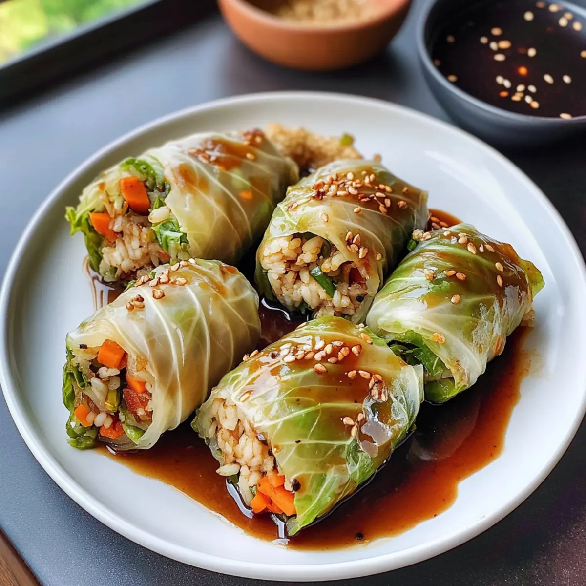 Verteile die fertigen veganen Kohlrouladen auf einem Servierteller und träufle die reichhaltige Knoblauchsoße darüber. Garnieren mit gerösteten Sesamkörnern für zusätzlichen Crunch und Geschmack. Jetzt sind deine veganen Kohlrouladen mit herzhaftem Dip bereit zum Genießen!