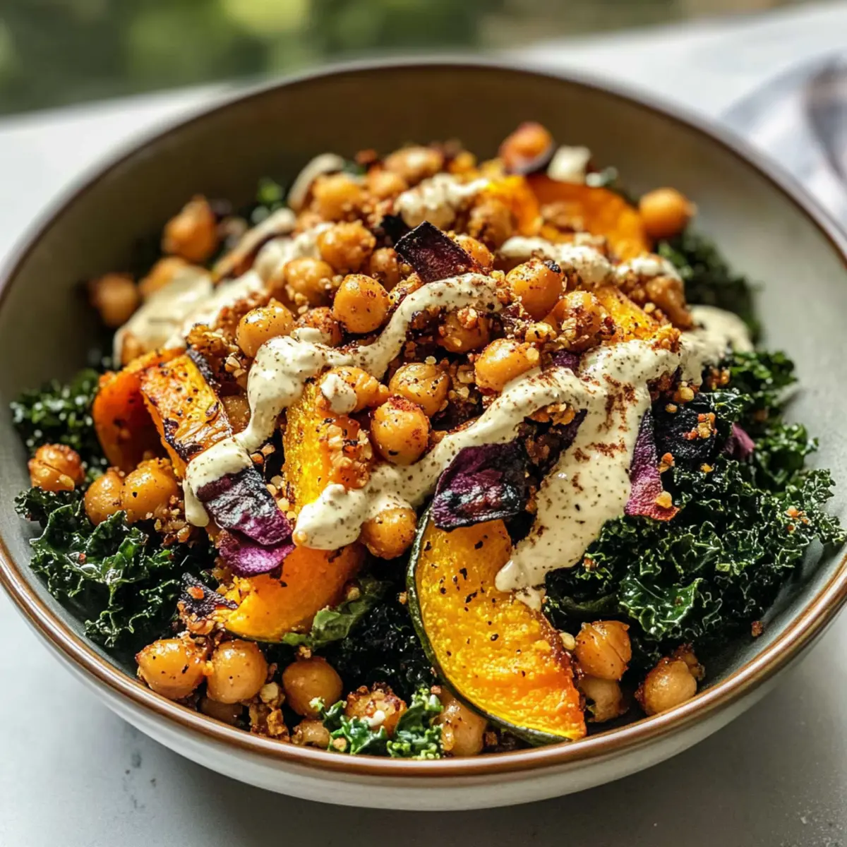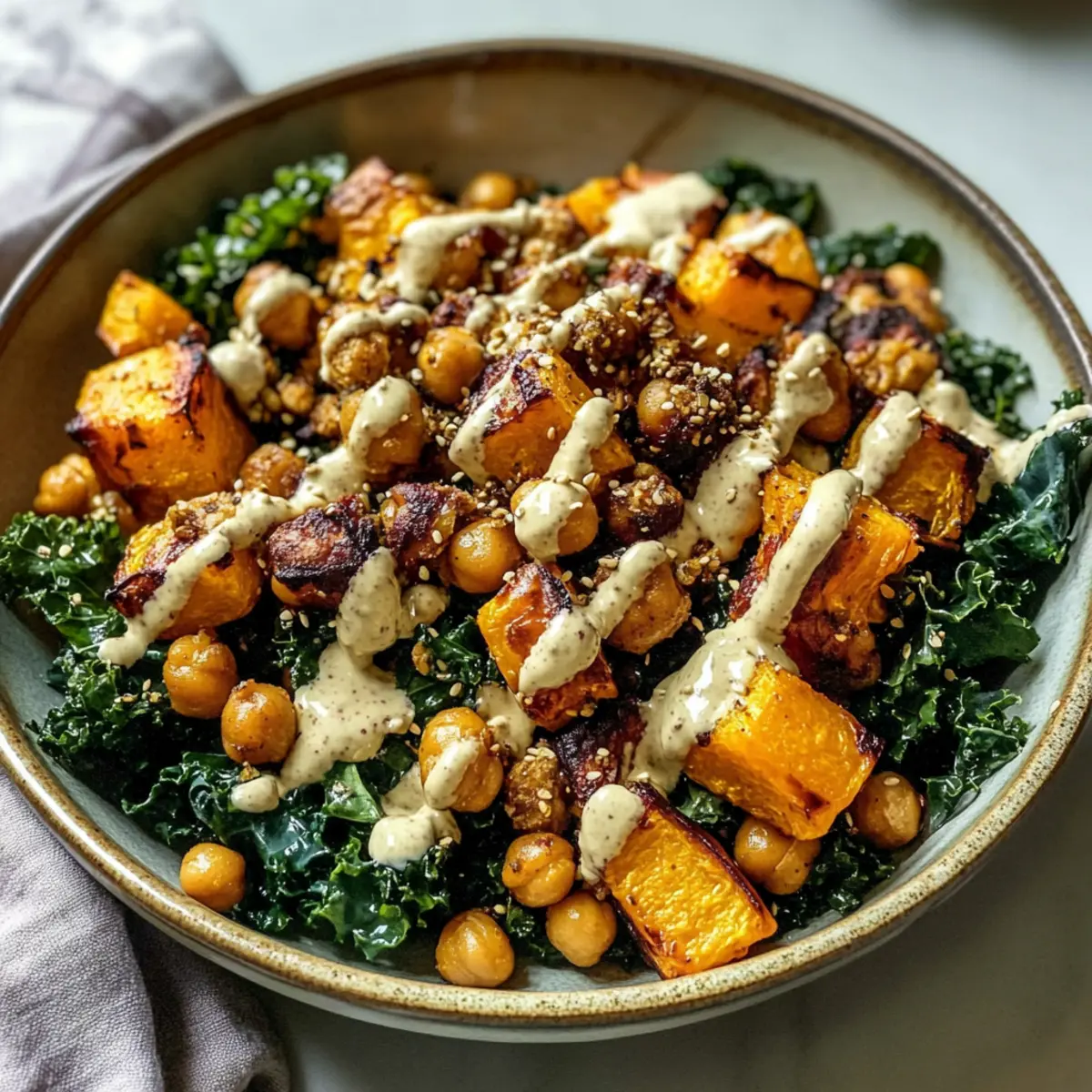 Die kühle Brise des Herbstes bringt nicht nur eine erfrischende Atmosphäre mit sich, sondern auch eine Fülle an köstlichen, saisonalen Zutaten, die darauf warten, entdeckt zu werden. Heute lade ich euch ein, mit mir in die Welt des veganen Genusses einzutauchen, und euch einen gesunden veganen gerösteten Herbsternte-Salat vorzustellen. Durch die Kombination von zartem, geröstetem Honeynut-Kürbis und knusprigen Kichererbsen ist dieses Gericht nicht nur ein Augenschmaus, sondern auch ein sättigendes Highlight für eure herbstlichen Abende. Und das Beste? Dieses Rezept ist ideal zum Vorbereiten, was es zu einer praktischen Wahl für alle macht, die das hektische Alltagsleben balancieren möchten. Seid ihr bereit, die Aromen des Herbstes zu feiern und eure Küche mit einem Hauch von Wärme zu füllen? Warum ist dieser Herbstsalat ein Hit? Vibrante Farben: Der Vegane geröstete Herbsternte-Salat ist eine Augenweide mit seinen leuchtenden Farben und ansprechenden Texturen, die Lust auf mehr machen. Einfachheit: Mit nur wenigen Zutaten und unkomplizierten Schritten ist der Salat ideal für Kochanfänger und beschäftigt Köche gleichermaßen. Saisonale Aromen: Genießt den Geschmack des Herbstes mit saisonalen Zutaten, die die frische Vielfalt dieser Jahreszeit perfekt zur Geltung bringen. Köstliche Vielseitigkeit: Ob als Hauptgericht oder Beilage, dieser Salat passt hervorragend zu vielen Gerichten und ist ein Hit bei jeder Gelegenheit. Verwendet ihn zum Beispiel als Begleitung zu einem warmen Pita-Brot für eine herzliche Mahlzeit! Vorbereitungsfreundlich: Dank seiner Make-Ahead-Möglichkeiten ist dieser Salat perfekt für den stressigen Alltag und bleibt im Kühlschrank bis zu 4 Tage frisch. Veganer gerösteter Herbsternte-Salat Zutaten Für den Salat Honeynut-Kürbis – bringt eine süße, tiefe Geschmacksnote und eine herzhafte Textur; kann durch Butternut-Kürbis oder Süßkartoffeln ersetzt werden. Kichererbsen – liefern Protein und Knusprigkeit beim Rösten; achte darauf, sie gründlich zu trocknen, damit sie perfekt knusprig werden. Quinoa – dient als nahrhafter Grundbaustein, der einen nussigen Geschmack hinzufügt. Lacinato-Grünkohl – bietet eine robuste Basis, die von einer Massage mit Öl profitiert, um die Textur zu verbessern. Für das Dressing Tahini – kreiert ein reichhaltiges, cremiges Dressing; kann bei Nussallergien durch Sonnenblumenkernbutter ersetzt werden. Zitronensaft – hellt die Aromen im Dressing auf und verstärkt den Geschmack; Limettensaft kann auch verwendet werden. Ahornsirup – fügt dem Dressing eine süße Note hinzu; Honig kann als nicht-veganer Ersatz verwendet werden. Kreuzkümmel, Koriander, Zwiebelpulver, Knoblauchpulver, Cayennepfeffer, Ceylon-Zimt – diese Gewürzmischung hebt die Aromen der gerösteten Zutaten hervor; passe die Mengen nach deinem persönlichen Schärfewunsch an. Optional Kürbiskerne – bringen einen zusätzlichen Crunch und sind eine tolle Proteinquelle. Rosinen oder Datteln – bieten eine süße Komponente, die perfekt mit dem herzhaften Geschmack des Salats harmoniert. Erleben Sie die Aromen dieses veganen gerösteten Herbsternte-Salats und genießen Sie eine nahrhafte und köstliche Mahlzeit zu Hause! Schritt-für-Schritt-Anleitungen für den Veganen gerösteten Herbsternte-Salat Step 1: Ofen vorheizen und Backblech vorbereiten Heize den Ofen auf 230°C (450°F) vor und lege ein Backblech mit Backpapier aus. Dies verhindert, dass die Zutaten anhaften und sorgt für einfaches Wenden der Kichererbsen und des Kürbisses. Die hohe Temperatur sorgt dafür, dass sie schön karamellisieren und knusprig werden. Step 2: Gewürze mischen Mische in einer kleinen Schüssel die Gewürze: Kreuzkümmel, Koriander, Zwiebelpulver, Knoblauchpulver, Cayennepfeffer und Ceylon-Zimt. Diese aromatische Mischung wird später die Kichererbsen und den Honig-Nuss-Kürbis verfeinern. Stelle die Mischung beiseite, um sie in den nächsten Schritt zu verwenden. Step 3: Kichererbsen und Kürbis würzen Gib die trockenen Kichererbsen und die gewürfelten Honeynut-Kürbisstücke in eine große Schüssel. Füge einen Schuss Olivenöl, die Gewürzmischung und etwas Salz hinzu. Vermenge alles gründlich, bis die Kichererbsen und der Kürbis gleichmäßig mit der Mischung bedeckt sind. Dies sorgt für optimalen Geschmack. Step 4: Rösten der Zutaten Verteile die gewürzten Kichererbsen und den Kürbis gleichmäßig auf dem vorbereiteten Backblech. Röste alles für 25-30 Minuten im vorgeheizten Ofen, und rühre nach der Hälfte der Zeit um, bis sie goldbraun und zart sind. Beobachte, dass sie nicht anbrennen, während sie vor sich hin rösten. Step 5: Quinoa kochen Spüle die Quinoa gründlich unter kaltem Wasser ab, um Bitterstoffe zu entfernen. Bring in einem Topf 1 Tasse Wasser zum Kochen und füge die Quinoa hinzu. Reduziere die Hitze und lasse die Quinoa 10-12 Minuten köcheln, bis das Wasser vollständig aufgesogen ist. Nach dem Kochen den Topf abdecken und die Quinoa 10 Minuten ruhen lassen. Step 6: Grünkohl vorbereiten Entferne die Stiele des Lacinato-Grünkohls und schneide die Blätter in kleine Stücke. Massiere die Grünkohlblätter mit etwas Olivenöl und einer Prise Salz für 2-3 Minuten gut durch, bis sie weich und geschmeidig sind. Dadurch wird der Grünkohl zarter und besser verdaulich, was die Basis für deinen vegane geröstete Herbsternte-Salat bildet. Step 7: Dressing zubereiten In einer Schüssel verrühre Tahini, Zitronensaft, Apfelessig, Ahornsirup, Knoblauchpulver, Cayennepfeffer, Ceylon-Zimt und Salz, bis die Mischung cremig und glatt ist. Das Dressing ist wichtig für den Geschmack deines veganen gerösteten Herbsternte-Salats und sollte gut durchgezogen werden. Step 8: Salat zusammenstellen In einer großen Schüssel kombiniere die gekochte Quinoa, die gerösteten Kichererbsen und den Kürbis sowie Kürbiskerne und Rosinen oder Datteln. Füge den massierten Grünkohl hinzu und gieße die Hälfte des Dressings darüb