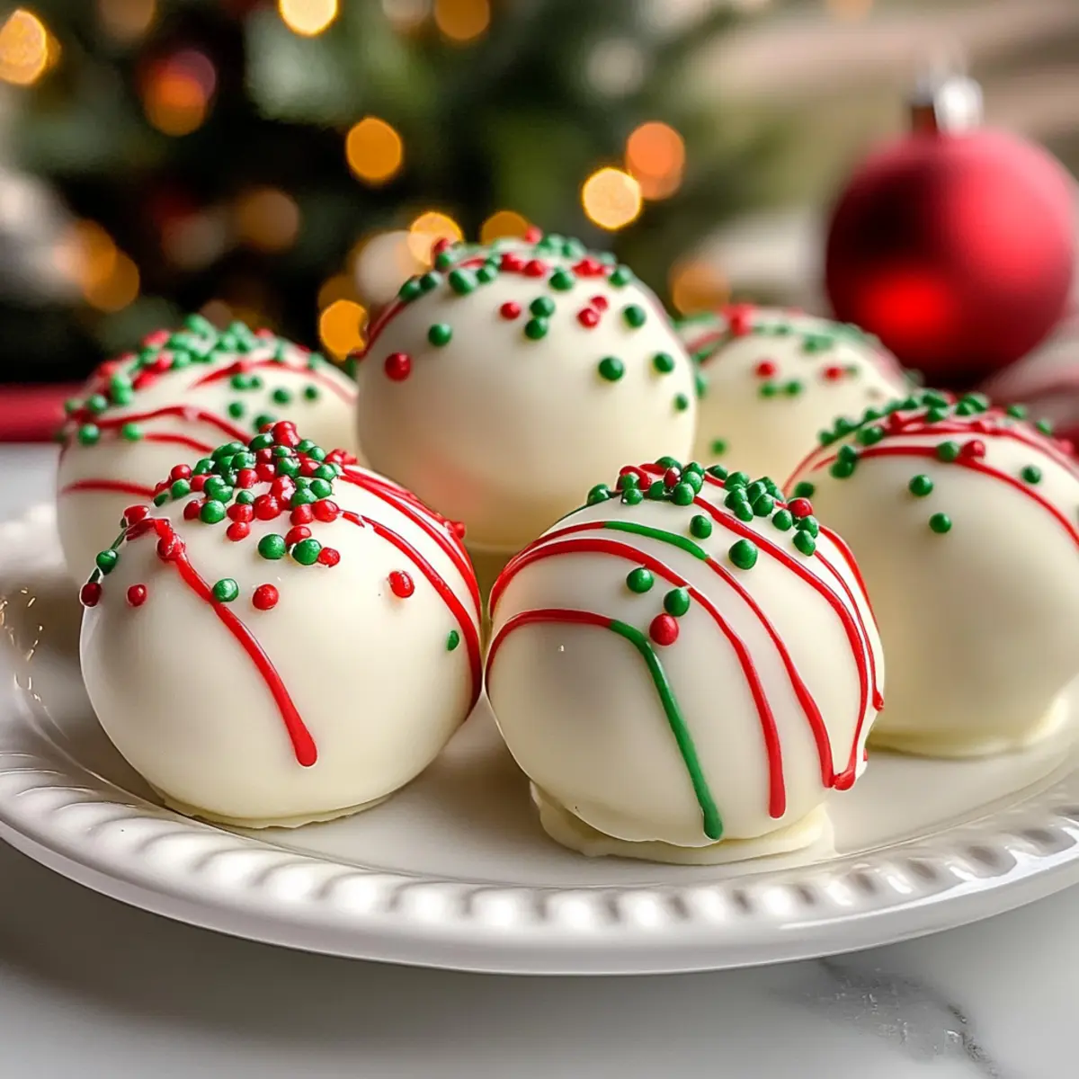 7. Optional: Schmelze die roten und grünen Candy Melts in kleinen Spritzbeuteln und drizzlere sie dekorativ über die gekühlten Kugeln.