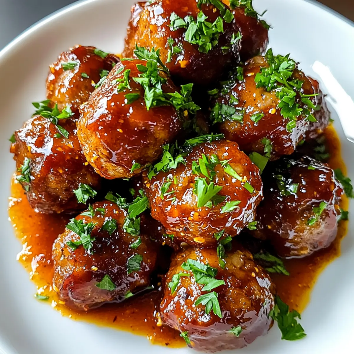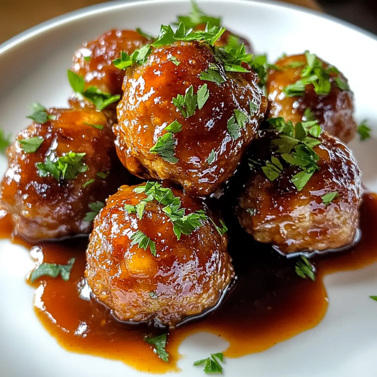 Es war ein warmer Abend, als ich beim Grillen mit Freunden das Rezept für Whiskey-Pfirsich-BBQ-Fleischbällchen entdeckte. Diese kleinen Köstlichkeiten vereinen saftiges Rind- und Schweinefleisch mit einer einzigartigen Kombination aus süßen Pfirsichmarmelade und einem whiskey-infundierten BBQ-Dressing. Ein Bissen und ich war begeistert von der perfekten Balance aus süß und herzhaft. Diese Fleischbällchen sind nicht nur schnell zubereitet, sondern auch das ideale Fingerfood für Partys oder als Hauptgericht an einem entspannten Abend. Wenn du auf der Suche nach einer neuen, aufregenden Rezeptidee bist, die sowohl Freunde als auch Familie begeistert, dann sind diese Whiskey-Pfirsich-BBQ-Fleischbällchen genau das Richtige. Bist du bereit, deinen nächsten Grillabend zu revolutionieren? Warum sind diese Fleischbällchen ein Hit? Einzigartig: Die Kombination aus Whiskey und Pfirsichmarmelade verleiht jedem Bissen einen aufregenden Twist, der deine Geschmacksnerven kitzeln wird. Schnell zubereitet: In nur 30 Minuten hast du ein köstliches Gericht, das Warten überflüssig macht – ideal für spontane Dinnerpartys! Vielseitig: Ob als herzhaftes Hauptgericht oder als Fingerfood für die nächste Feier, diese Fleischbällchen passen zu jeder Gelegenheit. Gesellig: Bring deine Gäste zusammen, während sie sich um die Platte mit diesen leckeren Leckerbissen versammeln – sie werden einfach nicht genug davon bekommen! Anpassbar: Du kannst die Fleischsorten ganz nach deinem Geschmack variieren und auch glutenfreie Optionen nutzen, um jedem gerecht zu werden. Teste auch unsere anderen köstlichen Fingerfood-Rezepte! Whiskey-Pfirsich-BBQ-Fleischbällchen Zutaten Hinweis: Bereite dich vor, bei deinem nächsten Grillabend oder Fest alle mit diesen Whiskey-Pfirsich-BBQ-Fleischbällchen zu beeindrucken! Für die Fleischbällchen • Rinderhackfleisch – Verleiht einen kräftigen, herzhaften Geschmack; als leichtere Variante eignet sich auch Putenhack. • Schweinehackfleisch – Gibt Süße und eine saftige Textur; leicht substituierbar durch Hähnchen- oder Putenhack, jedoch die Feuchtigkeit anpassen. • Semmelbrösel – Binden die Mischung und sorgen für zarte Fleischbällchen; glutenfreie Semmelbrösel sind eine gute Alternative. • Zwiebel – Für einen aromatischen Geschmack und leichte Knusprigkeit; kannst auch Schalotten verwenden, wenn du einen sanfteren Geschmack bevorzugst. • Milch – Hält die Semmelbrösel feucht und sorgt für eine weiche Textur; pflanzliche Milchalternative wie Mandelmilch kann genutzt werden. • Knoblauch – Bringt eine pikante Wärme; wenn du keinen frischen Knoblauch hast, geht auch Knoblauchpulver. • Eier – Binden die Mischung und sorgen dafür, dass die Fleischbällchen beim Kochen ihre Form behalten. • Salz und schwarzer Pfeffer – Für die perfekte Geschmacksbalance; nach Belieben anpassen. Für die Sauce • Pfirsichmarmelade – Basis der Sauce, liefert fruchtige Süße; kann gegen Aprikosen- oder Mangomarmelade ersetzt werden. • BBQ-Sauce – Bringt eine rauchige und würzige Note; wähle eine Marke, die deinem Geschmack entspricht. • Whiskey – Fügt Tiefe und komplexe Aromen hinzu; für eine alkoholfreie Version lasse den Whiskey weg. • Worcestershiresauce – Verstärkt die herzhafte Note; als Alternative kann Sojasauce verwendet werden. • Apfelessig – Sorgt für eine frische Note und balanciert die Süße der Sauce aus. • Dijonsenf – Fügt Schärfe hinzu und hilft, die Sauce zu emulgieren. • Brauner Zucker – Verstärkt die Süße und hilft, die Sauce zu verdicken; Honig kann ebenfalls verwendet werden. Mach dich bereit, mit diesen Whiskey-Pfirsich-BBQ-Fleischbällchen ein Geschmackserlebnis zu schaffen, das für Begeisterung sorgen wird! Schritt-für-Schritt-Anleitung für Whiskey-Pfirsich-BBQ-Fleischbällchen Step 1: Ofen vorheizen Heize den Ofen auf 190°C (375°F) vor, um eine gleichmäßige Backtemperatur zu gewährleisten. Dies sorgt dafür, dass die Whiskey-Pfirsich-BBQ-Fleischbällchen gleichmäßig garen und eine schöne, goldene Farbe erhalten. Step 2: Zutaten vermischen Gib in eine große Schüssel das Rinderhackfleisch, das Schweinehackfleisch, die Semmelbrösel, die fein gewürfelte Zwiebel, die Milch, den gehackten Knoblauch, die Eier sowie Salz und Pfeffer. Mische alles gründlich mit den Händen oder einem Löffel, bis die Mischung gut vermengt und homogen ist. Step 3: Fleischbällchen formen Entnehme von der Mischung etwa einen Esslöffel und forme damit kleine Bällchen von etwa 2,5 cm Durchmesser. Lege die Fleischbällchen gleichmäßig auf ein mit Backpapier ausgelegtes Backblech, sodass sie genügend Platz zum Garen haben. Step 4: Fleischbällchen backen Schiebe das Backblech in den vorgeheizten Ofen und backe die Whiskey-Pfirsich-BBQ-Fleischbällchen für ungefähr 18-20 Minuten. Die Fleischbällchen sind fertig, wenn sie durchgegart sind und eine innere Temperatur von 74°C (165°F) erreicht haben. Step 5: Sauce vorbereiten Während die Fleischbällchen backen, erhitze in einem kleinen Topf die Pfirsichmarmelade, die BBQ-Sauce, den Whiskey, die Worcestershiresauce, den Apfelessig, den Dijon-Senf und den braunen Zucker. Rühre die Mischung gut um und bringe sie bei mittlerer Hitze zum Köcheln. Step 6: Sauce köcheln lassen Lasse die Sauce für etwa 5 Minuten köcheln, damit sich die Aromen entfalten können. Rühre während des Kochens gelegentlich, bis die Sauce leicht eindickt und eine glatte Konsistenz erreicht hat. Step 7: Fleischbällchen in Sauce wälzen Nimm die gebackenen Fleischbällchen aus dem Ofen und gib sie vorsichtig in die Pfanne mit der warmen Sauce. Rühre sanft um, damit die Whiskey-Pfirsich-BBQ-Fleischbällchen gleichmäßig mit der Sauce überzogen sind. Step 8: Letzte köcheln lassen Lasse die Fleischbällchen für weitere 5 Minuten in der Sauce ziehen, damit sie die süß-rauchige Note der Sauce aufnehmen können. Diese letzte Kochphase sorgt dafür, dass die Geschmack