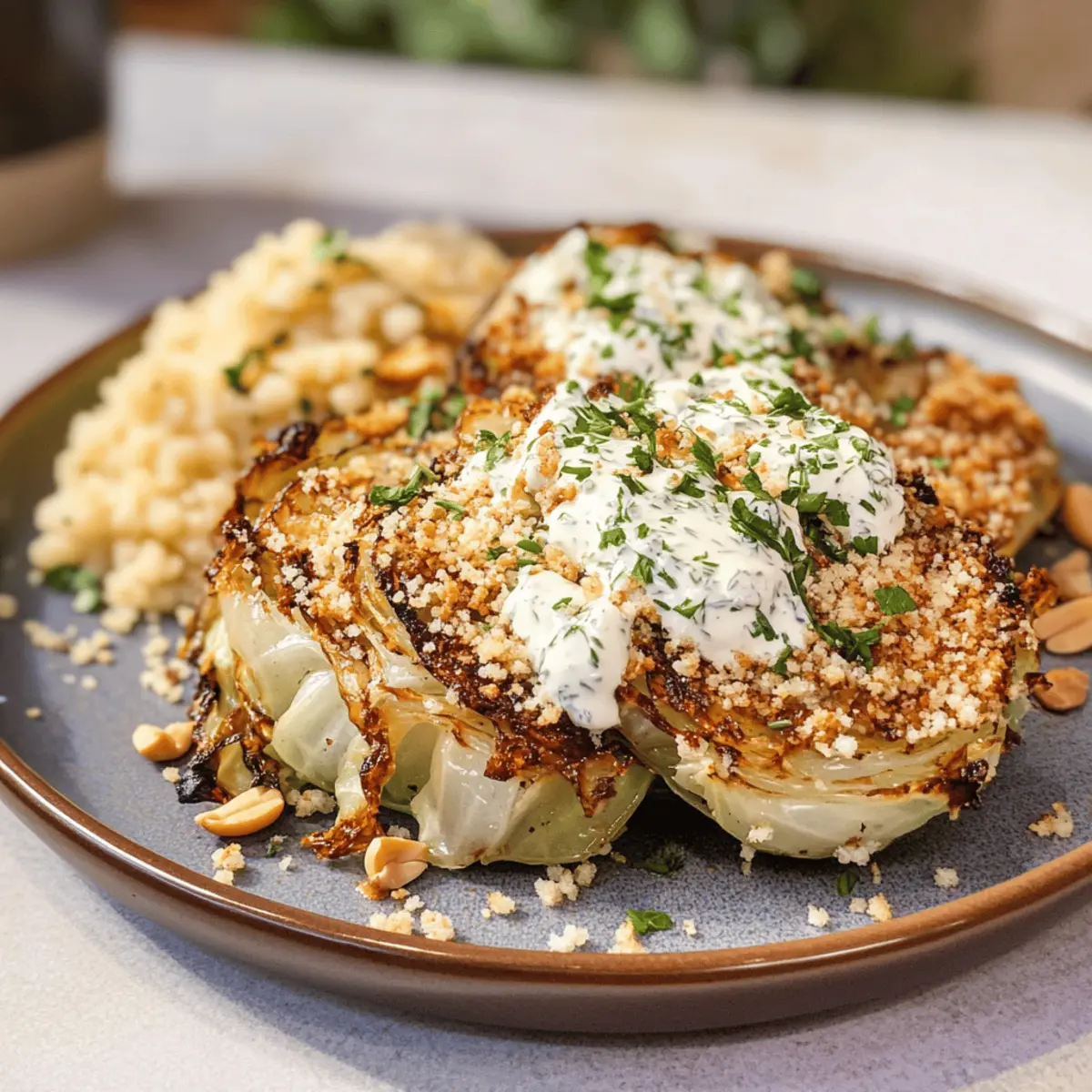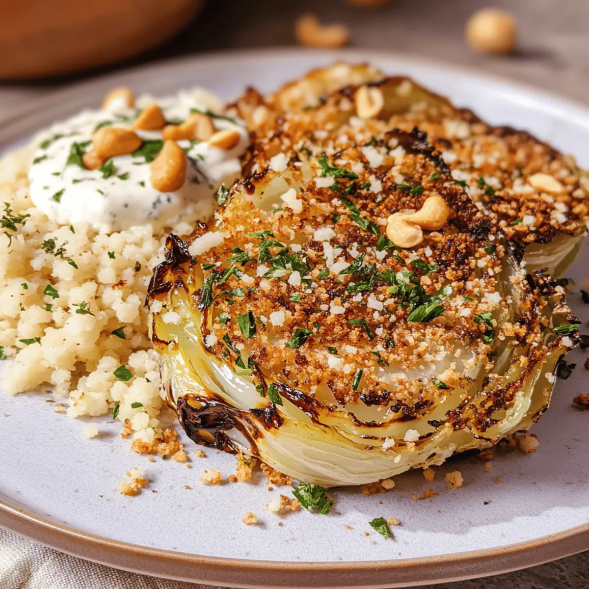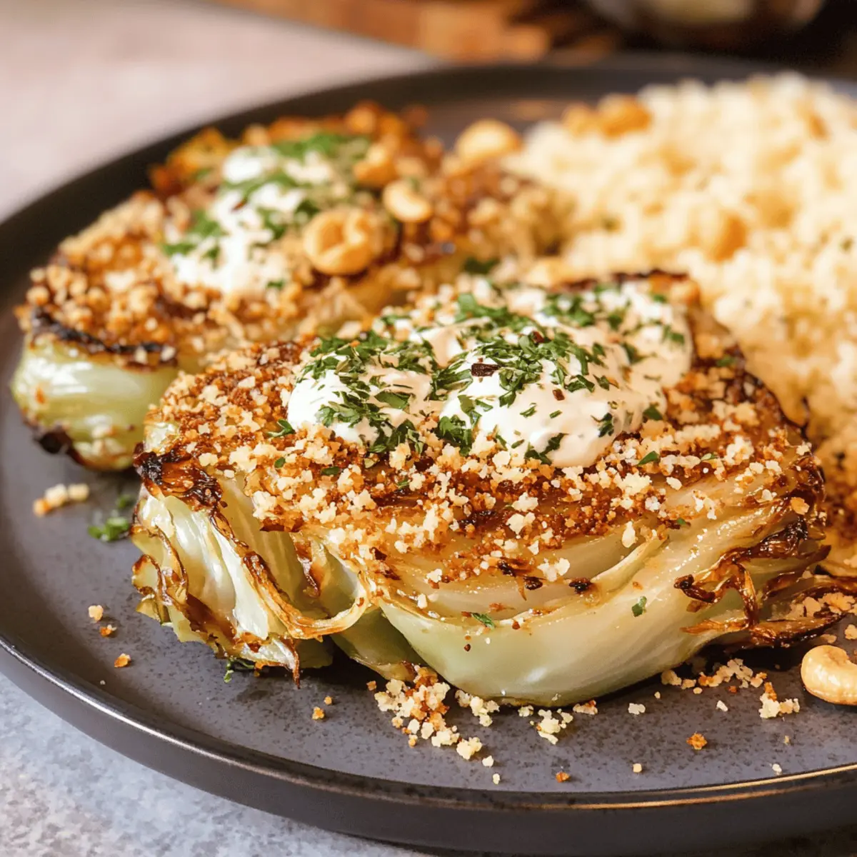 Als ich kürzlich in meinem Garten stand und die frischen Aromen des Frühlingsaufbruchs einatmete, erinnerte ich mich an die köstlichen Gerichte, die ich mit einfachem Gemüse zubereiten kann. Heute teile ich mit euch mein Rezept für würzige geröstete Kohlsteaks, die nicht nur schnell zubereitet sind, sondern auch unglaublich sättigend, perfekt für ein schnelles Abendessen unter der Woche. Durch die knusprige Panko-Mantel wird der ansonsten unscheinbare Kohl in eine kulinarische Offenbarung verwandelt, die man unbedingt probieren sollte! Diese proteinreiche und vegetarische Mahlzeit bringt nicht nur Abwechslung auf den Tisch, sondern auch das gute Gefühl, etwas Gesundes und Leckeres zu genießen. Seid ihr bereit, diese aufregende Geschmacksexplosion zu entdecken? Warum sind diese Kohlsteaks ein Hit? Einfachheit: Die Zubereitung dieser würzigen gerösteten Kohlsteaks erfordert nur wenige Schritte und einfache Zutaten. Perfekt für Kocherfahrung aller Niveaus! Kreativität: Lassen Sie Ihrer Kreativität freien Lauf, indem Sie verschiedene Gewürze hinzufügen oder die Dressing-Variationen ausprobieren. Eine tahinibasiertes Dressing kann dem Gericht eine ganz neue Note verleihen. Gesund und sättigend: Reich an Proteinen und low-calorie, sind diese Steaks nicht nur sättigend, sondern auch nährstoffreich – ideal für ein schnelles Abendessen unter der Woche. Familienfreundlich: Mit ihrem knusprigen Panko-Mantel und der cremigen Joghurtsauce sind sie ein Hit bei Groß und Klein. Ob als Hauptgericht oder als Beilage, diese Steaks kommen immer gut an! Vorbereitung: Perfekt für Meal Prep! Bereiten Sie die Kohlsteaks und das Dressing im Voraus vor und genießen Sie gesunde Hausmannskost an einem stressigen Wochentag. Abwechslung: Kombinieren Sie die Kohlsteaks mit verschiedenen Beilagen wie Couscous oder Quinoa, um den Nährstoffgehalt zu erhöhen und verschiedene Geschmäcker zu erkunden. Würzige geröstete Kohlsteaks Zutaten • Bereiten Sie sich darauf vor, Ihre Geschmacksknospen mit diesen leckeren und gesunden Zutaten zu verwöhnen! Für die Kohlsteaks Kohl – die Hauptzutat, die für eine wunderbare Textur sorgt; verwenden Sie etwa 1,75 lbs für die beste Konsistenz. Panko-Brösel – sorgt für einen herrlichen Crunch; reguläre Semmelbrösel sind auch möglich, jedoch ist Panko leichter. Paprikapulver – bringt Tiefe und einen subtilen rauchigen Geschmack; verwenden Sie geräuchertes Paprikapulver für intensivere Aromen. Nährhefe – verleiht einen würzigen, umamiartigen Geschmack; kann durch Parmesan ersetzt werden, wenn kein Vegetarier. Knoblauchpulver – verstärkt das Aroma; frischer, gehackter Knoblauch kann in der gleichen Menge verwendet werden. Salz und Pfeffer – bieten die grundlegende Würze; nach Geschmack anpassen. Olivenöl – hilft beim Rösten und trägt zur Knusprigkeit bei; kann auch durch Avocadoöl ersetzt werden. Gemüsebrühe – sorgt für Feuchtigkeit und Geschmack; für eine nicht-vegetarische Variante kann Hühnerbrühe verwendet werden. Für das Dressing Fettarmer griechischer Joghurt – sorgt für Cremigkeit und Protein im Dressing; kann durch pflanzlichen Joghurt ersetzt werden. Zwiebelpulver – bringt süße Aromen ins Dressing; frische, geriebene Zwiebel ist ebenfalls möglich, aber achte auf die Menge. Getrockneter Oregano – sorgt für eine herzhafte Note; frischer Oregano kann ebenfalls verwendet werden, aber die Menge anpassen. Zitronensaft – sorgt für Frische und Säure; kann durch Limettensaft ersetzt werden, wenn gewünscht. Dijon-Senf – fügt eine würzige Note hinzu; Gelber Senf kann auch verwendet werden. Honig – süßt das Dressing; Agavendicksaft oder Ahornsirup sind vegane Alternativen. Für die Beilage Couscous – dient als sättigende Beilage; Quinoa kann eine noch gesündere Option sein. Gehackte Cashewkerne – für einen knusprigen Topping und gesunde Fette; können auch durch Mandeln oder Walnüsse ersetzt werden. Diese würzigen gerösteten Kohlsteaks sind eine perfekte Wahl für das Abendessen unter der Woche, bringen Abwechslung auf den Tisch und sind dabei einfach zuzubereiten! Step-by-Step Instructions für Würzige geröstete Kohlsteaks Step 1: Ofen vorheizen Heizen Sie den Ofen auf 220 °C vor. Diese hohe Temperatur sorgt dafür, dass die würzigen gerösteten Kohlsteaks knusprig werden. Während der Ofen vorheizt, können Sie mit der Zubereitung der Kohlsteaks beginnen, sodass Sie alles effizient im Griff haben. Step 2: Kohl vorbereiten Entfernen Sie den Strunk des Kohls und schneiden Sie ihn in vier gleichmäßige Steaks. Achten Sie darauf, dass die Steaks möglichst gleich dick sind, damit sie gleichmäßig garen. Legen Sie die Kohlsteaks auf ein mit Backpapier ausgelegtes Backblech, bereit für die Marinade. Step 3: Marinade anrühren In einer Schüssel kombinieren Sie Paprikapulver, Nährhefe, Knoblauchpulver, Salz, Pfeffer, Olivenöl und Gemüsebrühe. Vermischen Sie alles gut, bis eine glatte Marinade entsteht. Diese würzige Mischung wird den Kohlsteaks zusätzlichen Geschmack verleihen und dient als Grundlage für die Röstaromen. Step 4: Kohlsteaks marinieren Bestreichen Sie die Kohlsteaks großzügig mit der Marinade, sodass jede Seite gut bedeckt ist. Dies sorgt dafür, dass die Gewürze beim Rösten gut durchdringen. Achten Sie darauf, auch die Ränder zu marinieren, um ein rundum köstliches Ergebnis zu erzielen. Step 5: Rösten Schieben Sie das Blech mit den marinierten Kohlsteaks in den vorgeheizten Ofen und rösten Sie sie für 25–30 Minuten. Die Steaks sollten goldbraun und zart werden, jedoch nicht umgedreht werden, um die knusprige Textur zu wahren. Halten Sie nach 20 Minuten Ausschau nach einer schönen goldbraunen Farbe. Step 6: Panko hinzufügen Nach dem ersten Rösten nehmen Sie die Steaks aus dem Ofen und bestreuen Sie jede Steakhälfte gleichmäßig mit Panko-Bröseln. Schieben Sie die Steaks zurück in den Ofen und rösten Sie sie weitere 5–10 Minuten, bis die Panko-Sc