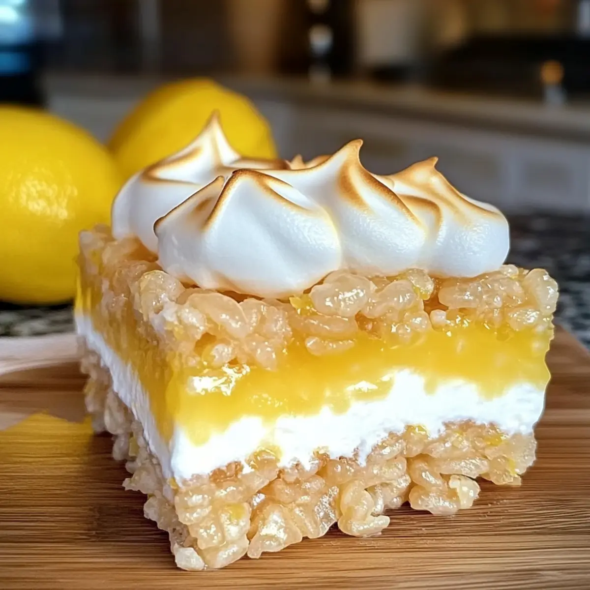 Köstliche Textur: Die knusprige Reis-Krispie-Schicht, die cremige Zitronenfüllung und die luftige Baiserschicht bieten ein genussvolles Geschmackserlebnis.